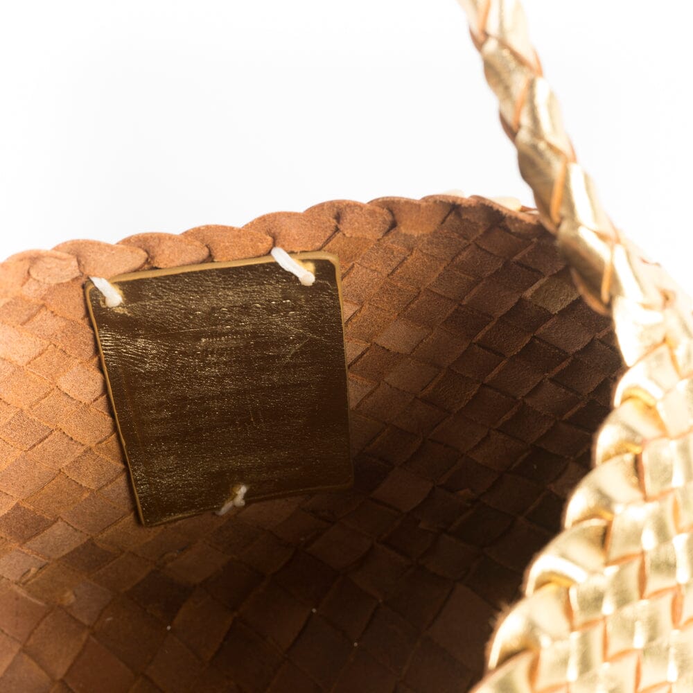 Borsa a spalla Rosanna di Dragon Diffusion dalla forma baguette in pelle con intreccio fatto a mano, tinta con metodi naturali nel colore oro. Singolo manico intrecciato da portare a spalla o a mano in nuance.