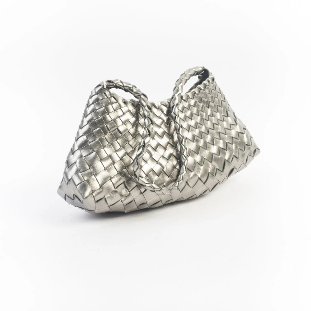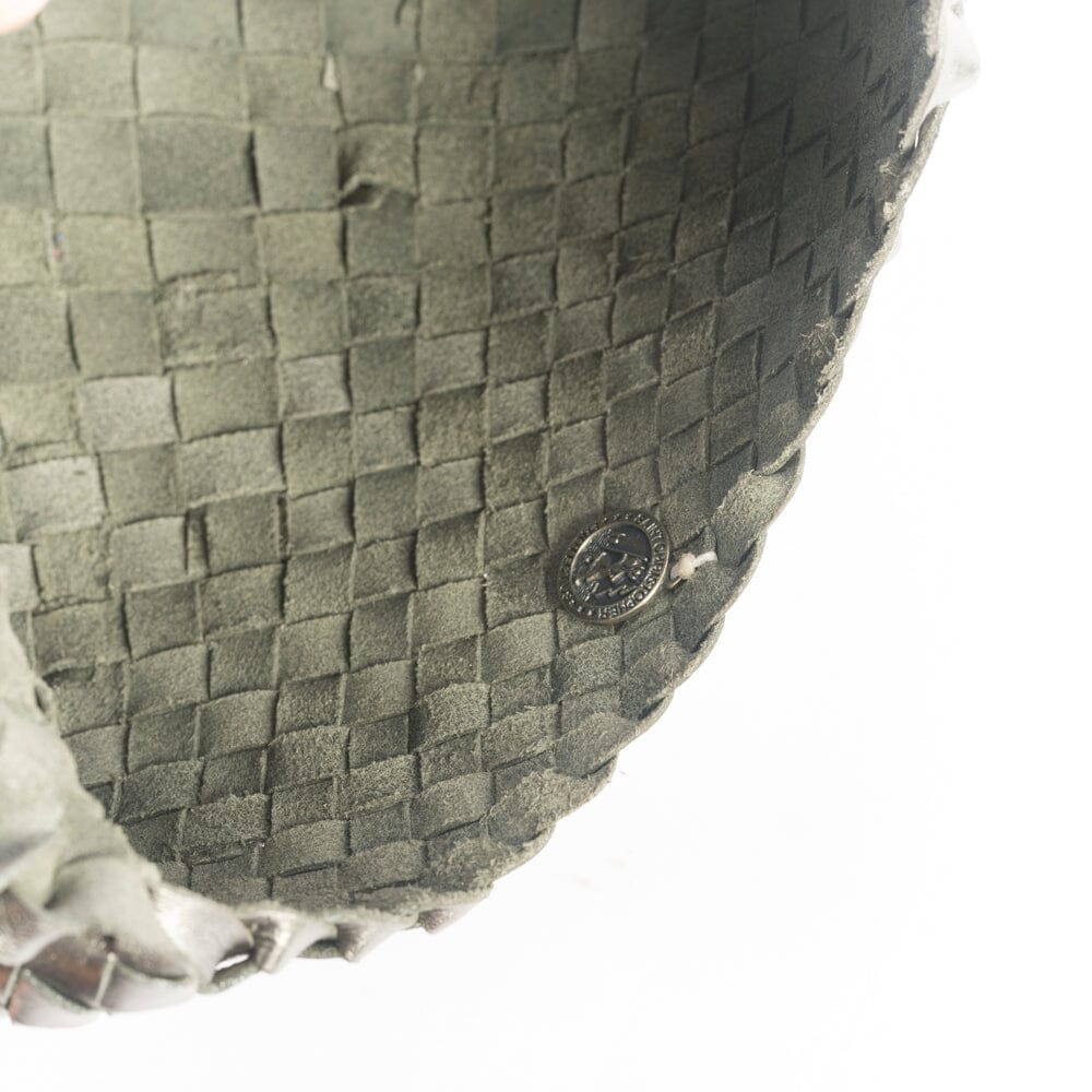 Borsa a spalla Rosanna di Dragon Diffusion dalla forma baguette in pelle con intreccio fatto a mano, tinta con metodi naturali nel colore piombo. Singolo manico intrecciato da portare a spalla o a mano in nuance.