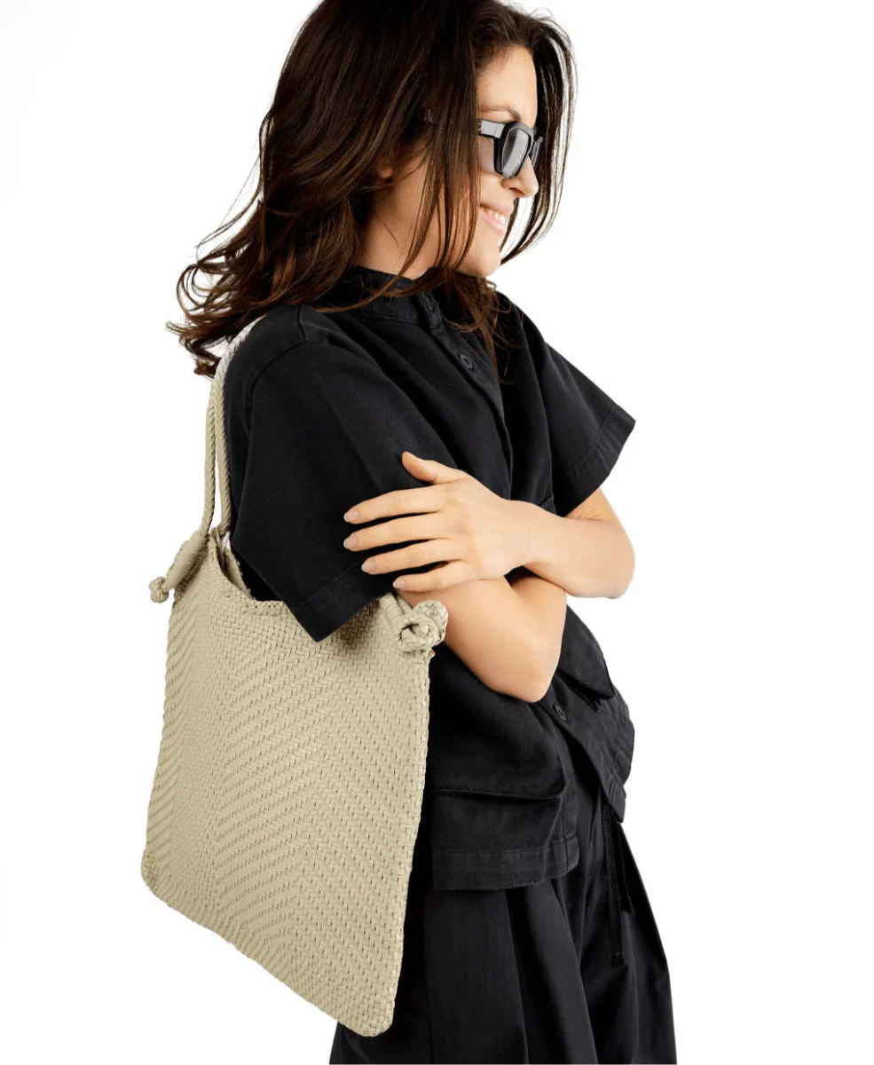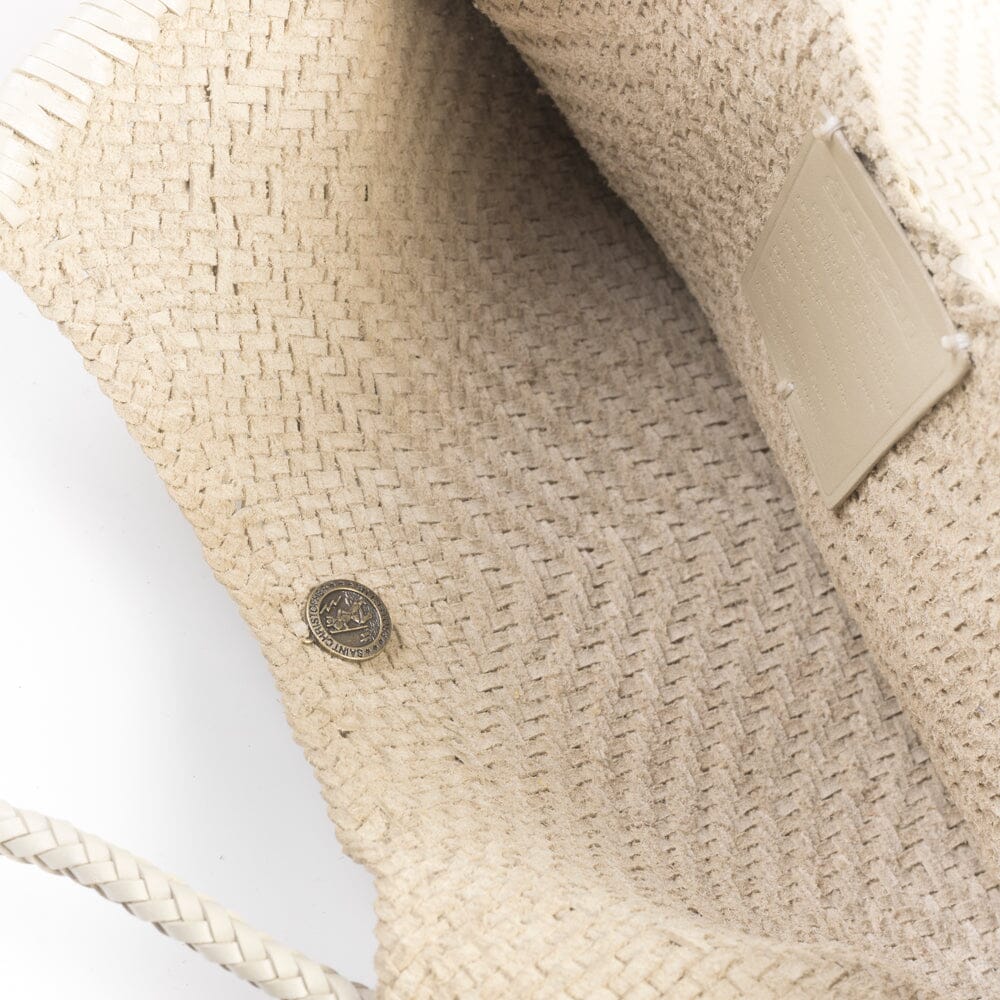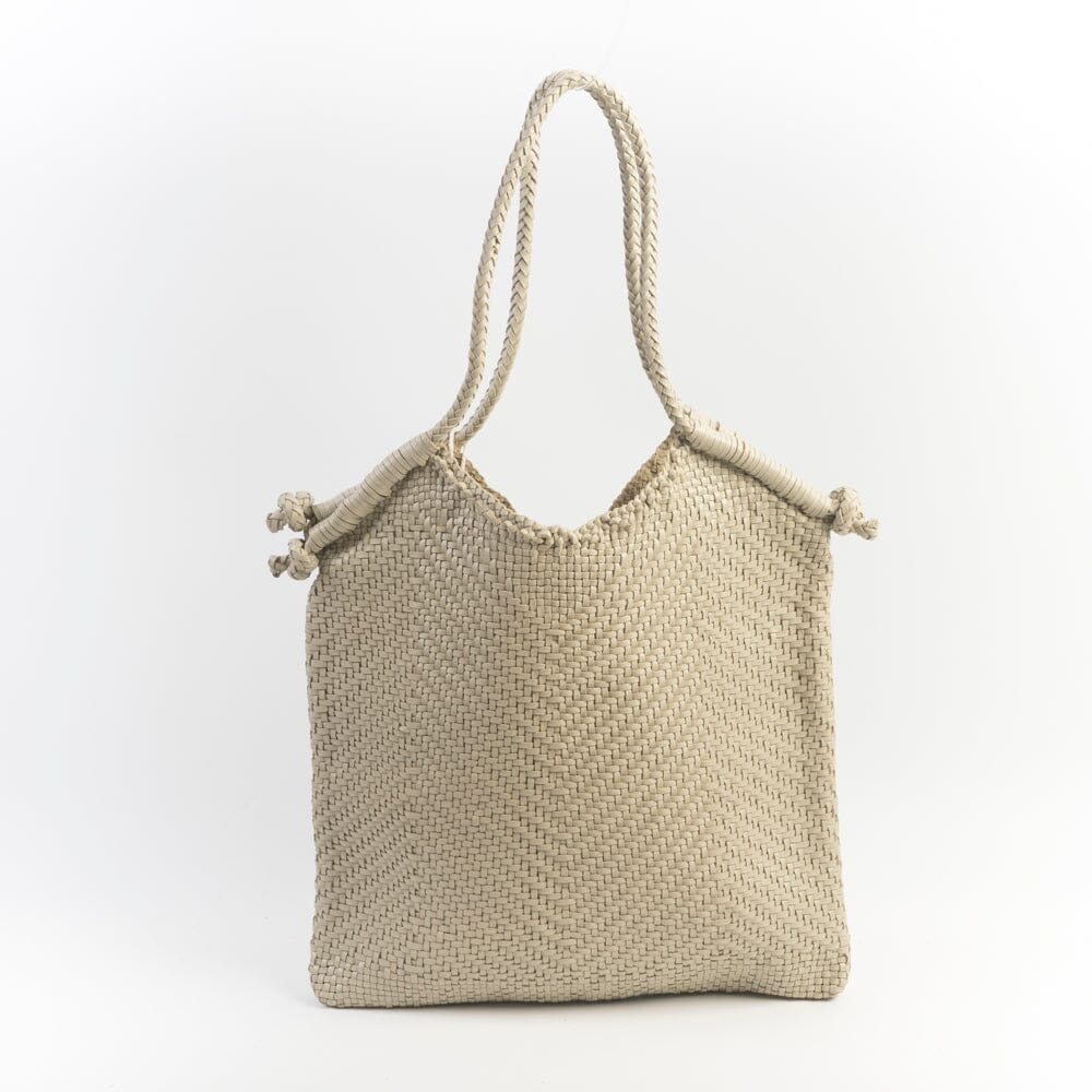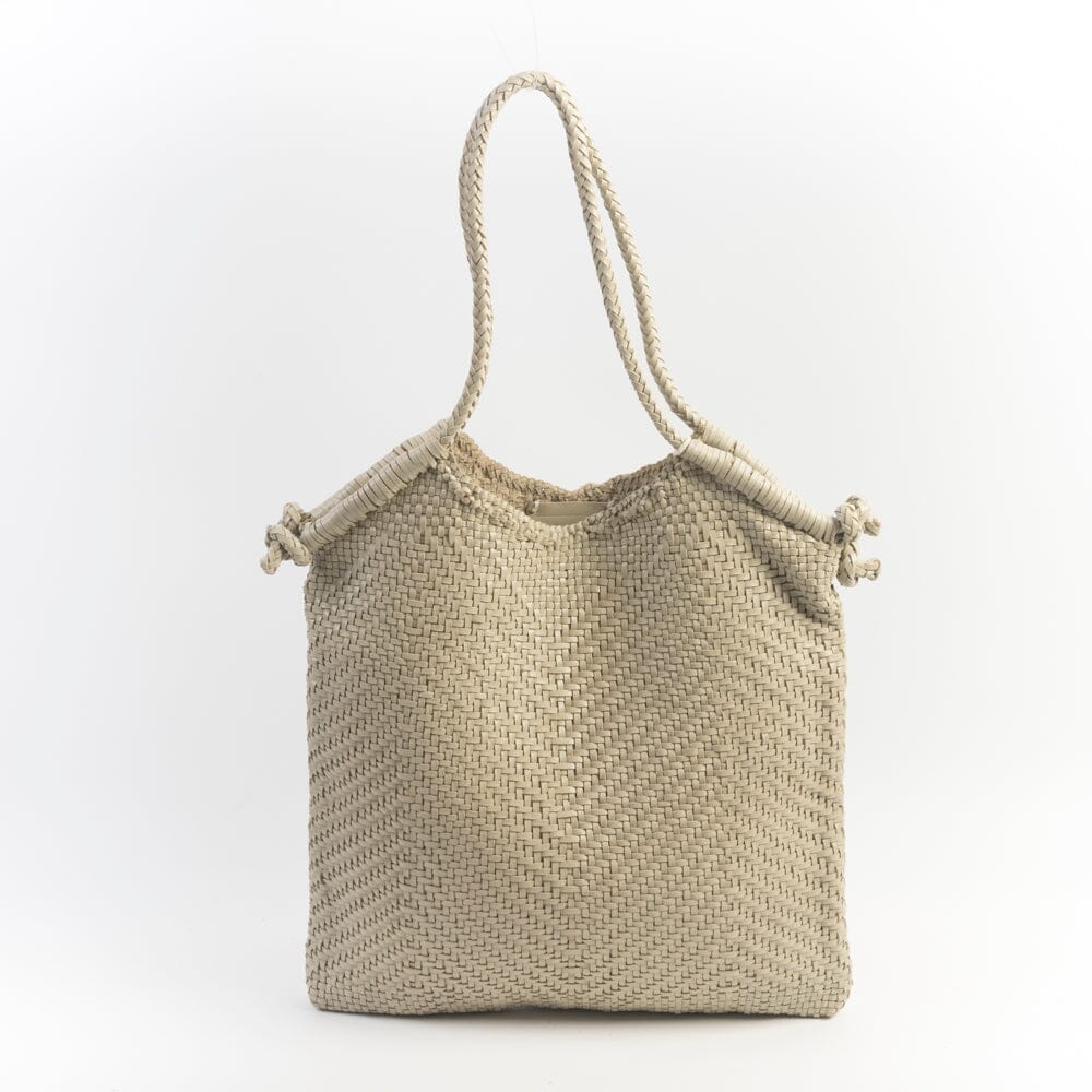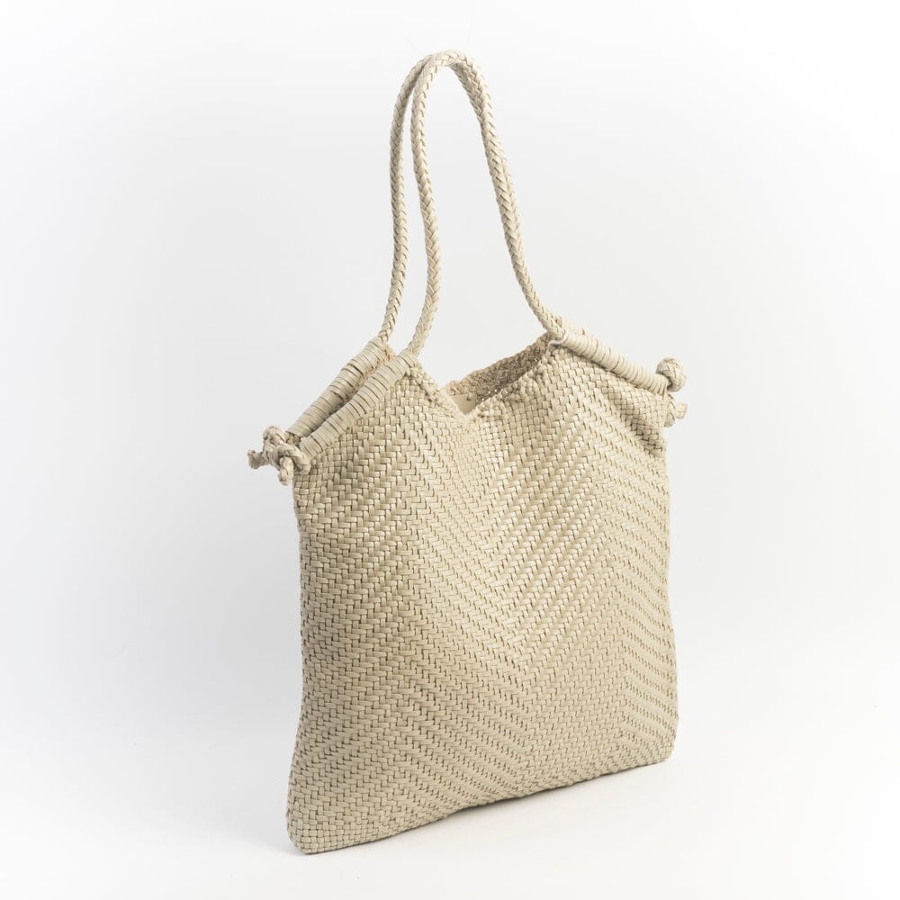 Originale borsa Minga di Dragon Diffusion in pelle intrecciata a mano da portare a spalla tinta con metodi naturali nel colore avorio. Interno sfoderato. Doppi manici intrecciati con nodo fatto a mano sui quattro lati della borsa.