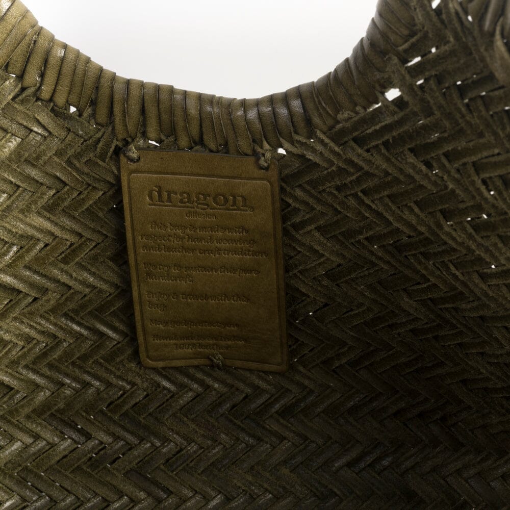 Iconica borsa Nantucket di Dragon Diffusion in pelle intrecciata a mano e tinta con metodi naturali nel colore kaki. Doppi manici ampi per utilizzo a mano o a spalla. Interno sfoderato.