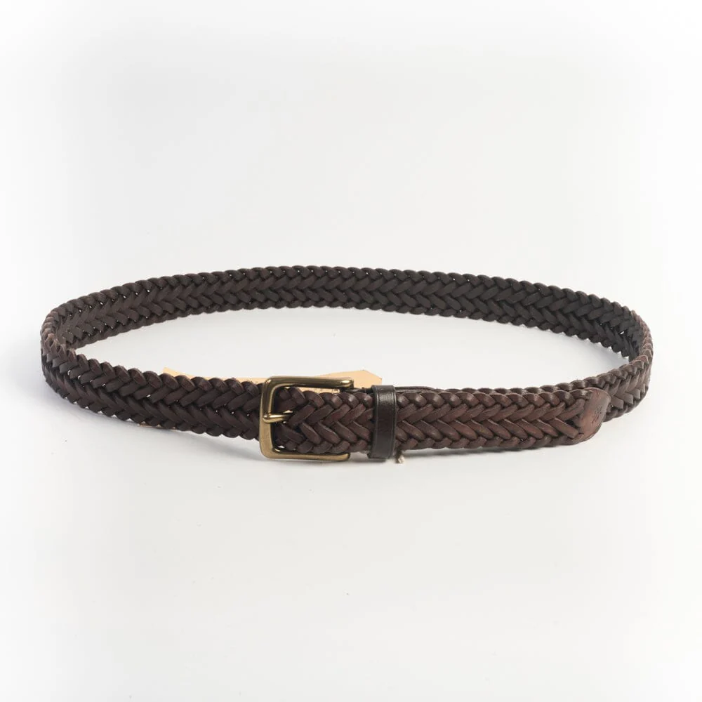Cintura donna di Dragon Diffusion realizzata in pelle intrecciata a mano tinta con metodi naturali di colore testa di moro. Fibbia squadrata di colore brunito con passante singolo.