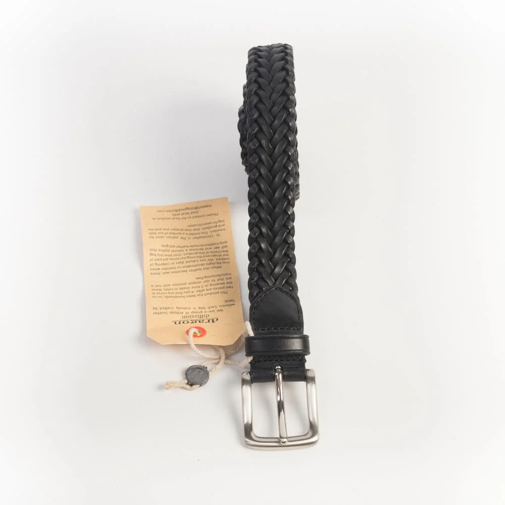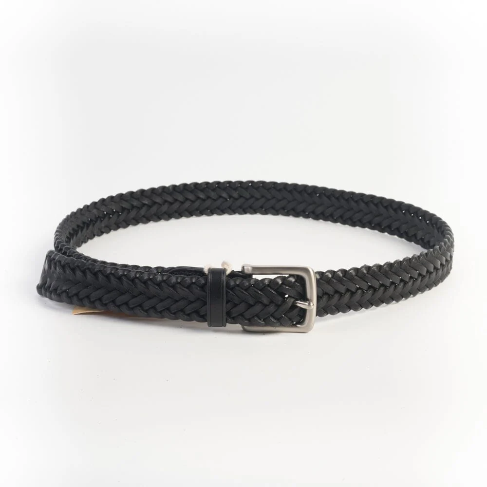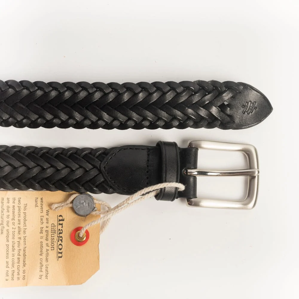 Cintura donna di Dragon Diffusion realizzata in pelle intrecciata a mano tinta con metodi naturali di colore nero. Fibbia squadrata di colore argento con passante singolo.