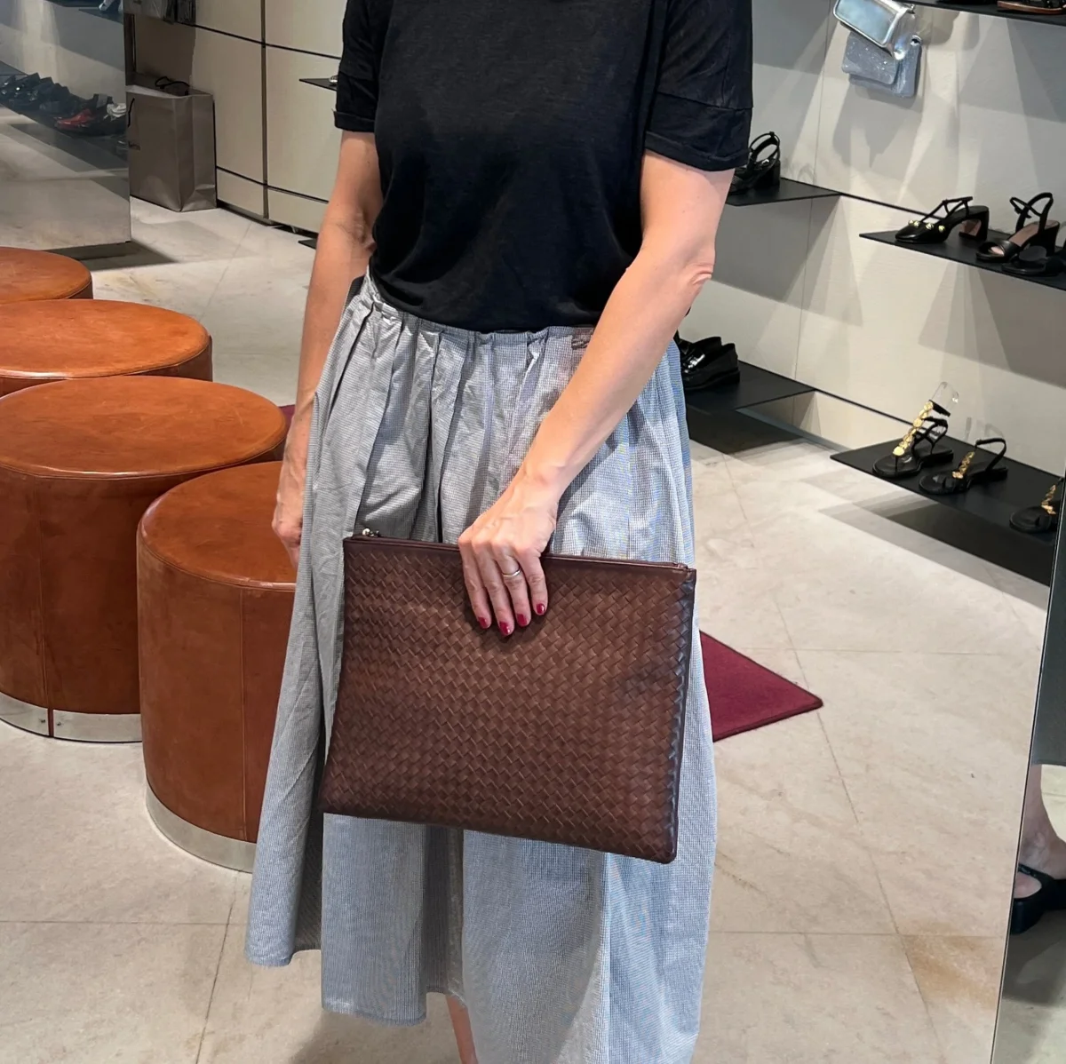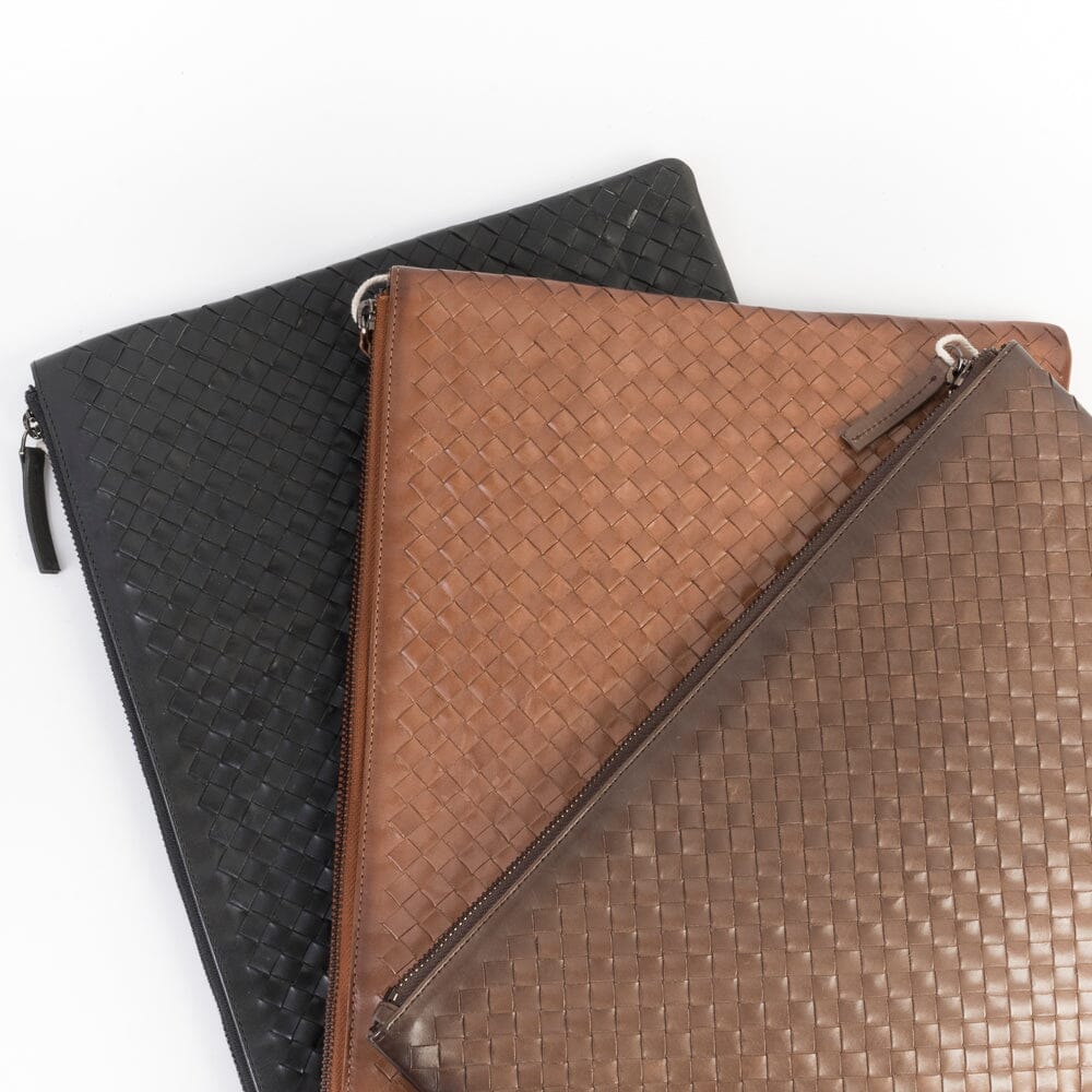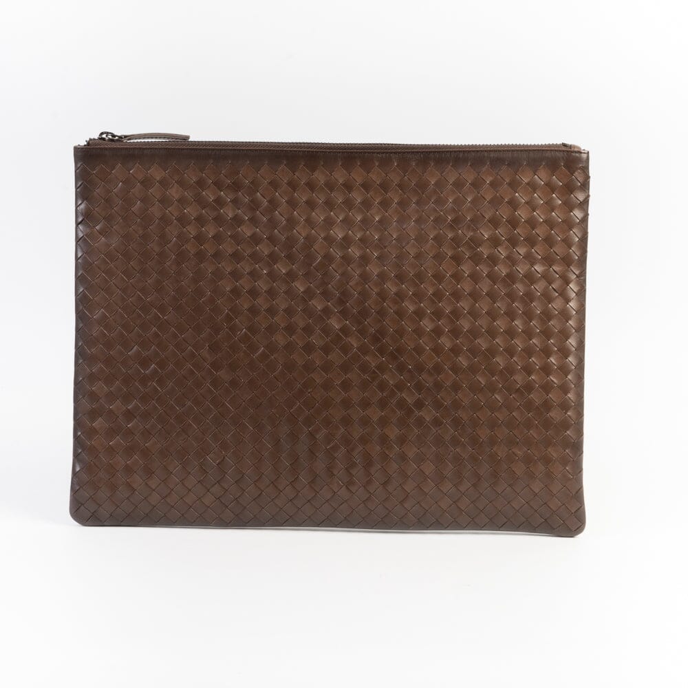 Maxi pochette di Dragon intrecciata da portare a mano, tinta con metodi naturali nel colore testa di moro. Interno foderato in tessuto. Chiusura con zip centrale. All’interno di ogni borsa è presente una piccola medaglietta che raffigura San Cristoforo, il protettore dei viaggiatori. Esso simboleggia la buona sorte e la fede.