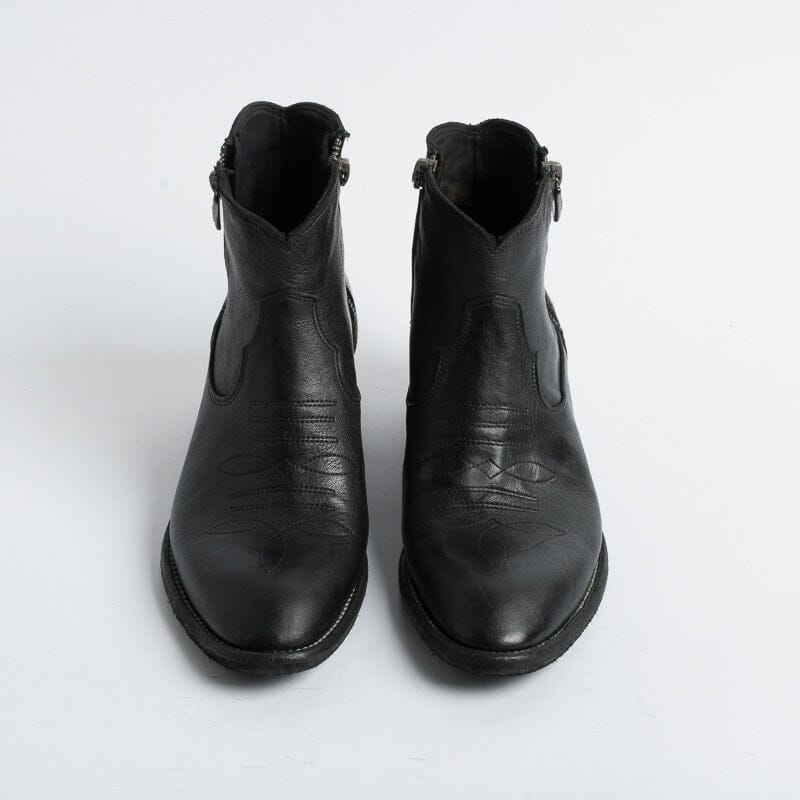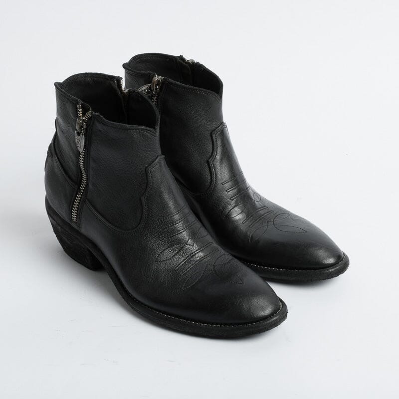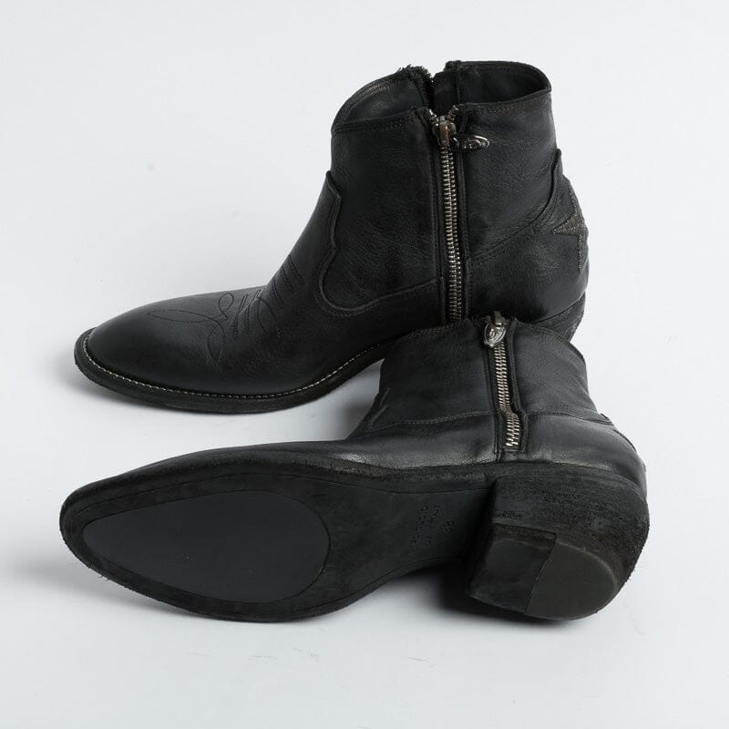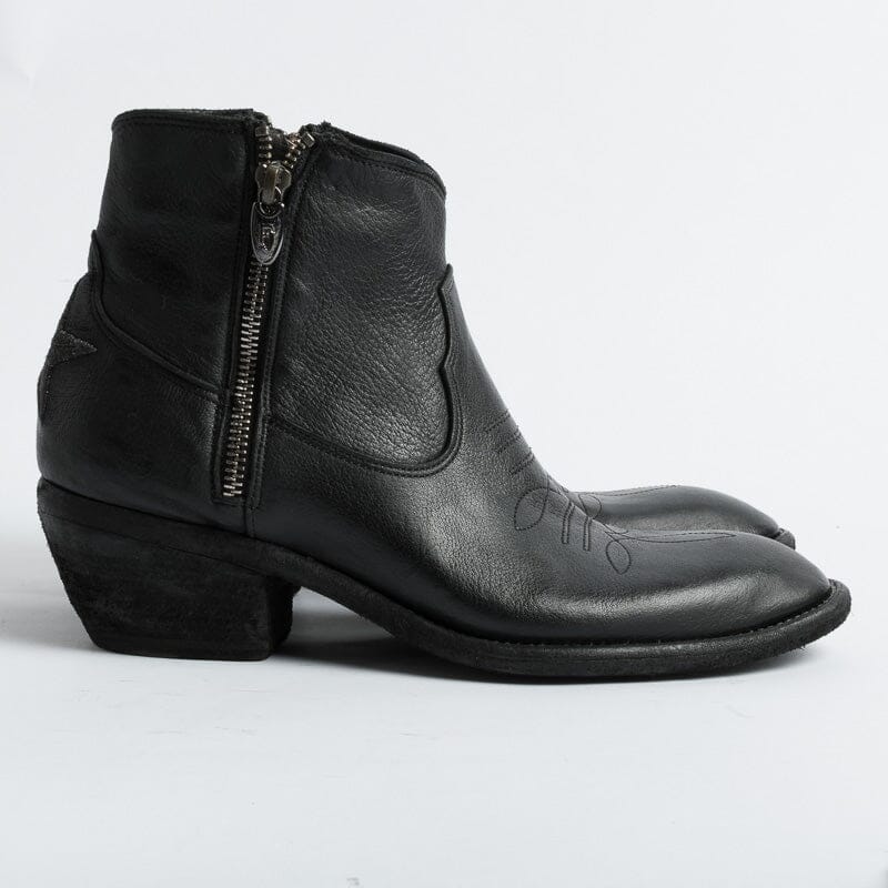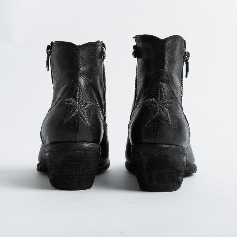 Stivaletto di Fauzian Jaunesse, realizzato in pelle di bufalo di colore nero. Punta affusolata, chiusura con doppia zip, sottopiede in pelle, tacco in legno ad effetto vintage di 5 cm. Decorazione con impunture lungo tutta la calzatura. Decorazione con stella realizzata con filo laminato acciaio sulla parte posteriore del texano. Suola in cuoio con inserti in gomma.