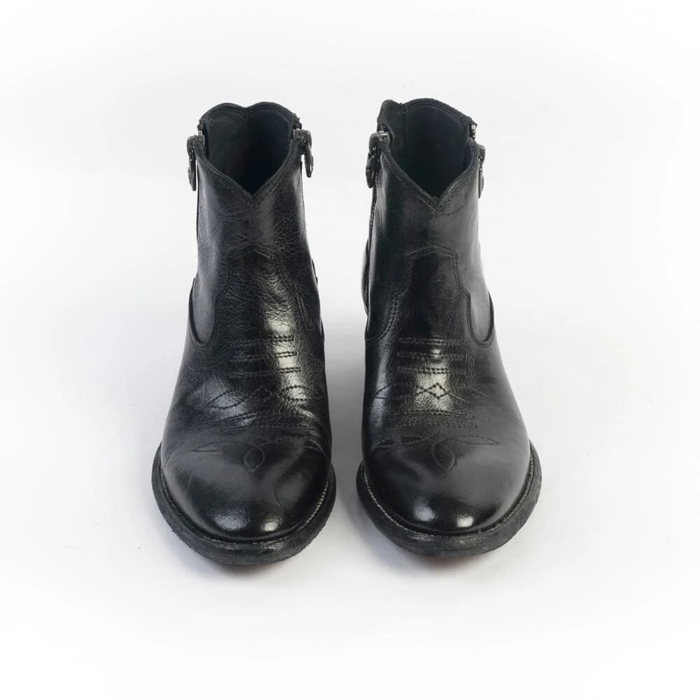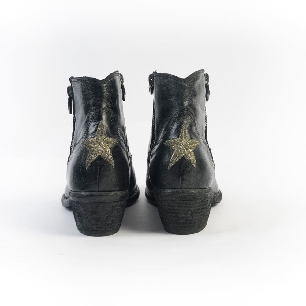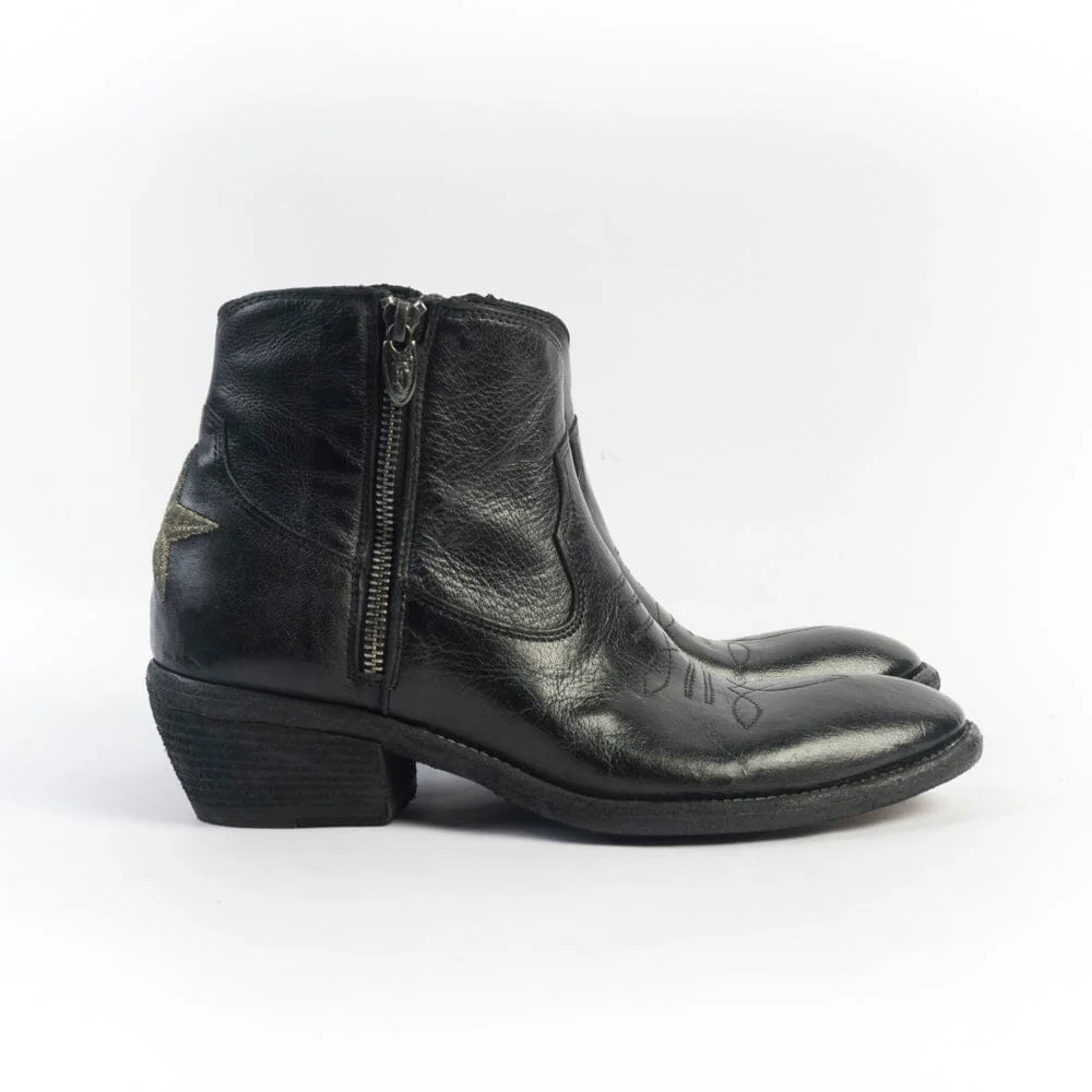 Stivaletto di Fauzian Jaunesse, realizzato in pelle di bufalo di colore nero. Punta affusolata, chiusura con doppia zip, sottopiede in pelle, tacco in legno ad effetto vintage di 5 cm. Decorazione con impunture lungo tutta la calzatura. Decorazione con stella realizzata con filo laminato di colore oro sulla parte posteriore del texano. Suola in cuoio con inserti in gomma.