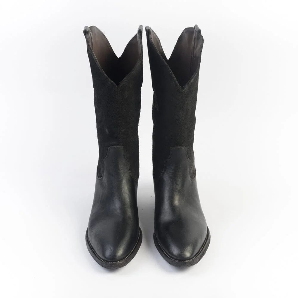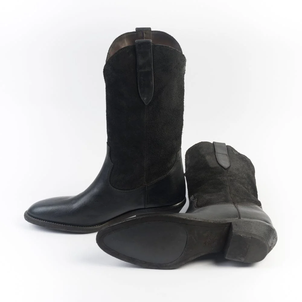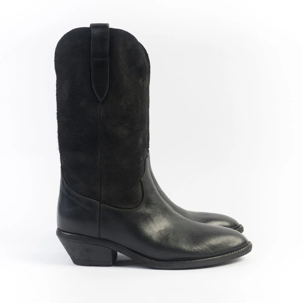Stivale di Fauzian Jaunesse, realizzato in pelle e camoscio di colore ebano. Punta affusolata, sottopiede in pelle, tacco con trattamento vintage di 4 cm. Suola in cuoio con inserti in gomma. Altezza gambale cm 29 riferita al numero 37.