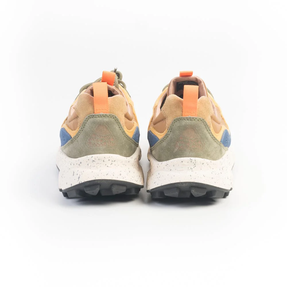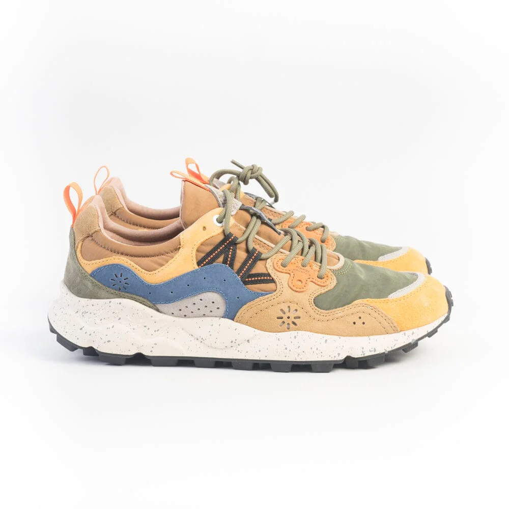 Sneakers modello Yamano di Flower Mountain, unisex, realizzate in tessuto tecnico di colore verde militare e cammello con inserti di camoscio di colore cachi, beige, grigio, arancione, verde e blu. Dettagli fascette di colore nero. Lacci in cotone di colore verde. Soletta interna in sughero amovibile. Maxi suola di colore panna antiscivolo, per un totale comfort della calzata.
