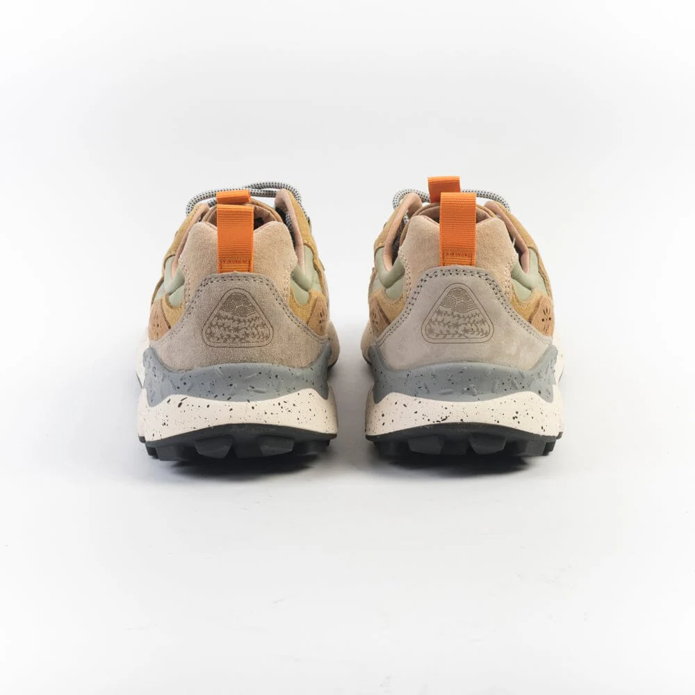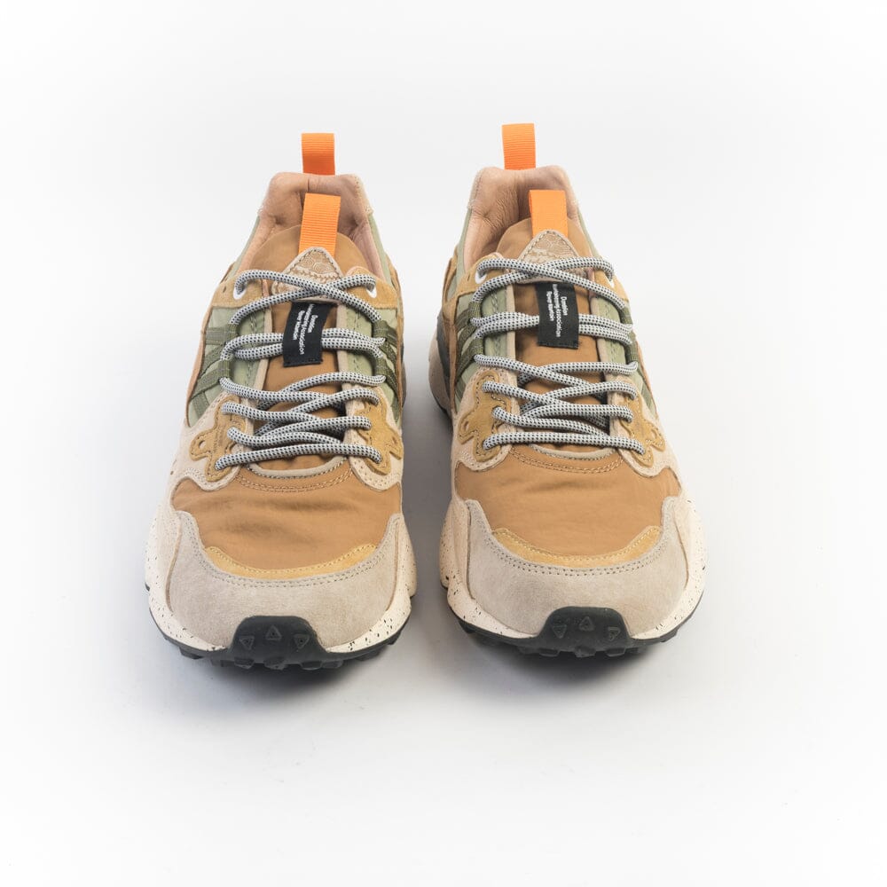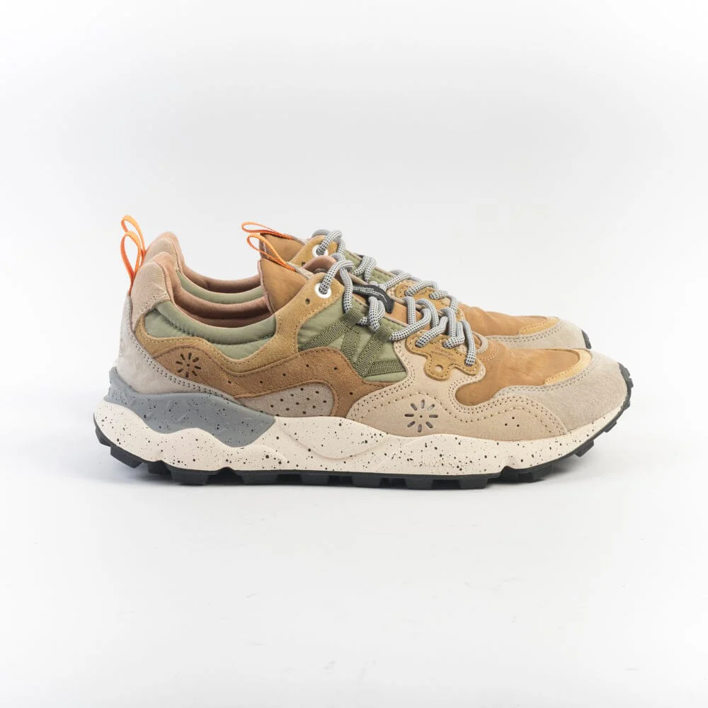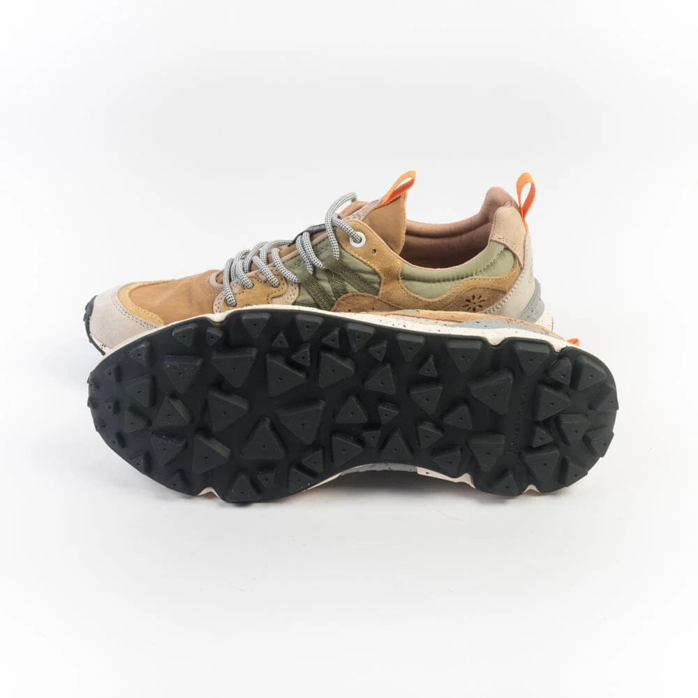 Originali sneakers Yamano3 di Flower Mountain, realizzate in tessuto tecnico di colore cuoio e verde salvia con dettagli in camoscio di colore beige, tortora, cuoio e giallo senape. Lacci di colore grigio melange. Soletta interna in sughero amovibile. Maxi suola in gomma beige e grigio antiscivolo con battistrada dentellato per un totale comfort della calzata.