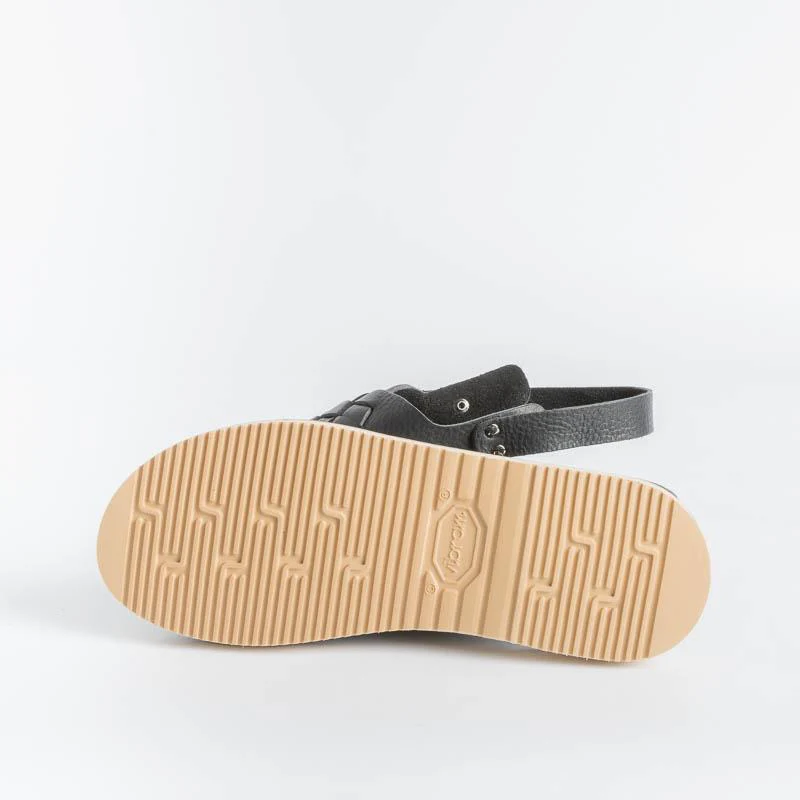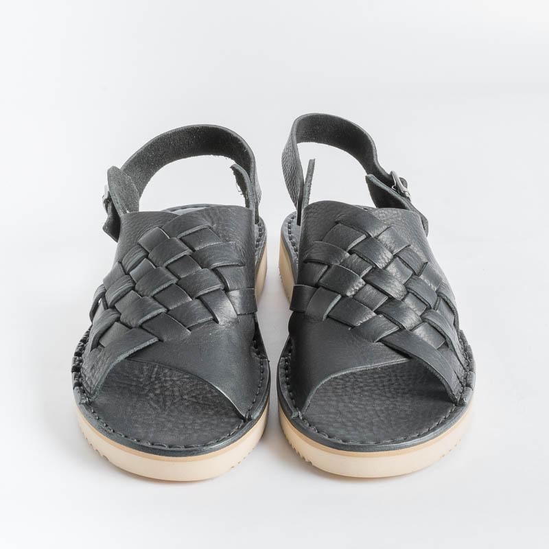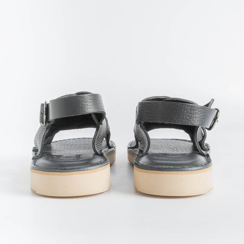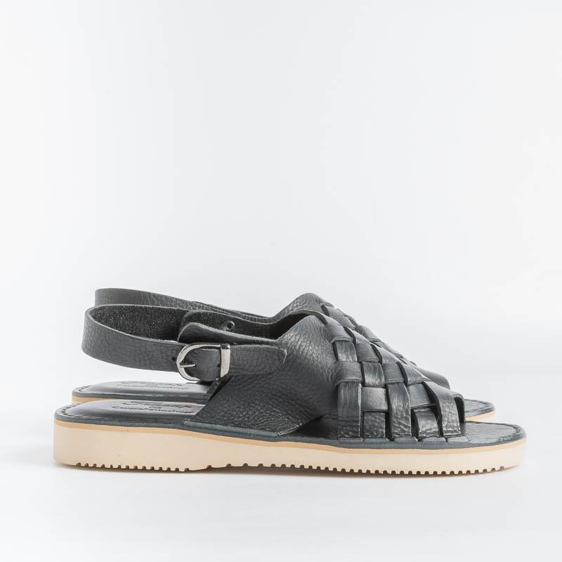 Sandalo intrecciato di Fracap, realizzato in pelle martellata di colore nero. Chiusura con fibbia laterale e cinturino sul tallone in metallo, sottopiede in pelle, suola Vibram di colore latte macchiato.