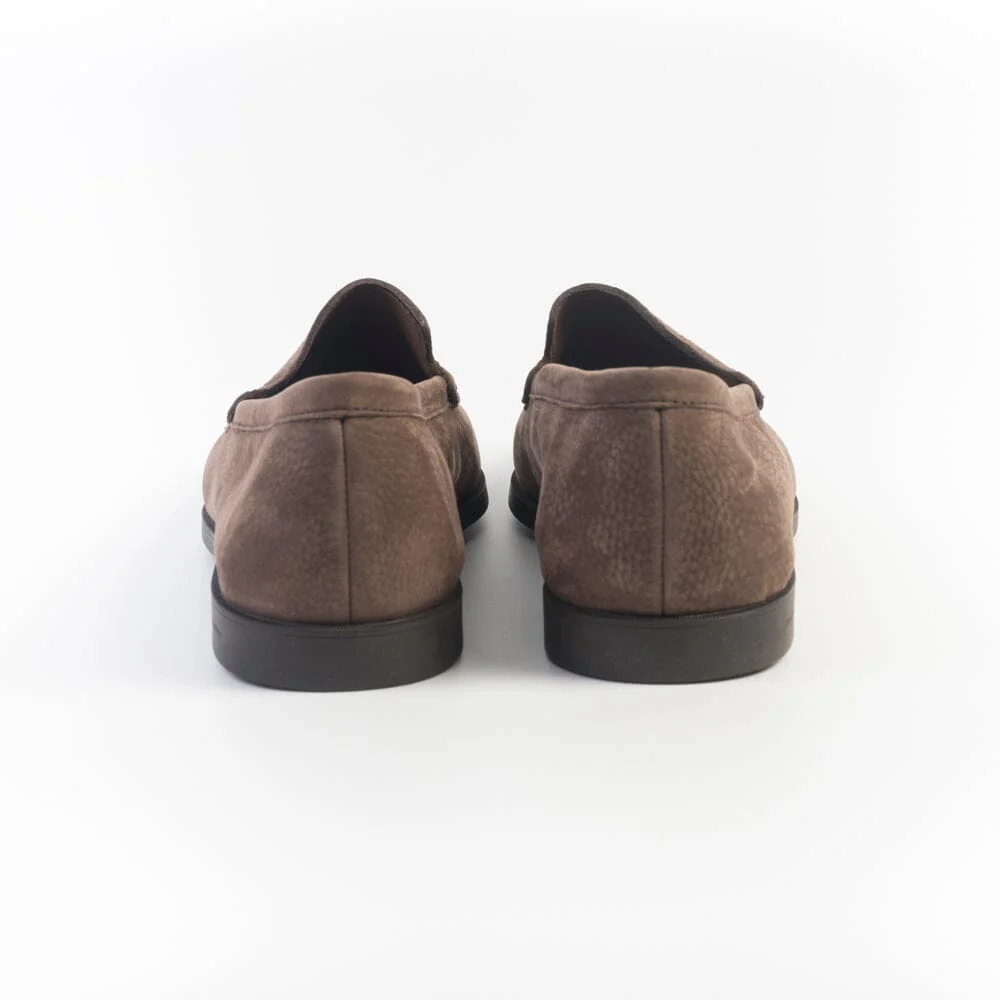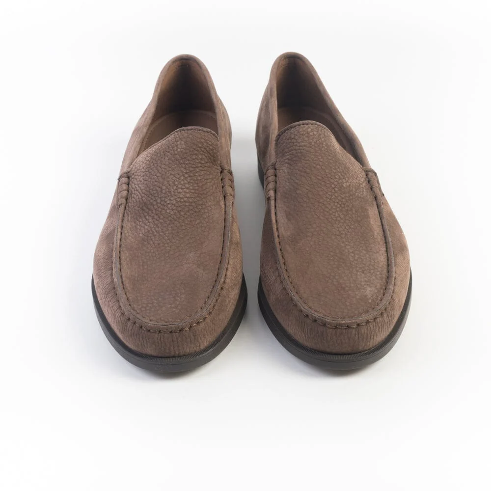 Mocassino di Fratelli Rossetti, realizzato in morbido nabuk ad effetto martellato di colore testa di moro. Interno sfoderato, soletta interna in pelle removibile.