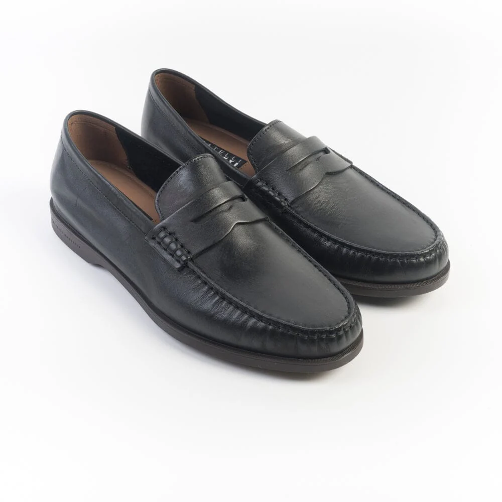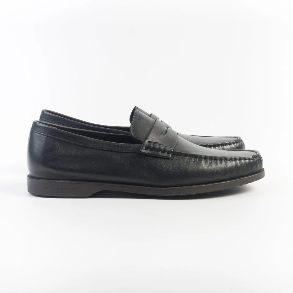 Mocassino con mascherina di Fratelli Rossetti, realizzato, a mano, in morbidissima pelle di colore nero. Interno sfoderato e sottopiede in pelle, suola in gomma. Soletto interno estraibile.