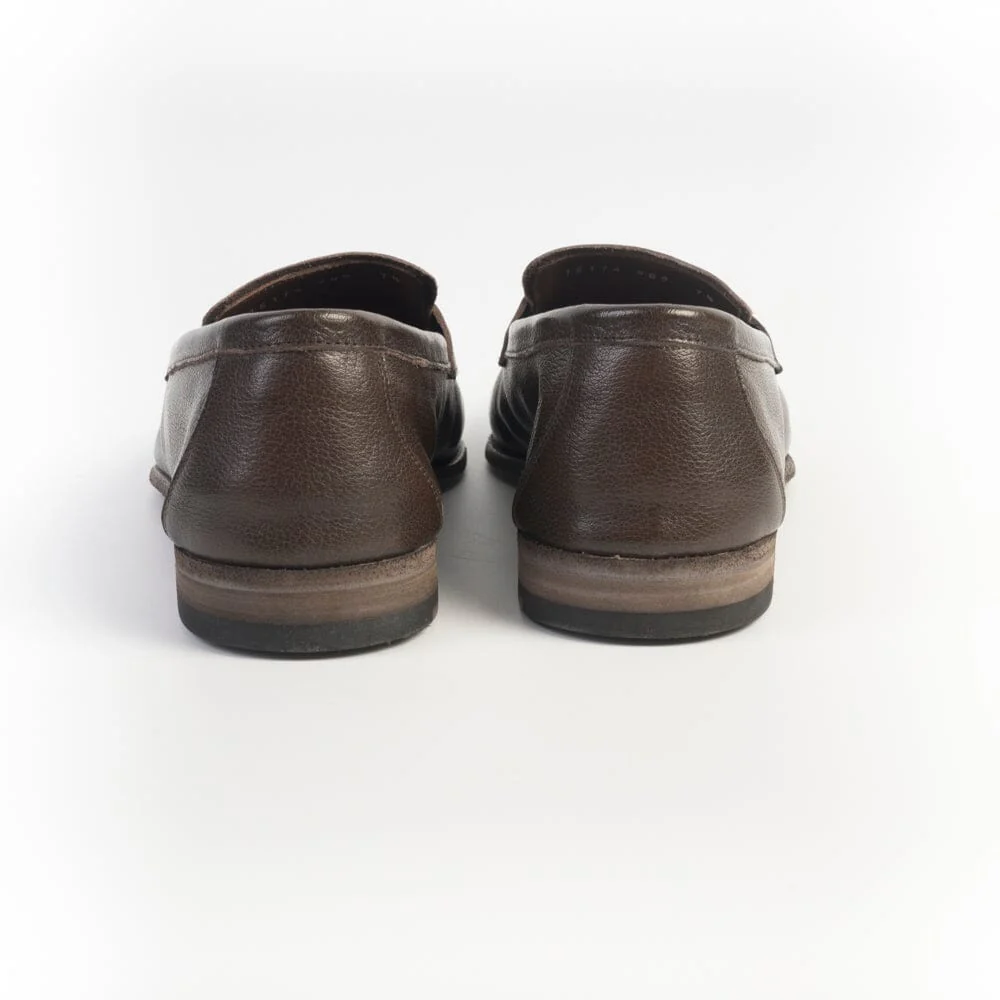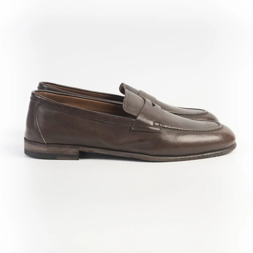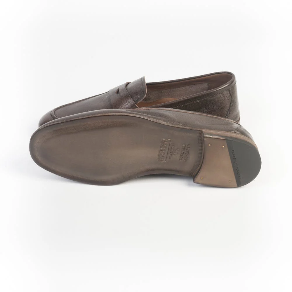 Mocassino con mascherina di Fratelli Rossetti, realizzato a mano, in morbidissima pelle di colore testa di moro dalla punta affusolata con cucitura su tomaia. Interno foderato in punta e sfoderato ai lati, sottopiede in pelle. Suola in cuoio flessibile e confortevole grazie alla costruzione goodyear reversed. Tacco cuoio e gomma.