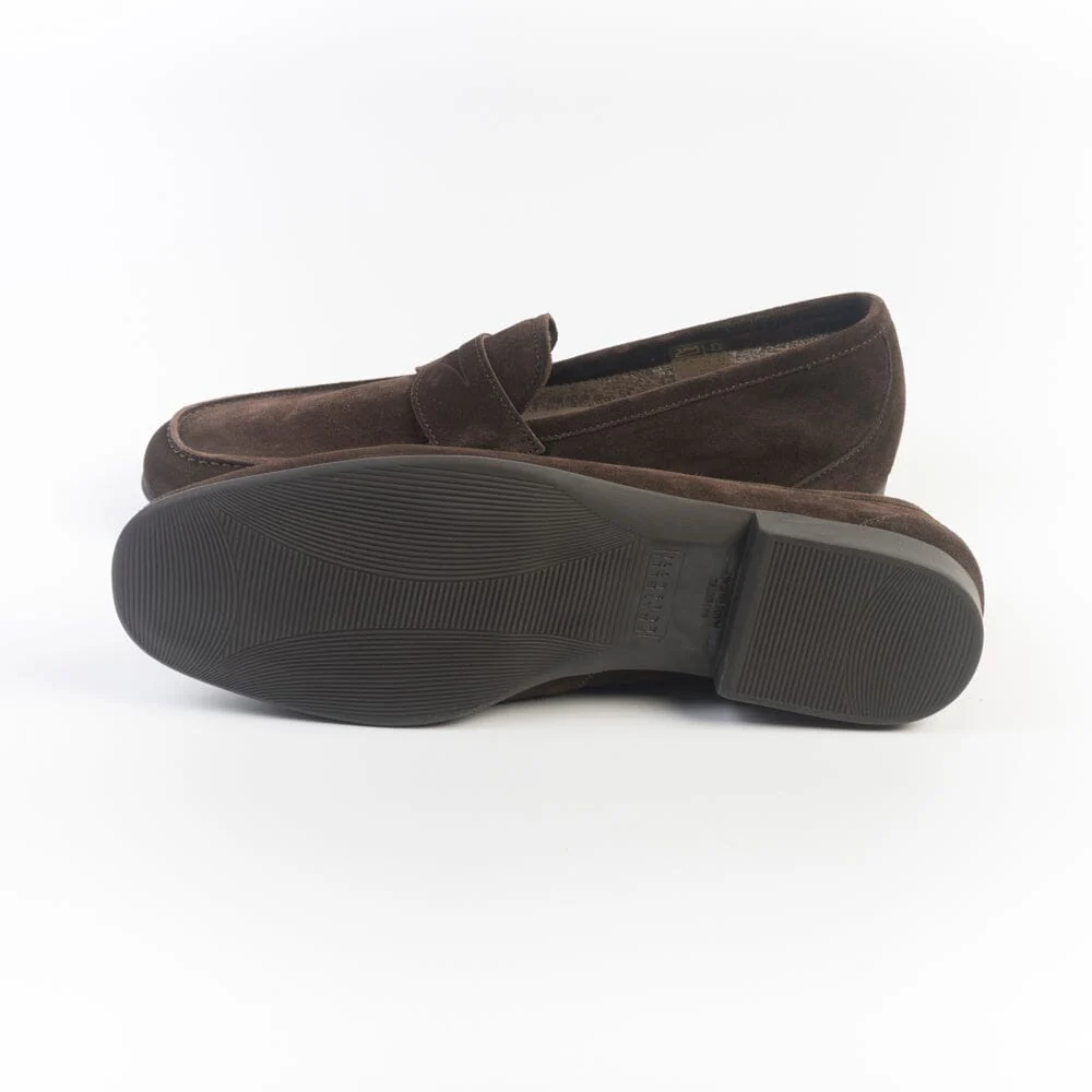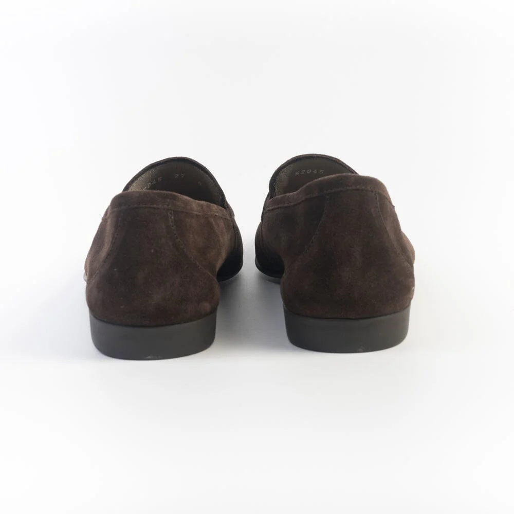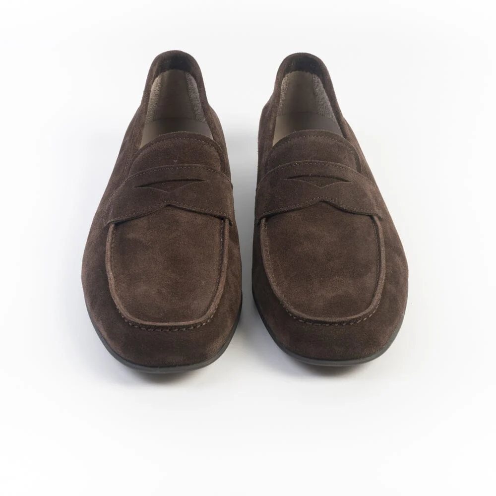 Iconico mocassino York, con mascherina, di Fratelli Rossetti, realizzato in morbido camoscio di colore testa di moro. Interno foderato in morbida spugna di cotone.