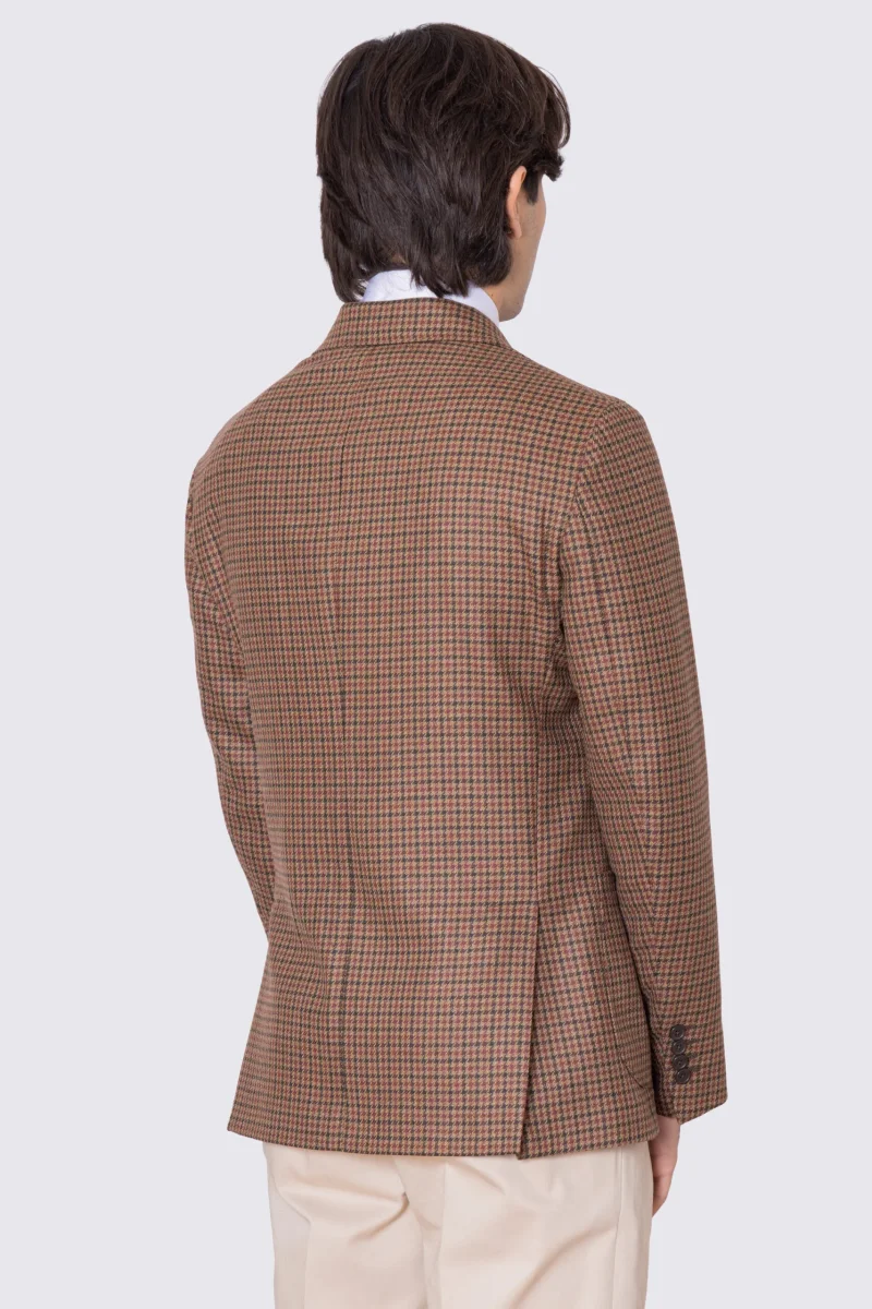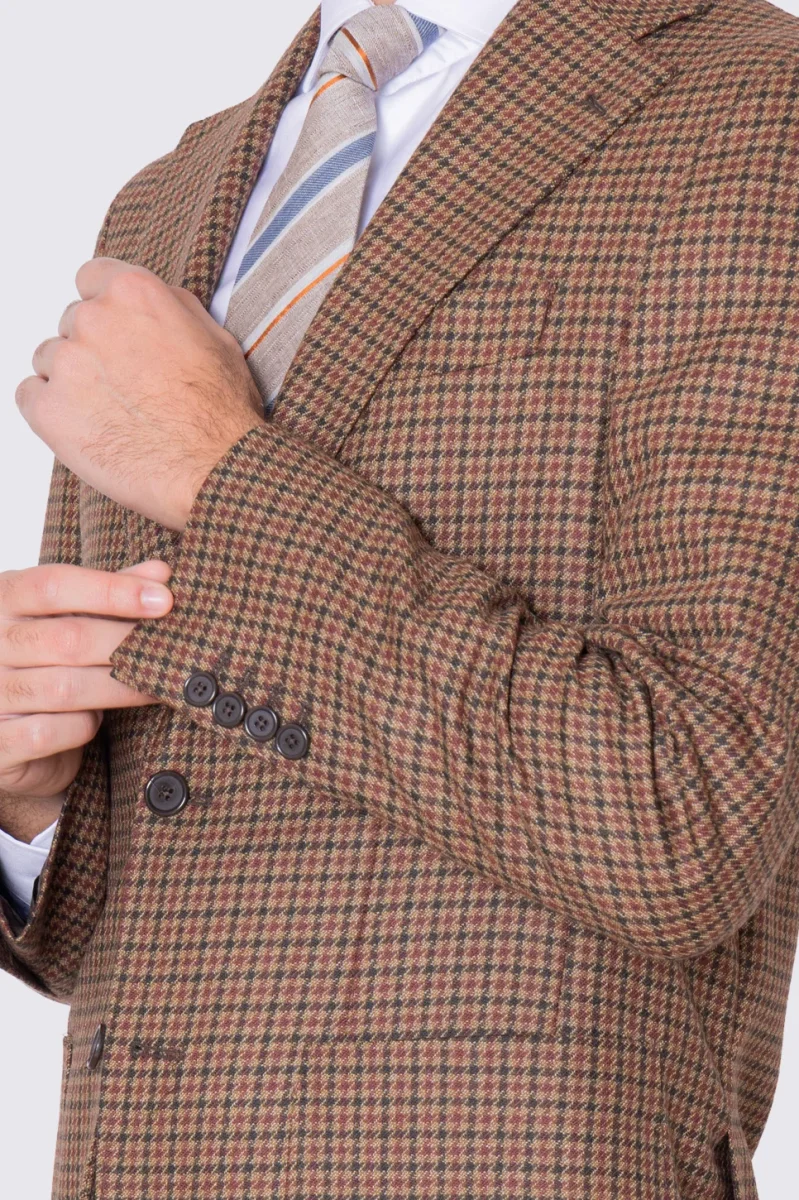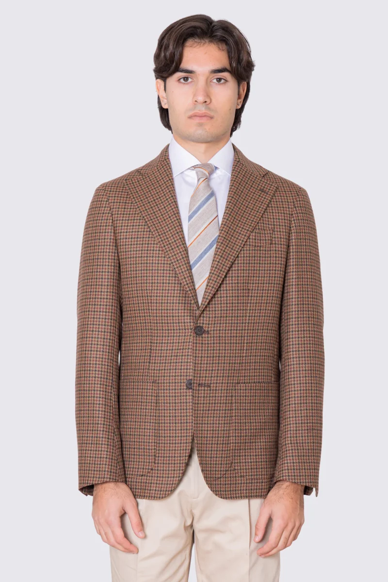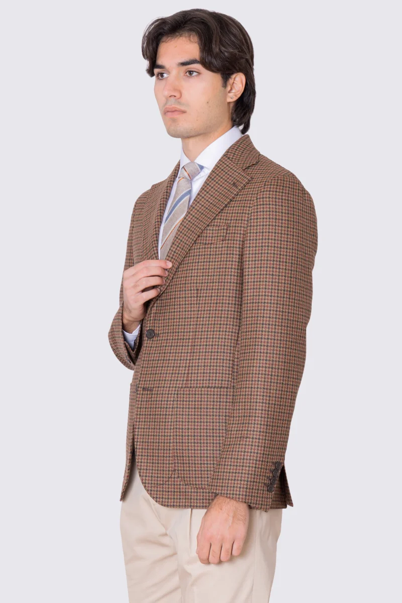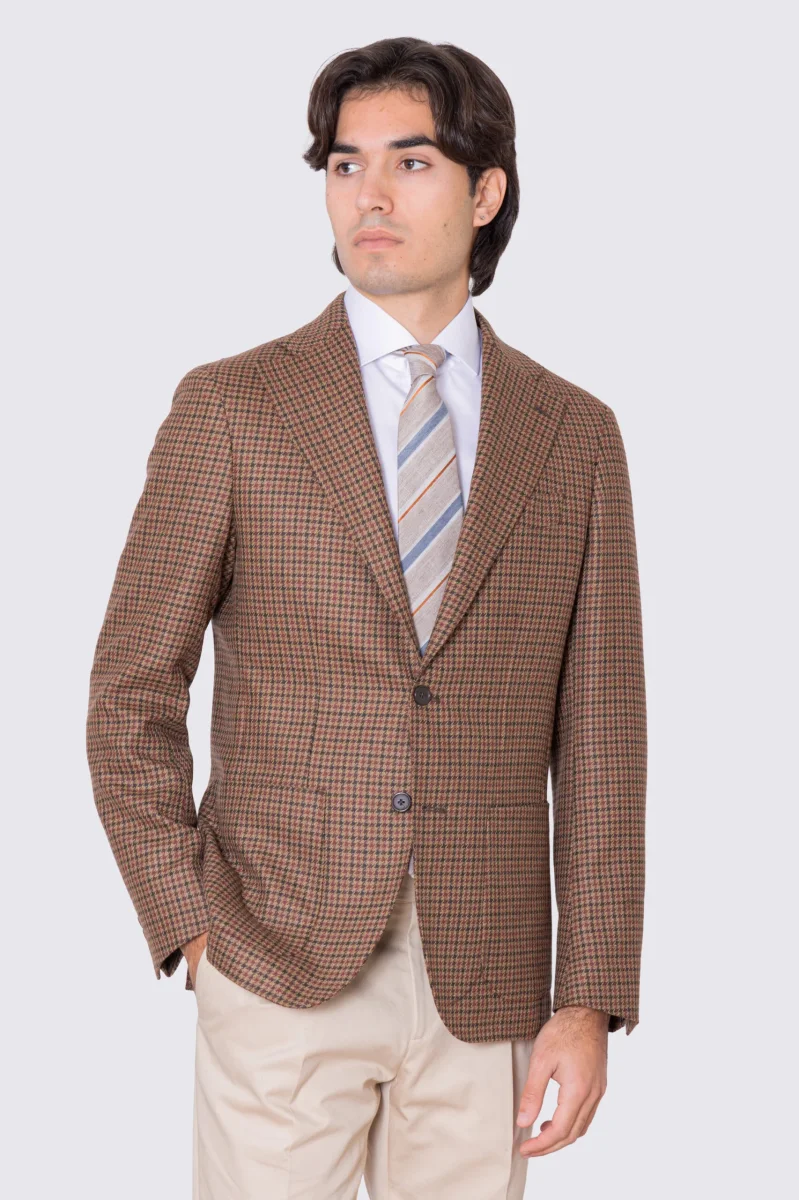 Giacca da uomo beige Monopetto fantasia Quadri verde e bordeaux in lana flanella Bristol tessuti napoli sfoderata Rever a lancia tasche a filo