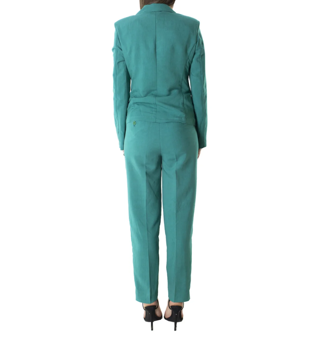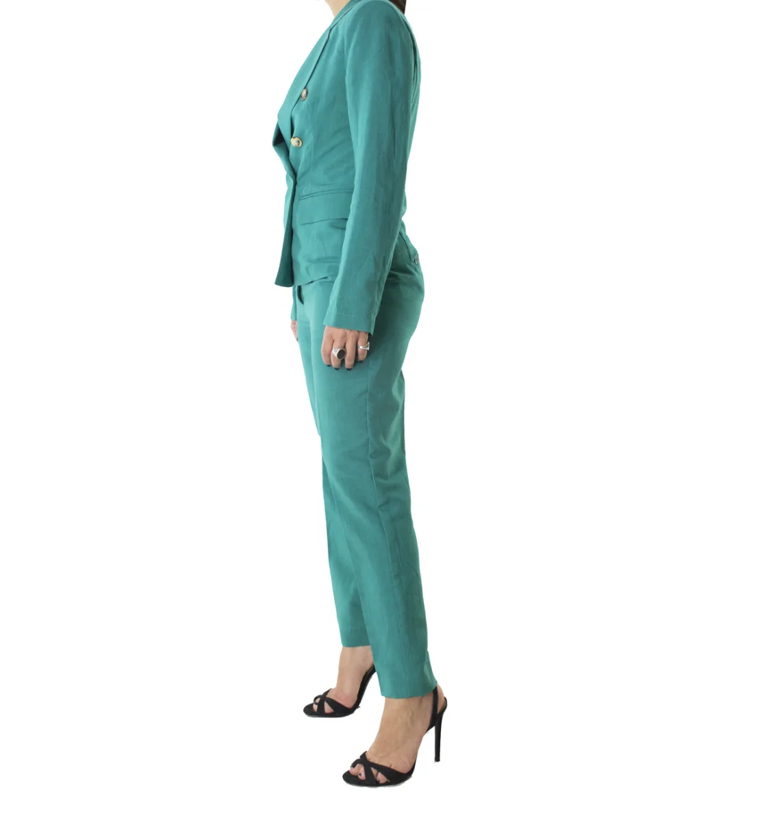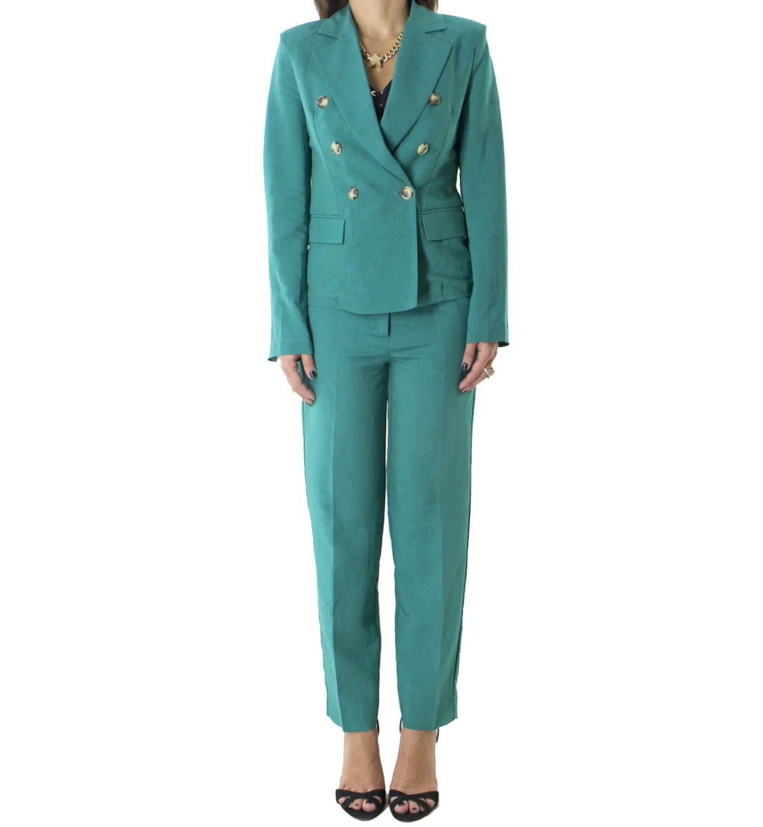 Giacca donna blazer corto sfoderato in lino modello doppiopetto bottone tartarugato e spalline