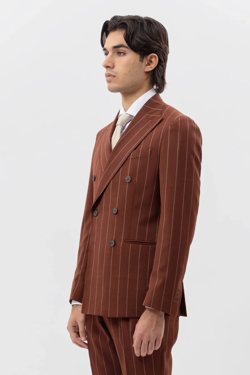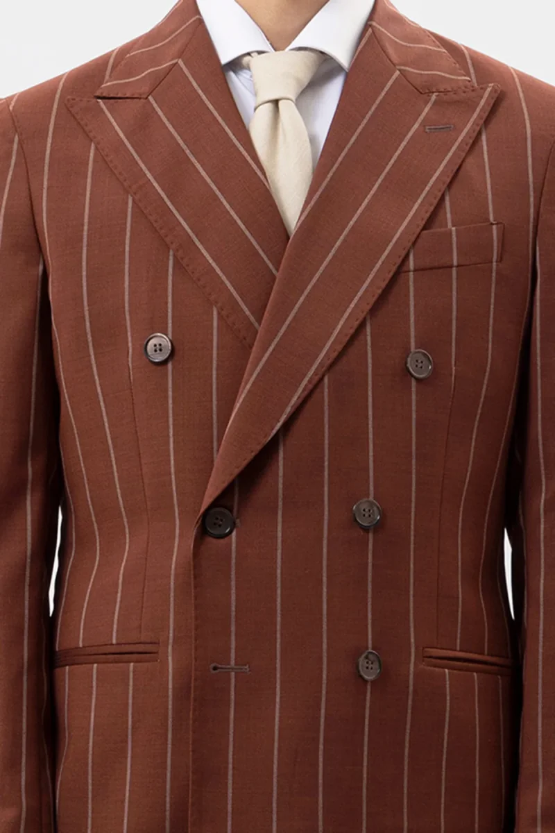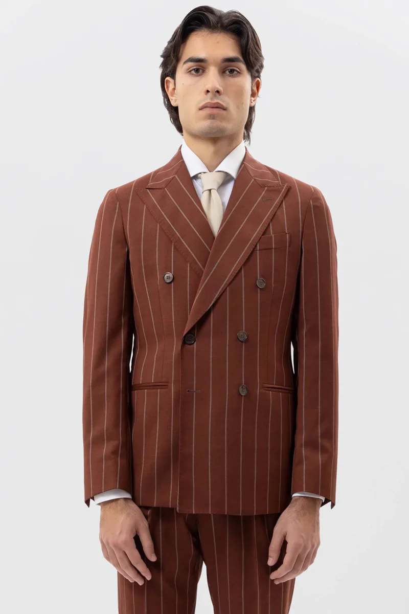 Giacca Doppiopetto Coccio Gessata Beige Uomo Fresco Lana Super 130’s Fordam Tessuti Napoli Rever A Lancia