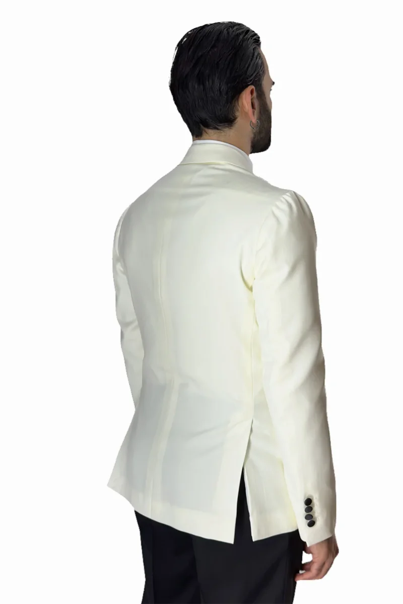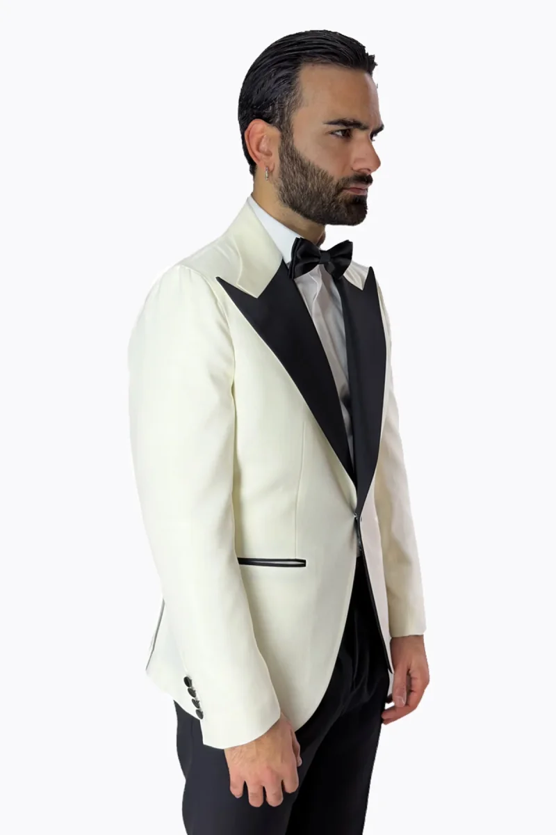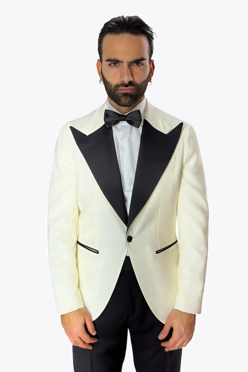 Giacca smoking da uomo bianco monopetto in fresco lana super 140’s Bristol Tessuti Napoli con rever a Lancia largo