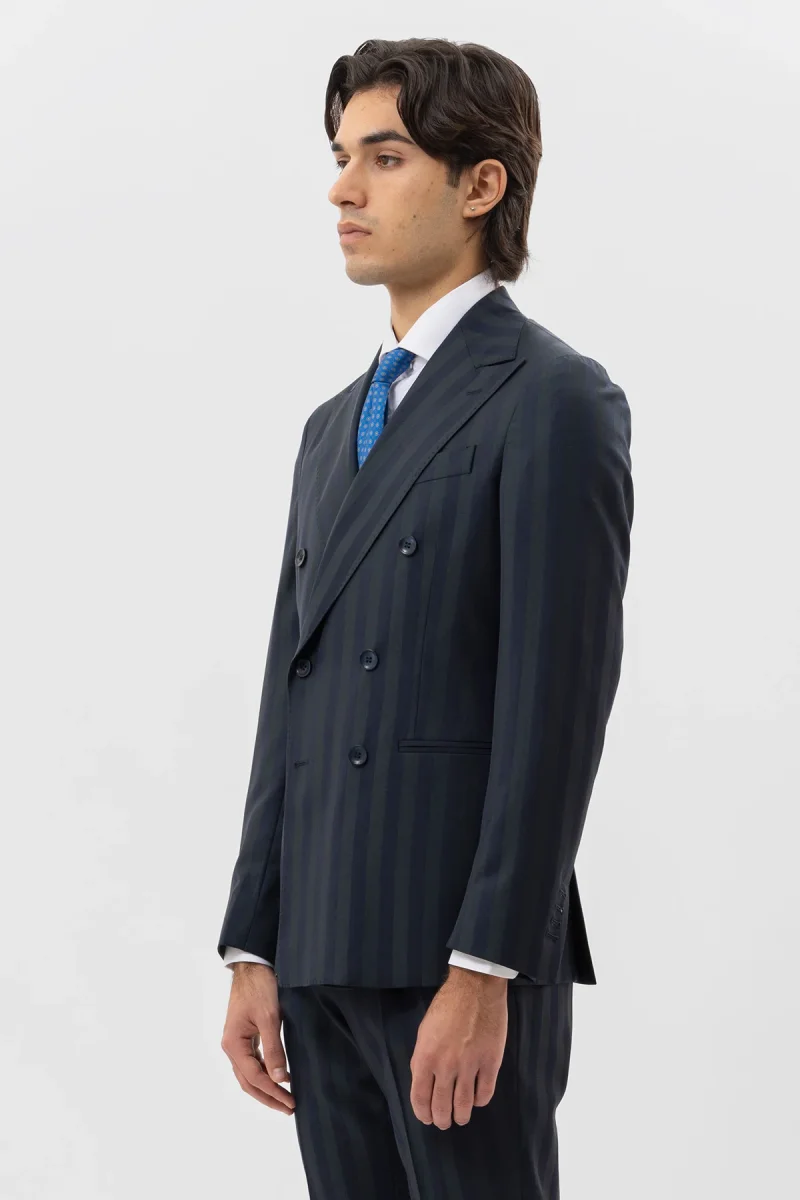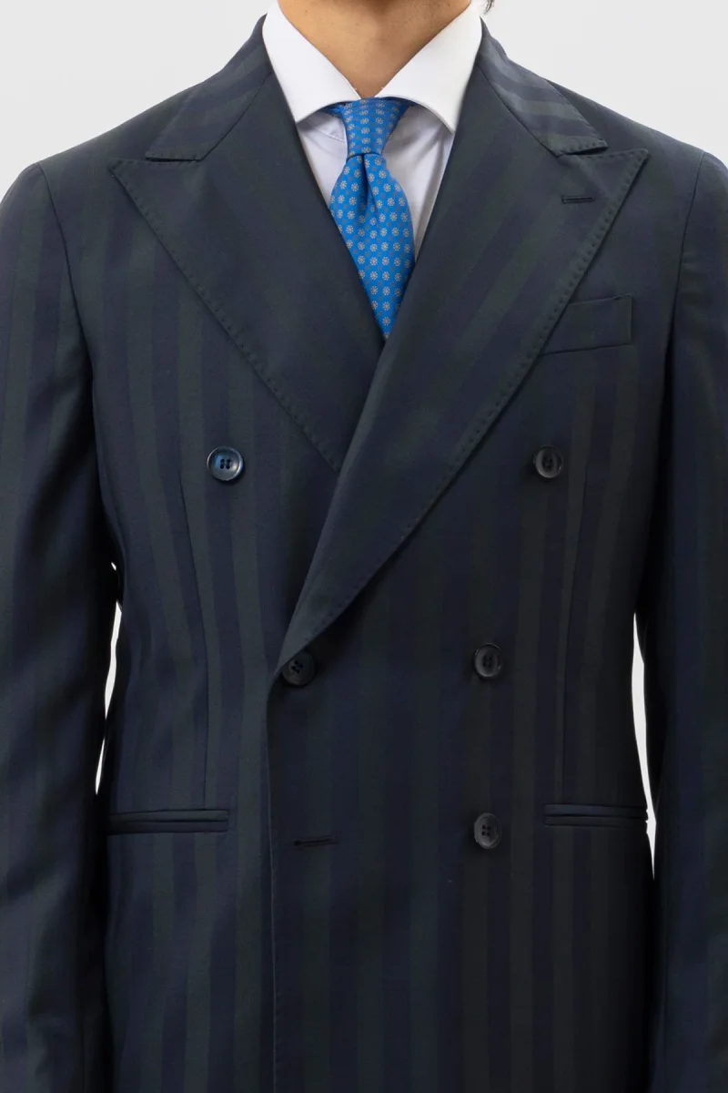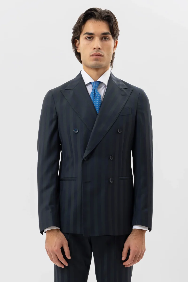 Giacca Uomo Doppiopetto Blu Riga Verde Fresco Lana Super 140’s Rever A Lancia 13cm Tasche A Filo