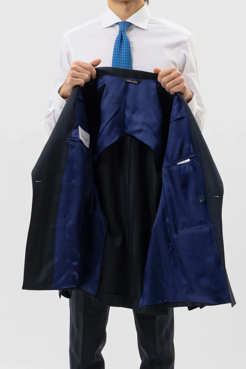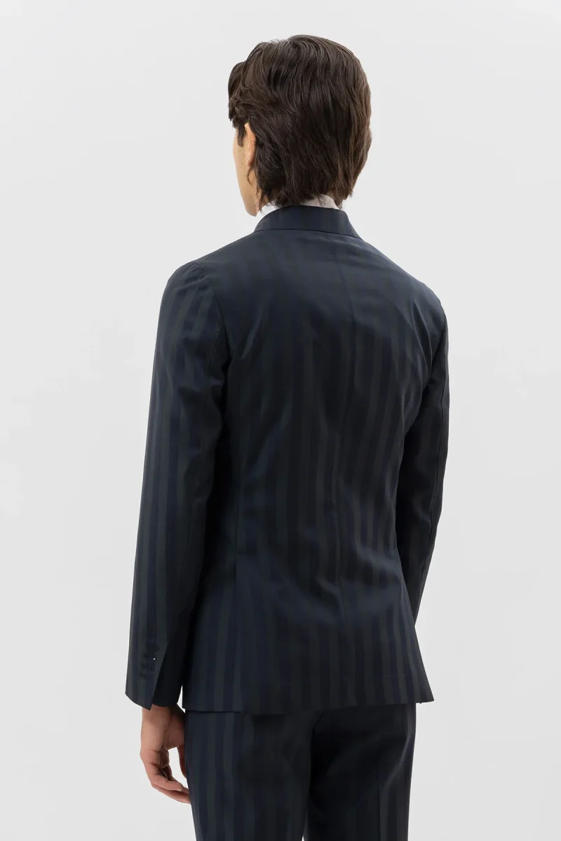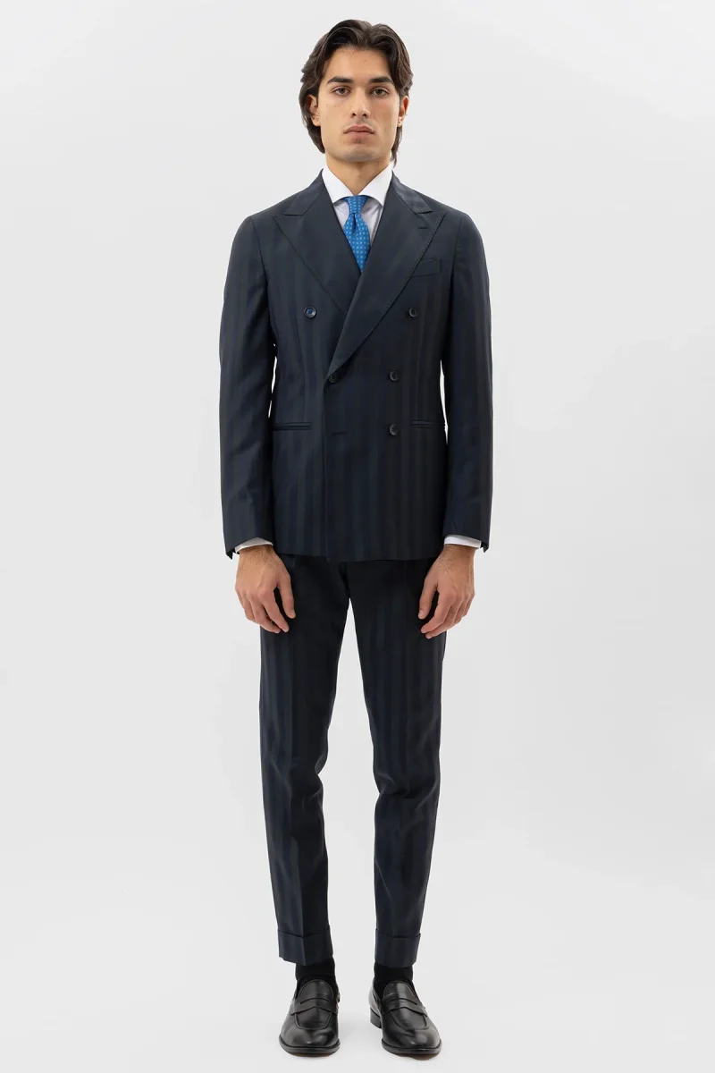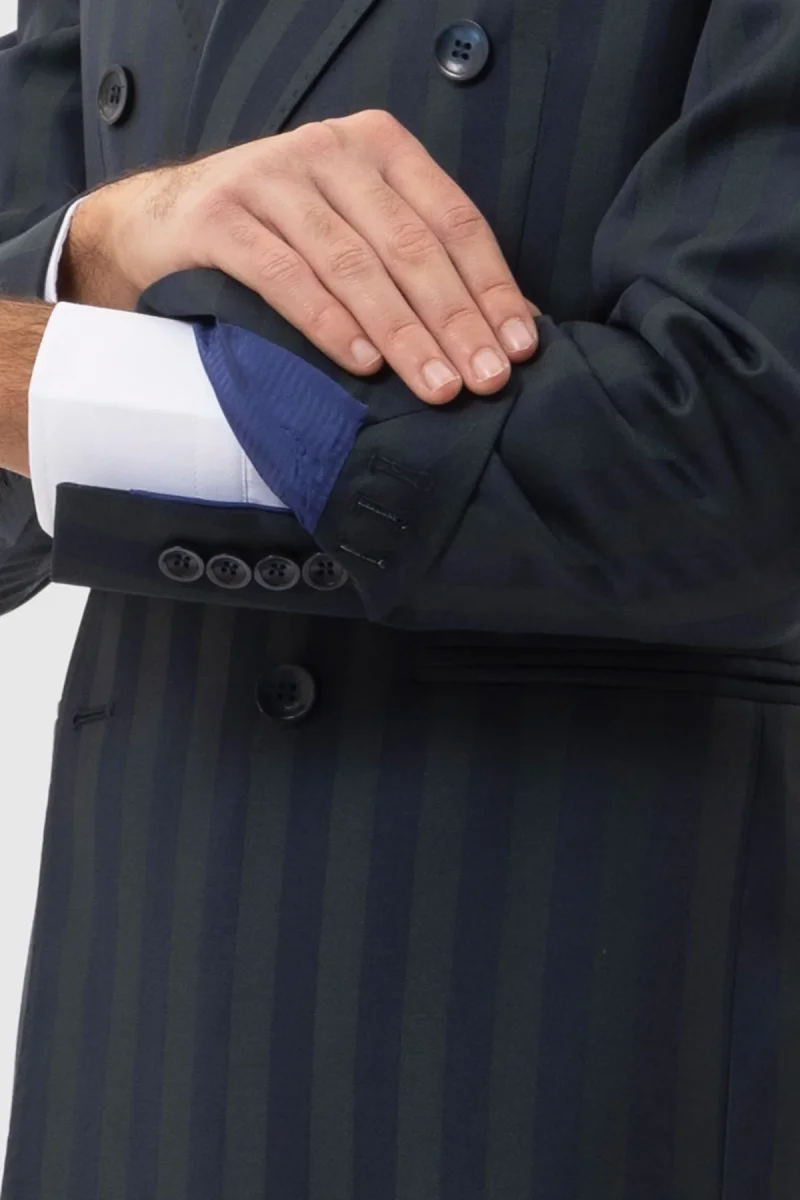 Giacca Uomo Doppiopetto Blu Riga Verde Fresco Lana Super 140’s Rever A Lancia 13cm Tasche A Filo