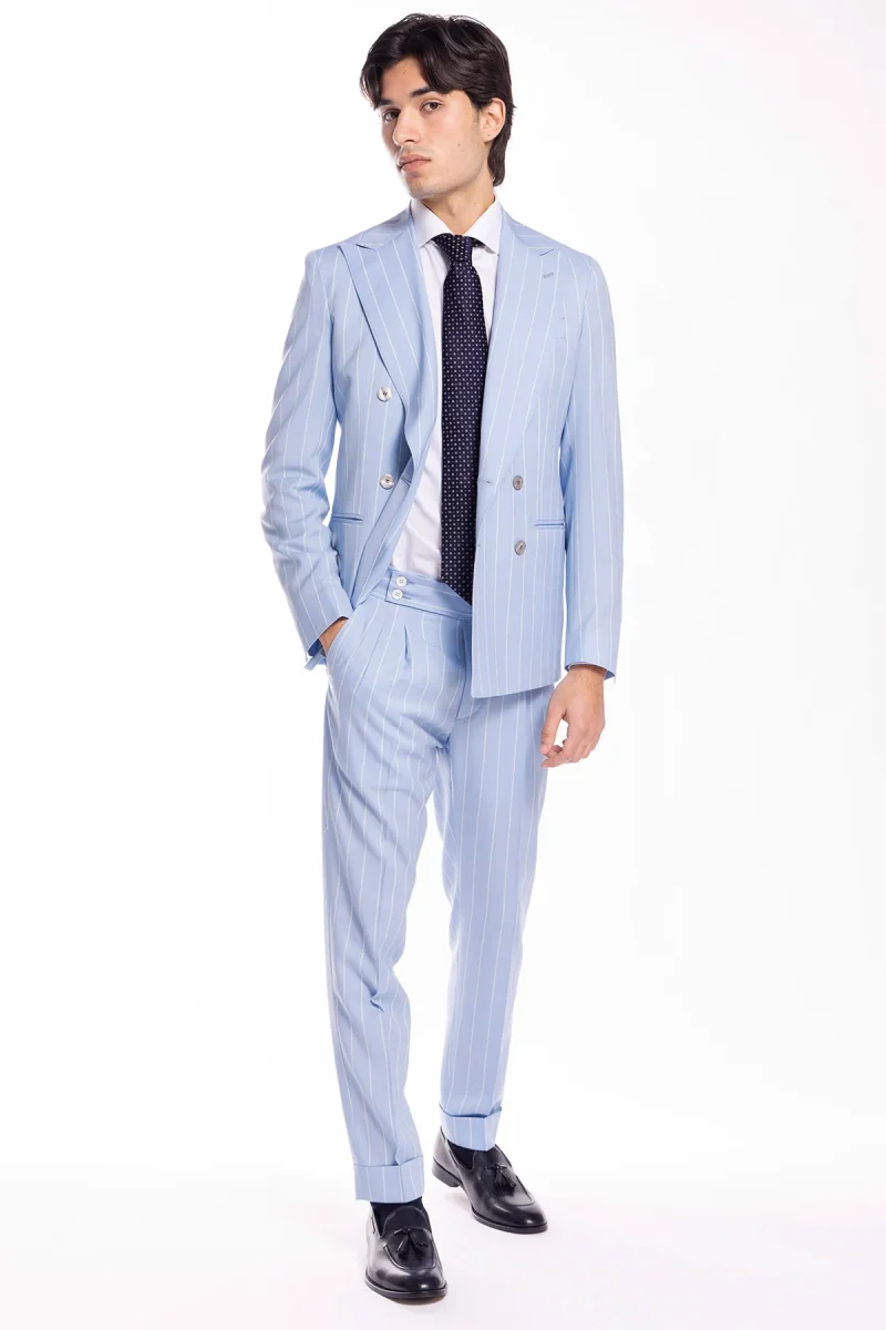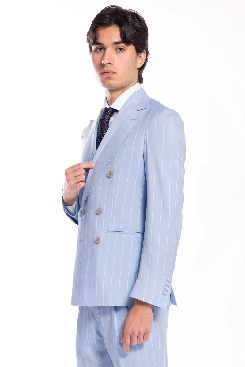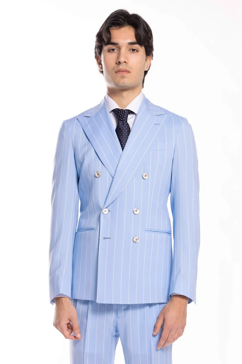 Giacca uomo doppiopetto celeste gessata con riga bianca fresco lana super 130’s Bristol Tessuti Napoli rever a lancia
