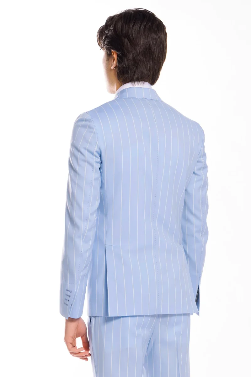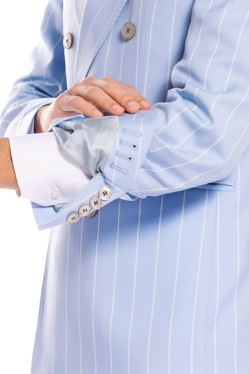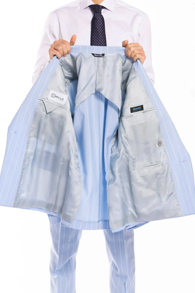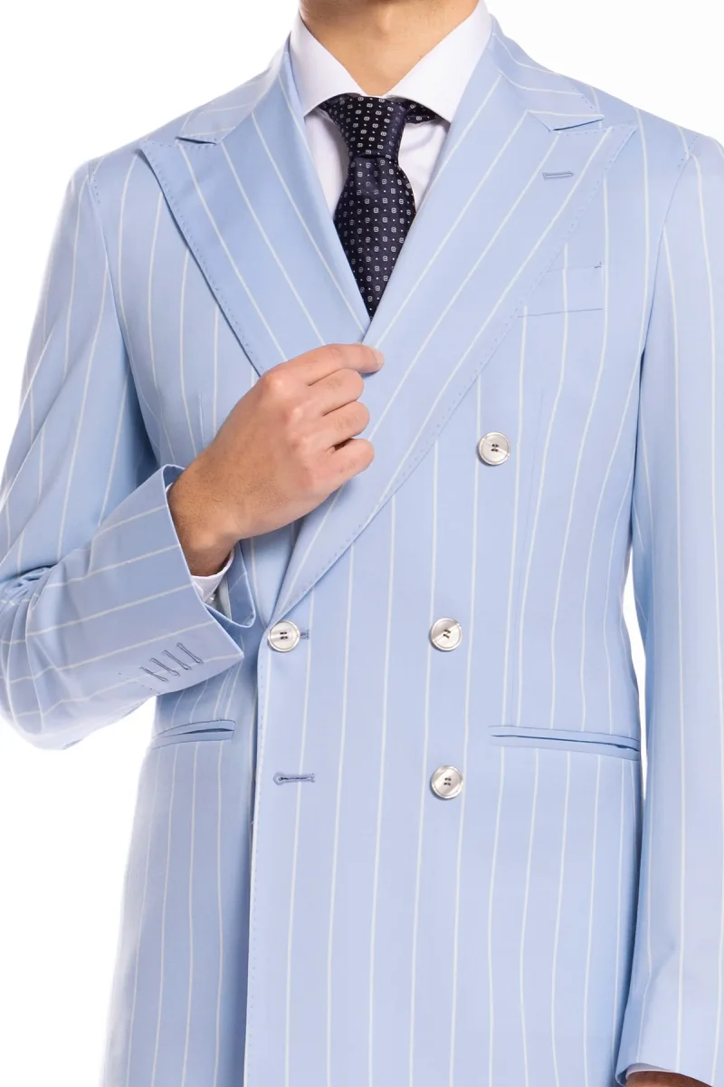 Giacca uomo doppiopetto celeste gessata con riga bianca fresco lana super 130’s Bristol Tessuti Napoli rever a lancia