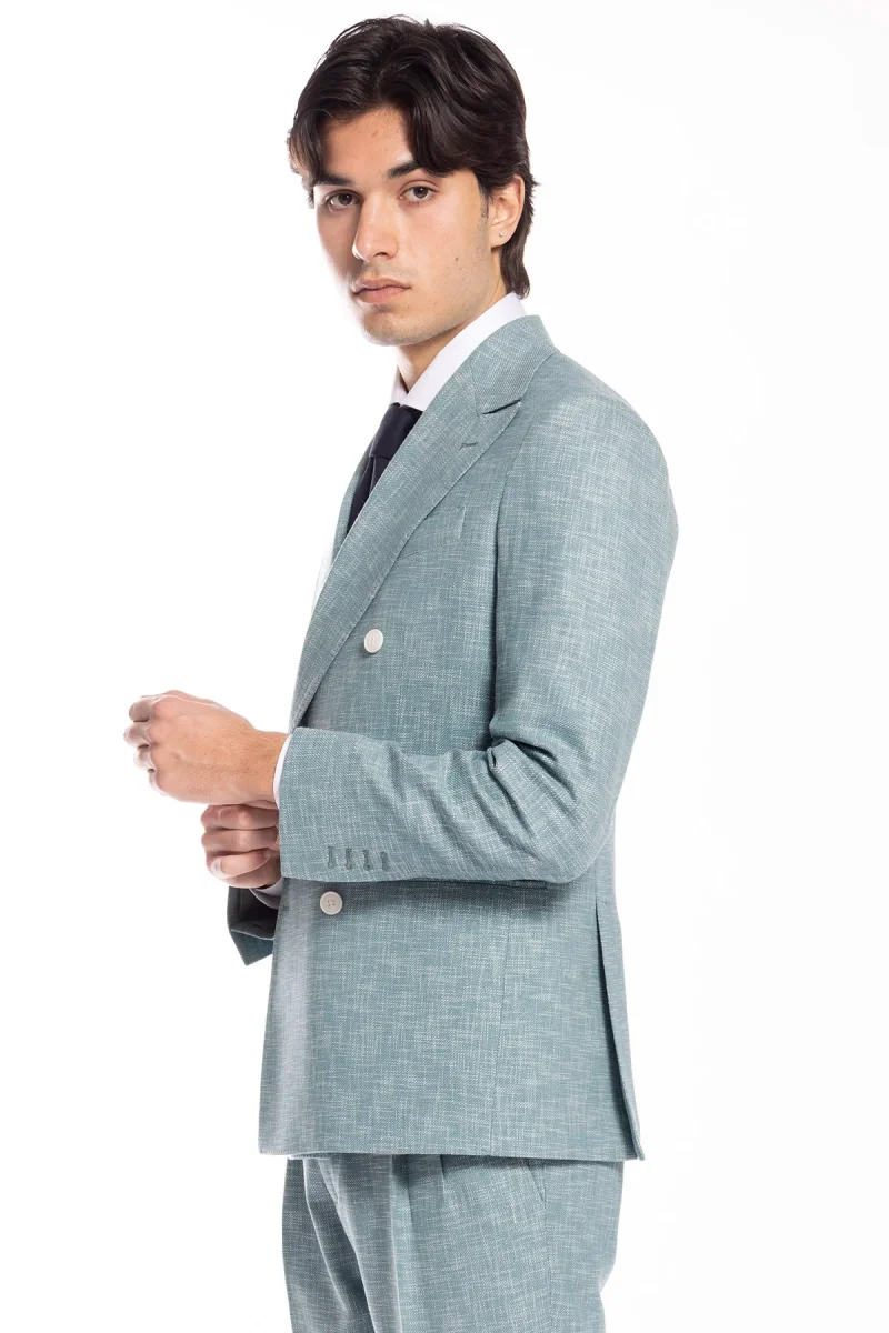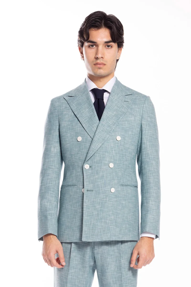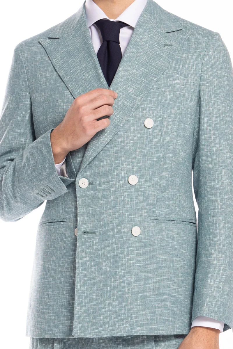Giacca uomo doppiopetto verde tiffany effetto melange misto lana e cotone Bristol Tessuti Napoli rever a lancia