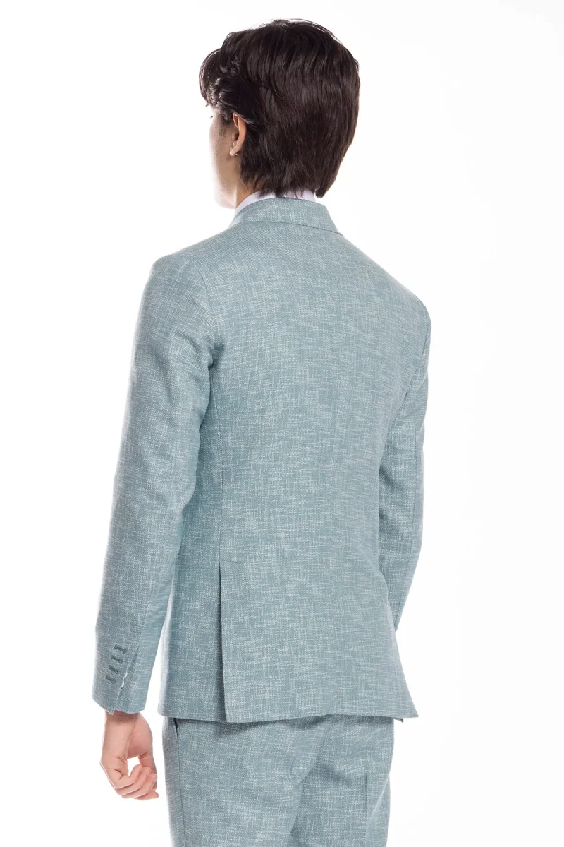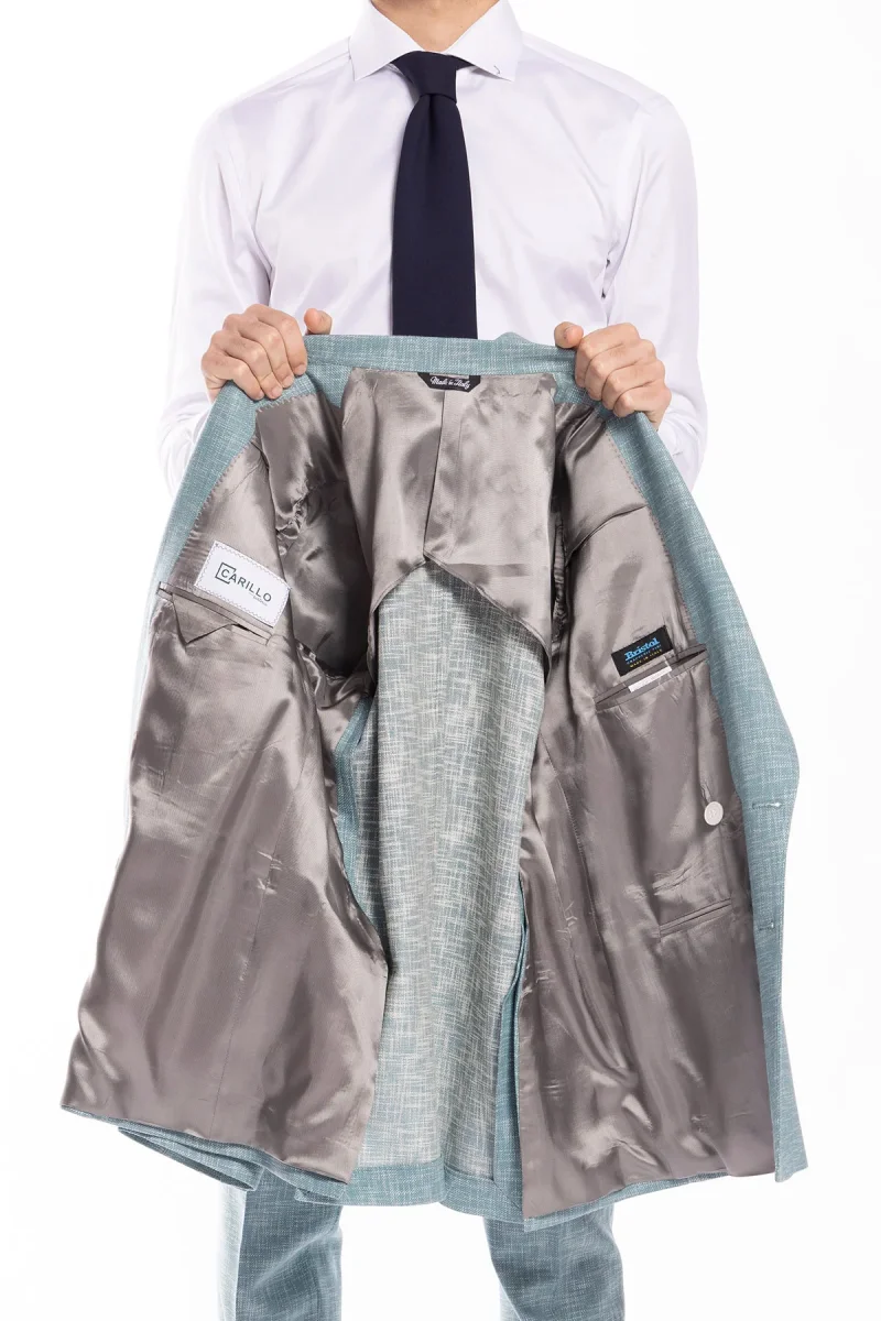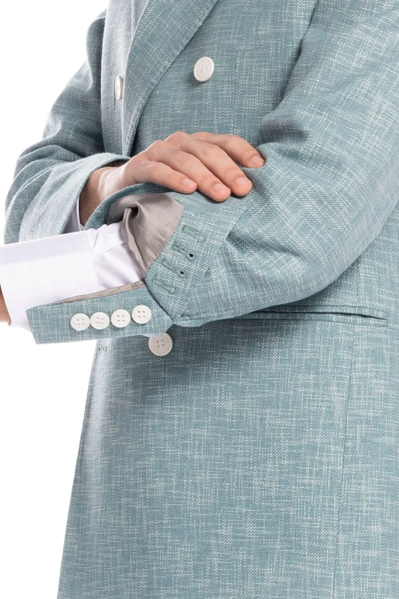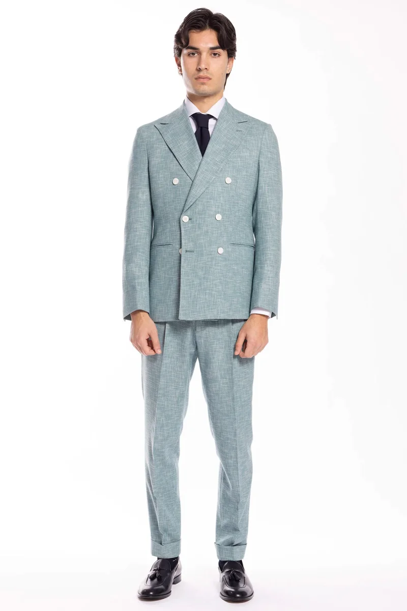 Giacca uomo doppiopetto verde tiffany effetto melange misto lana e cotone Bristol Tessuti Napoli rever a lancia