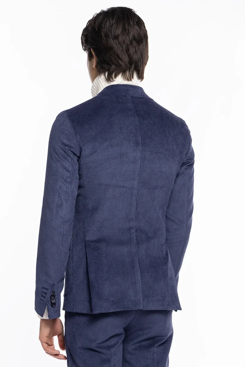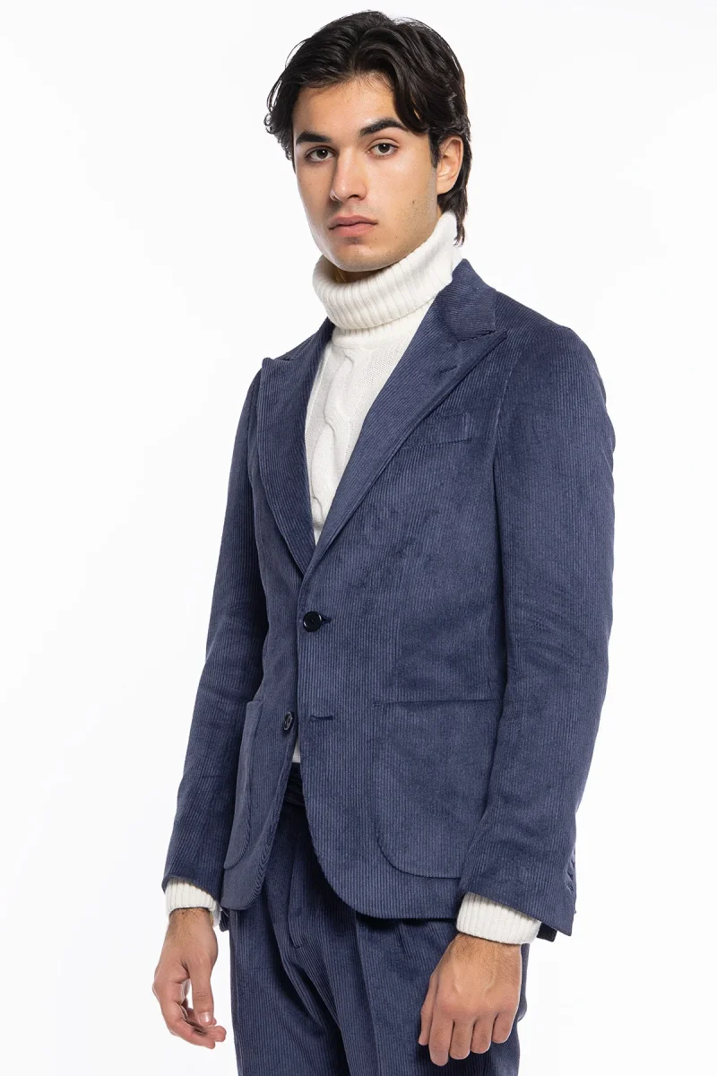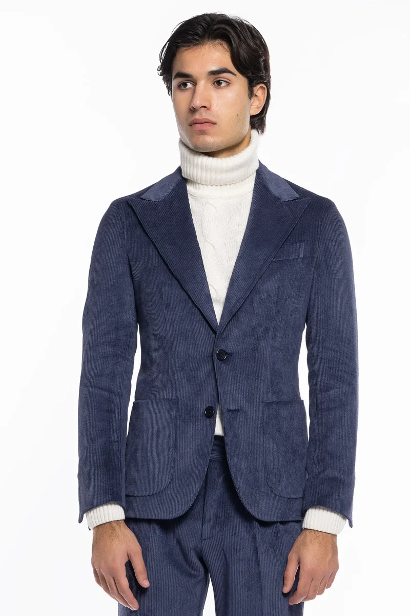 GIACCA UOMO MONOPETTO COLOR DENIM IN VELLUTO A COSTINE STRETTE REVER A LANCIA TASCHE A TOPPE