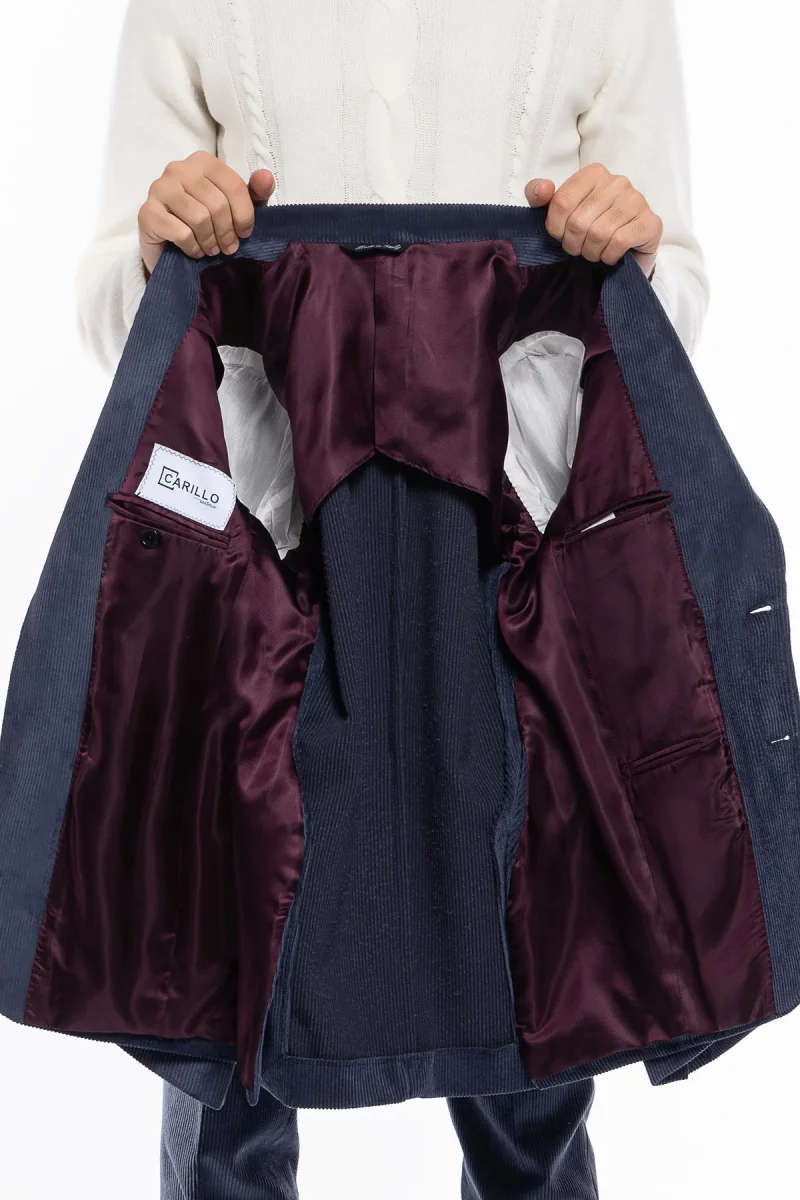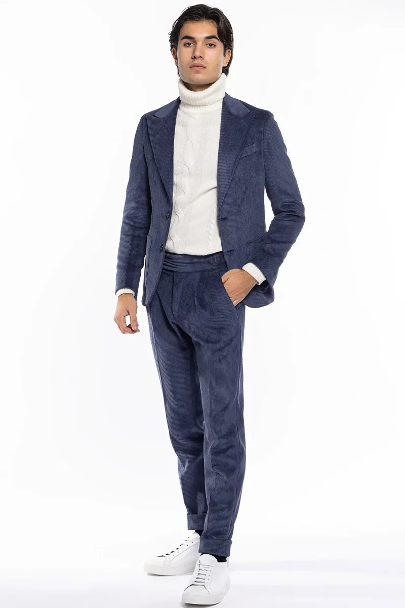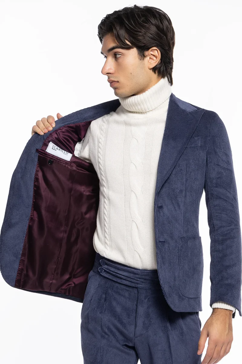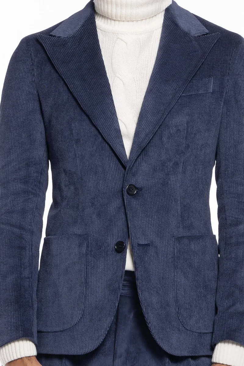 GIACCA UOMO MONOPETTO COLOR DENIM IN VELLUTO A COSTINE STRETTE REVER A LANCIA TASCHE A TOPPE