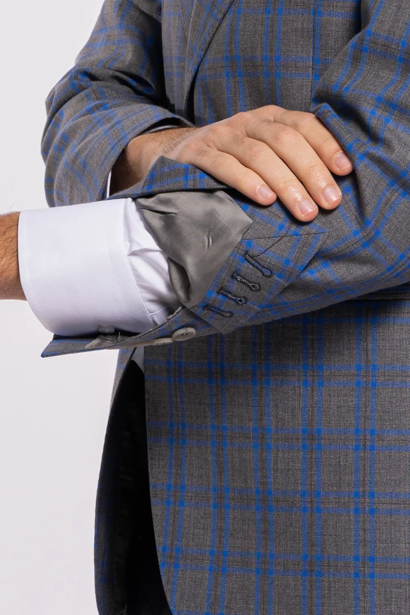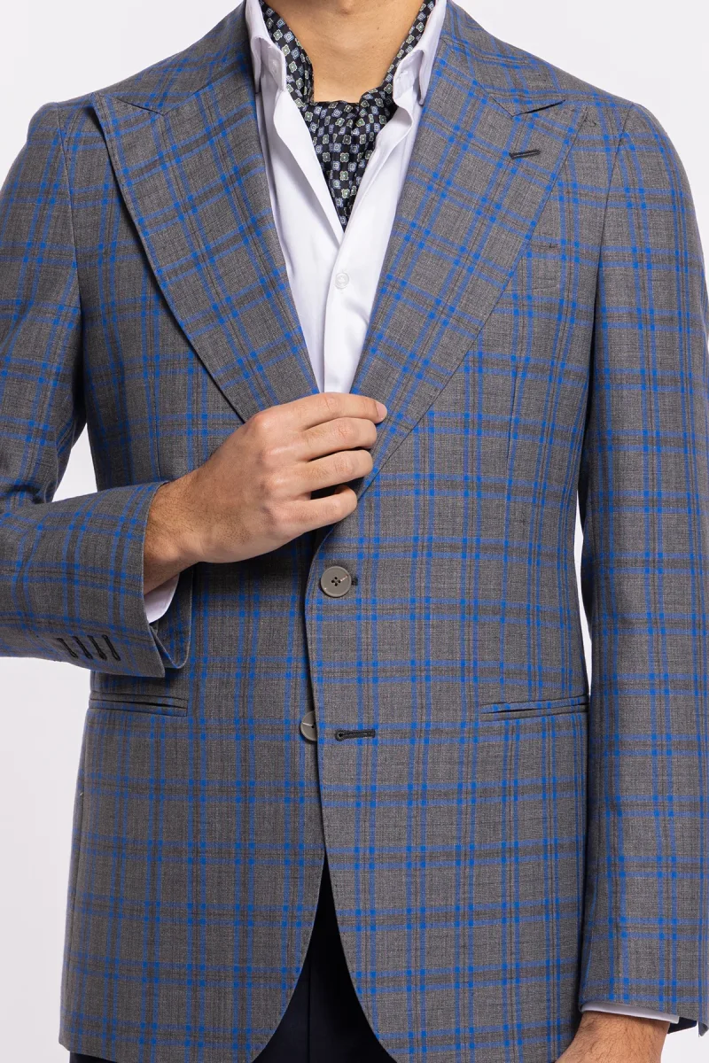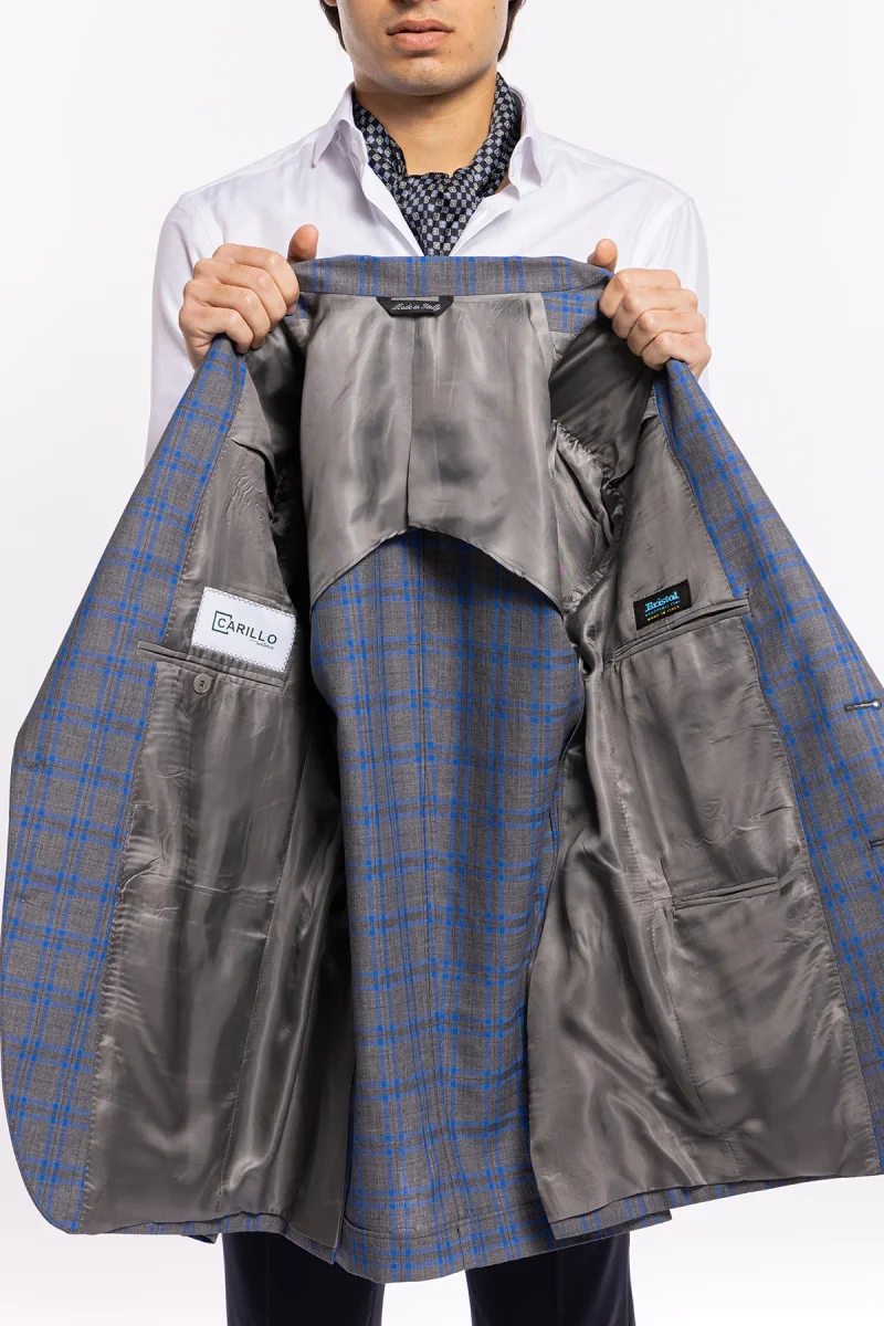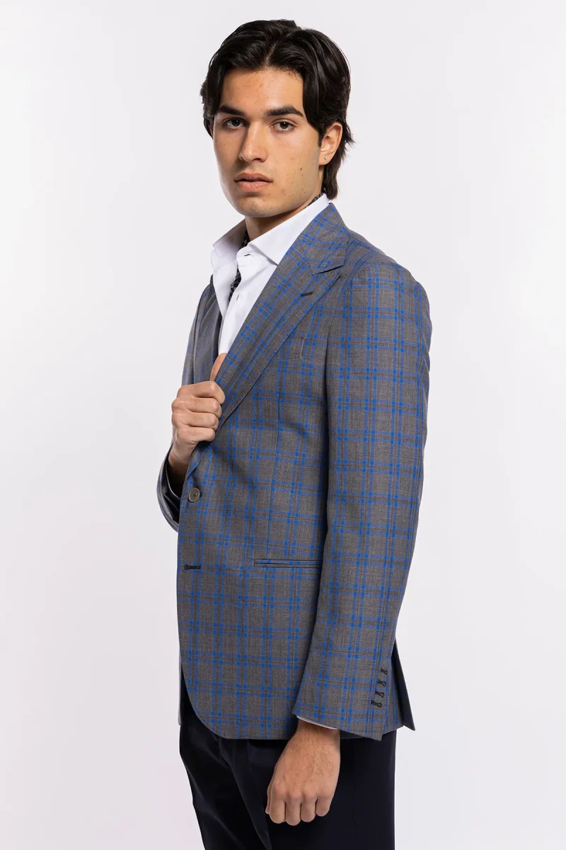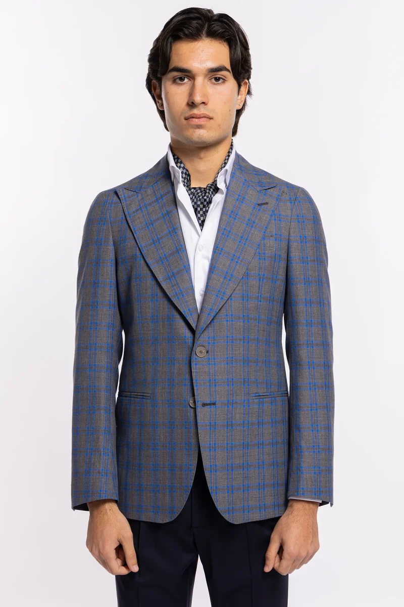 Giacca uomo monopetto grigia fantasia quadri blu fresco lana Bristol Tessuti Rever largo a lancia