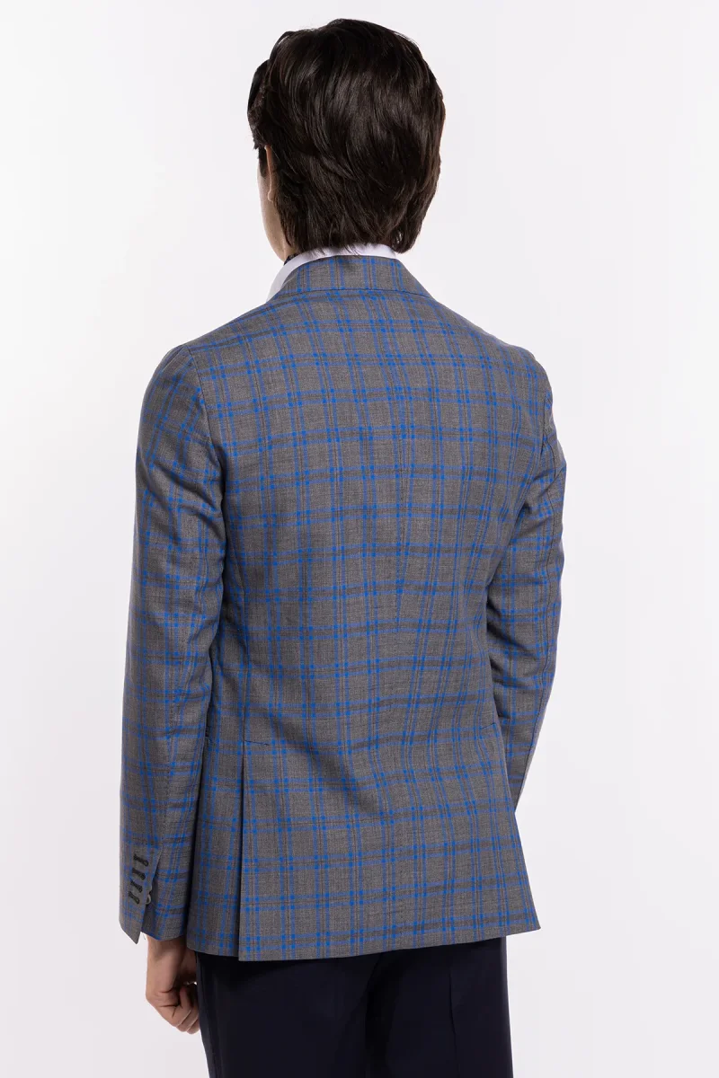 Giacca Uomo Monopetto Grigia Fantasia Quadri Blu – Eleganza e Stile con Fresco Lana