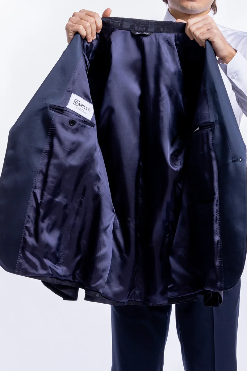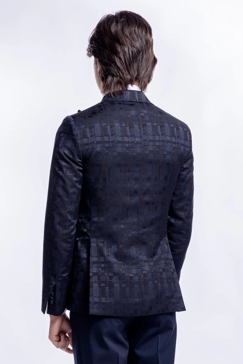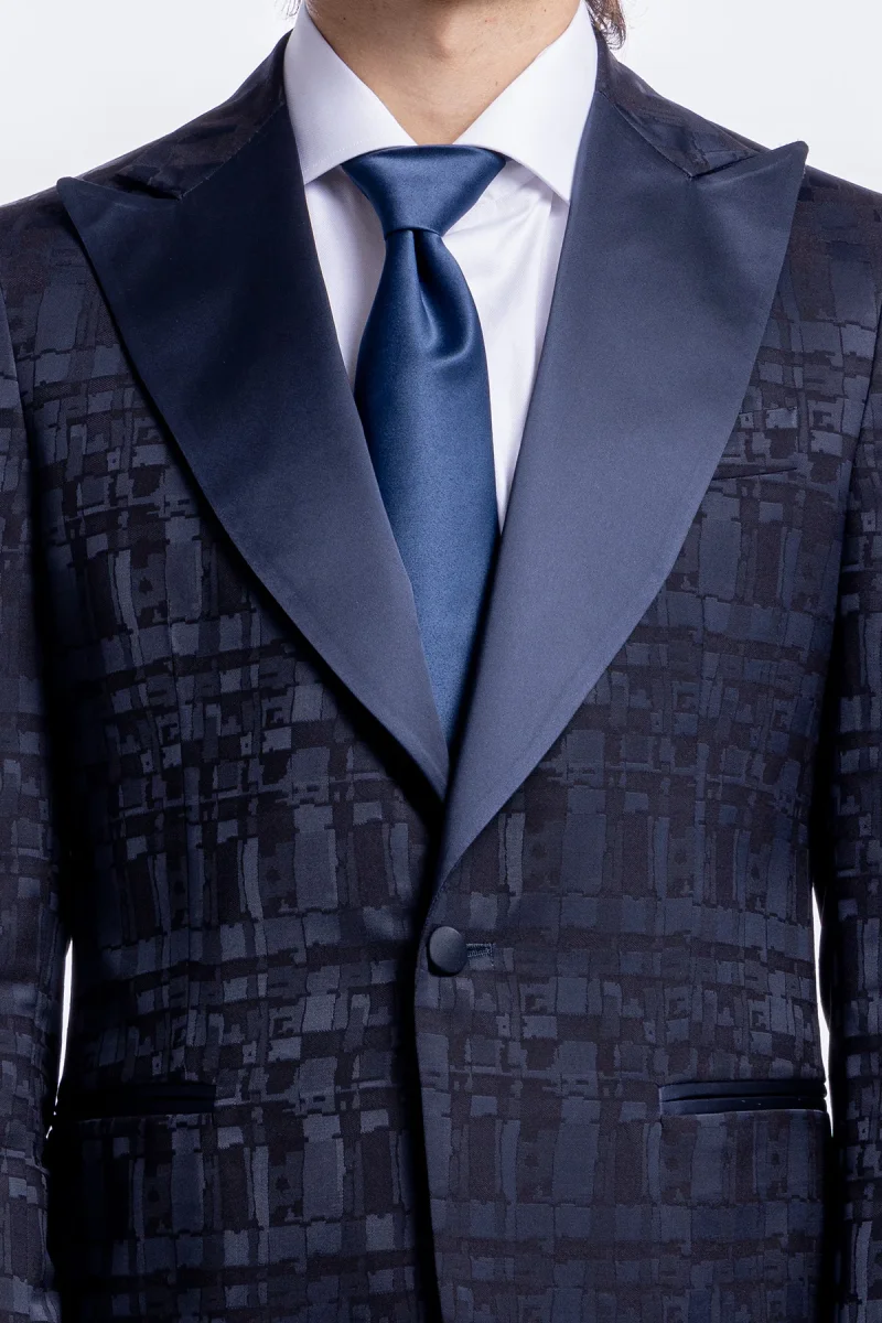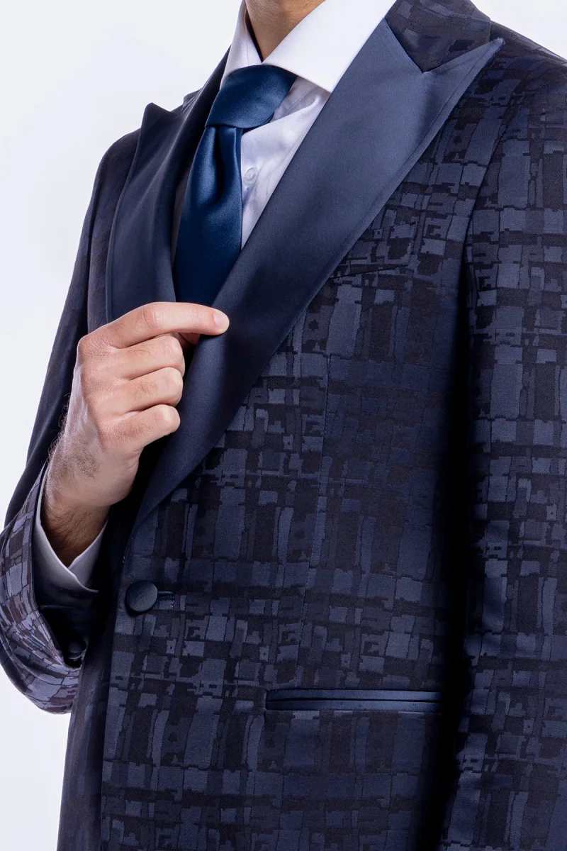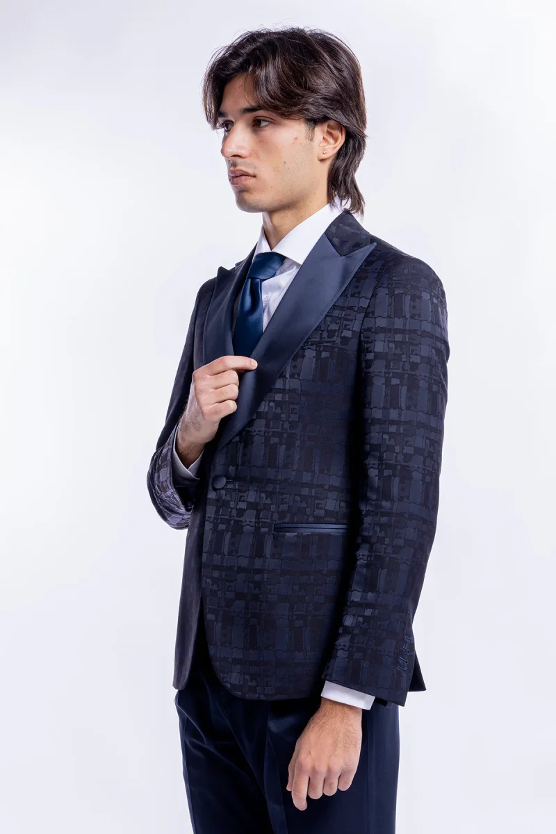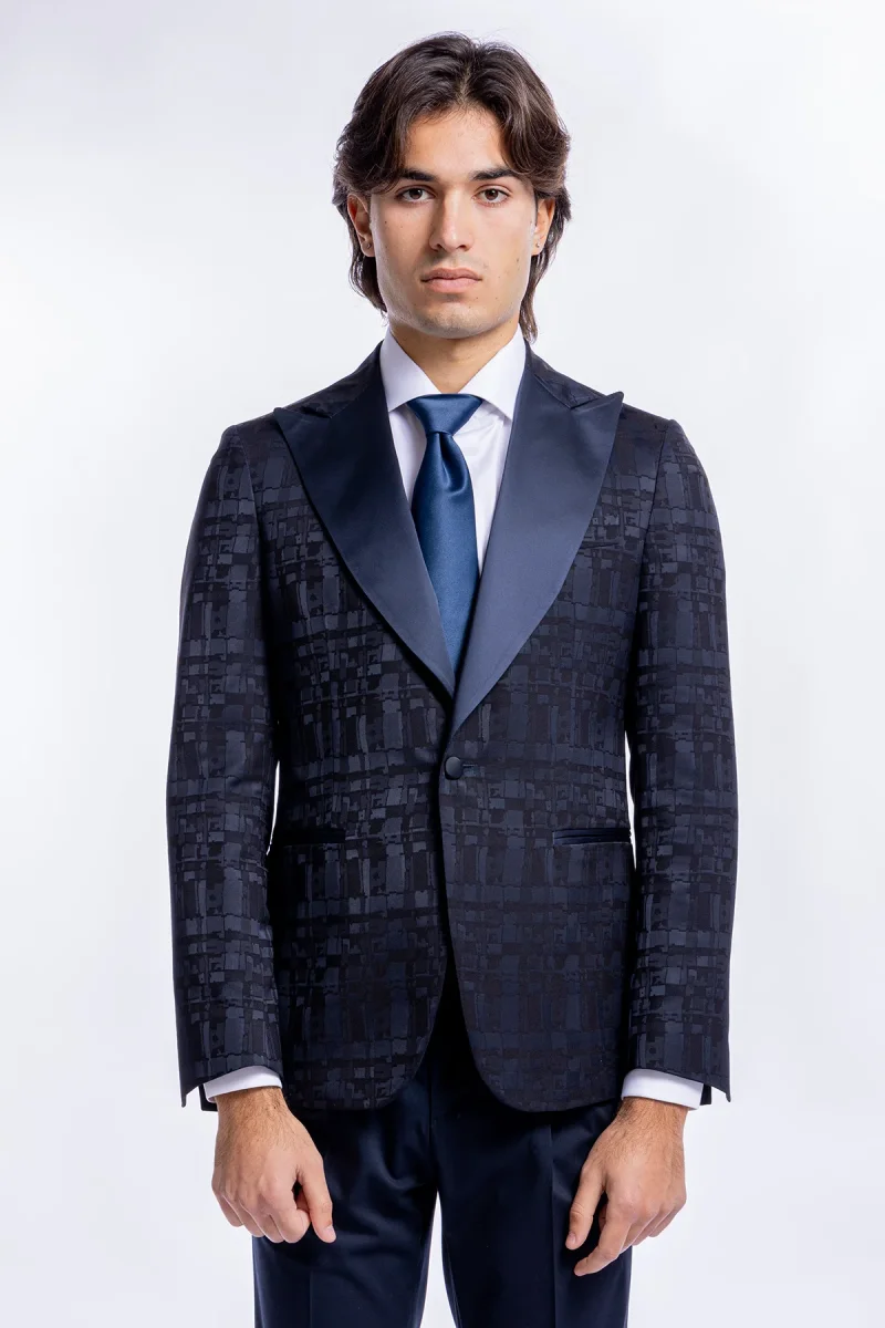 Giacca da uomo modello smoking monopetto sartorialefantasia nero blu vestibilita slim fit con rever a lancia larga impunturato
