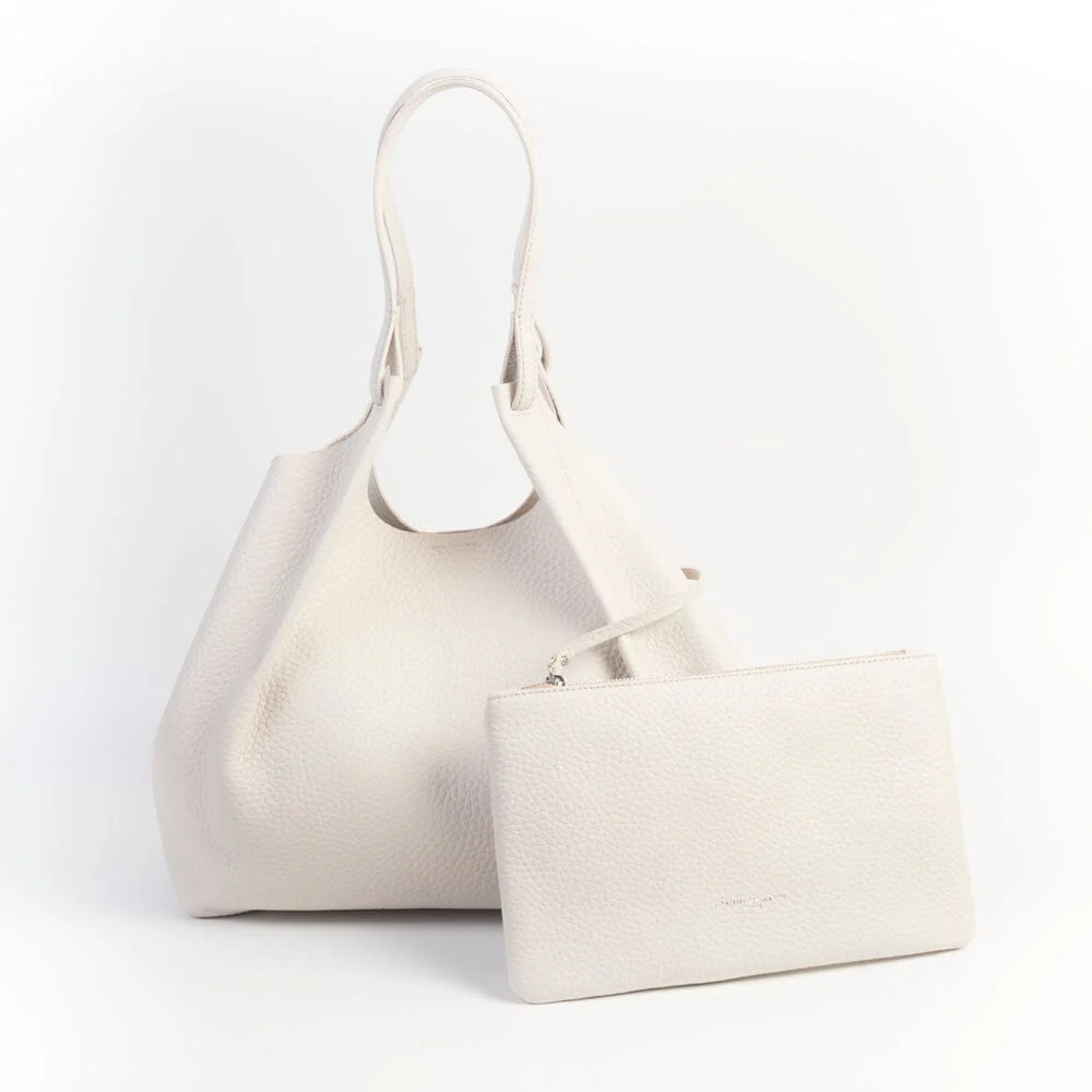 Borsa a spalla Dua di Gianni Chiarini, realizzata in morbida pelle martellata di colore avorio. Interno sfoderato in nuance e dotato di pochette con zip agganciata alla borsa. Chiusura con magnete e gancio trasversale per ridurne la dimensione.