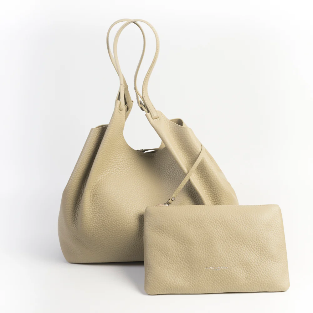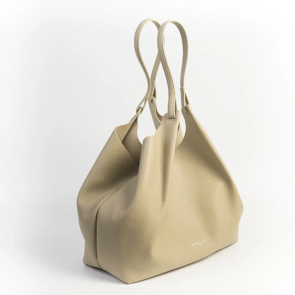 Borsa a spalla Dua di Gianni Chiarini, realizzata in morbida pelle martellata di colore verde salvia. Interno sfoderato in nuance e dotato di pochette con zip agganciata alla borsa. Chiusura con magnete e gancio trasversale per ridurne la dimensione.