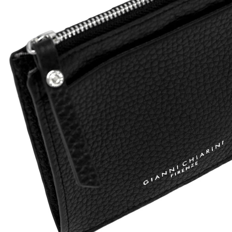 Portacarte di Gianni Chiarini, realizzato in pelle martellata e laminata di colore nero. Slot portacarte a 7 spazi e piccoli documenti e taschina su lato opposto. Tasca centrale con chiusura a zip.