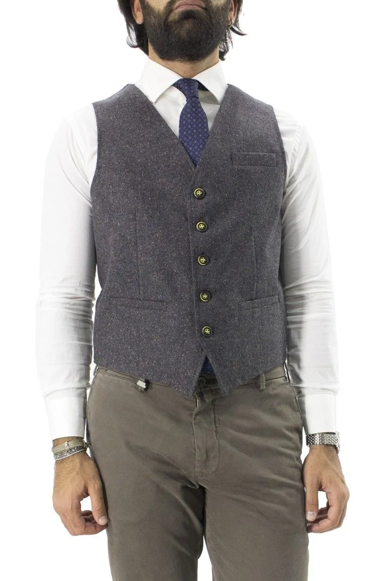 Gilet uomo in lana grigio a fantasia, con bottoni, regolabile.