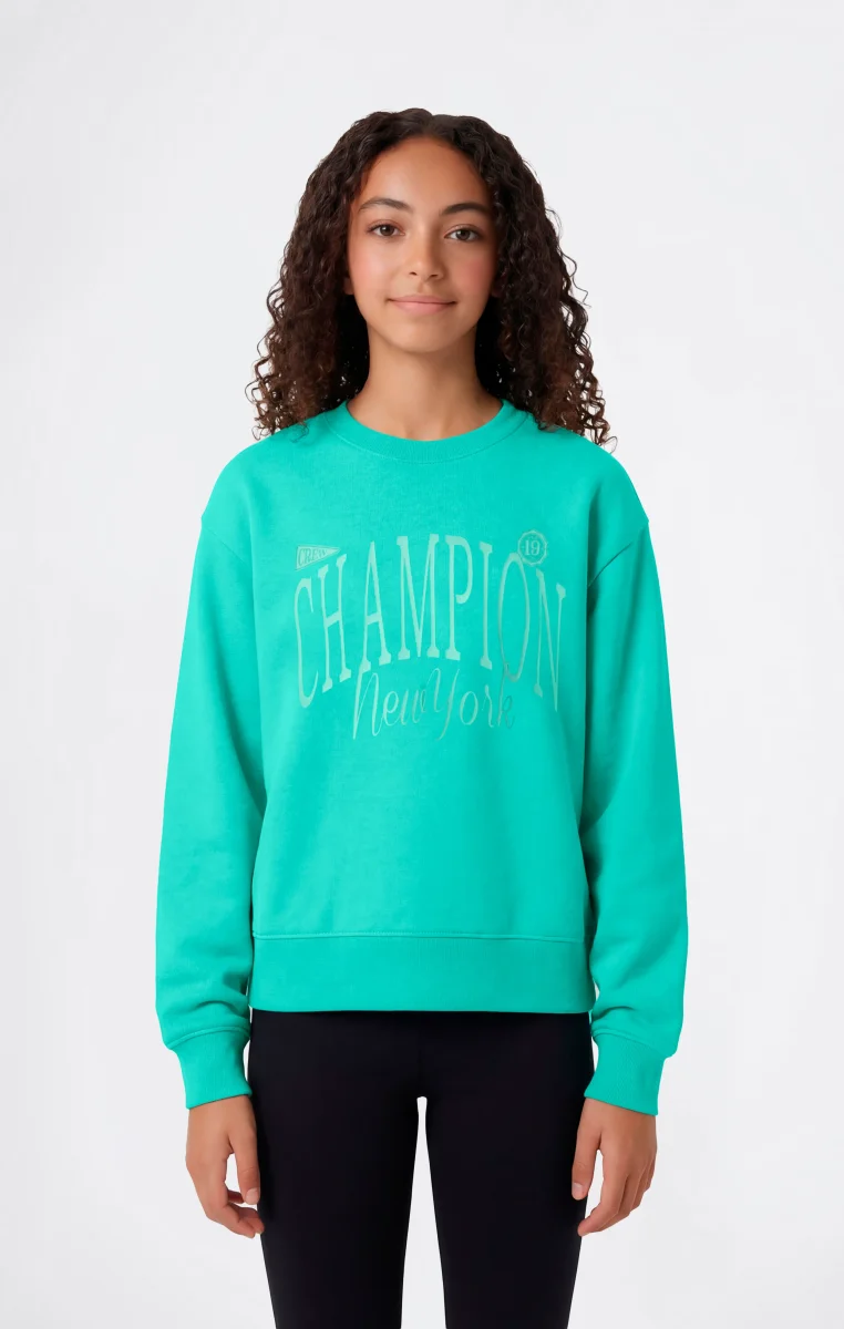 Girls’ tracksuit with an iconic sportswear style, composed of a crewneck sweatshirt and matching pants. Made from lightweight cotton-blend Terry fabric, it provides everyday comfort and practicality. The Champion New York graphic on the front of the sweatshirt reflects the brand’s heritage, while the non-brushed interior and Standard Fit ensure a lightweight feel and a regular, comfortable silhouette.@@@Standard Fit, comfortable with a regular silhouette |Lightweight cotton-blend Terry fabric |Composition: 55% Cotton, 45% Polyester |Fabric weight: 240 g/m² |Non-brushed interior |Crewneck sweatshirt |Champion New York graphic printed on the front |Elasticated waistband on pants |No pockets |Champion logo applied