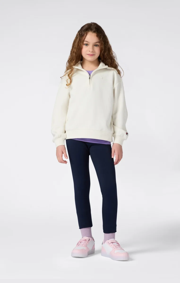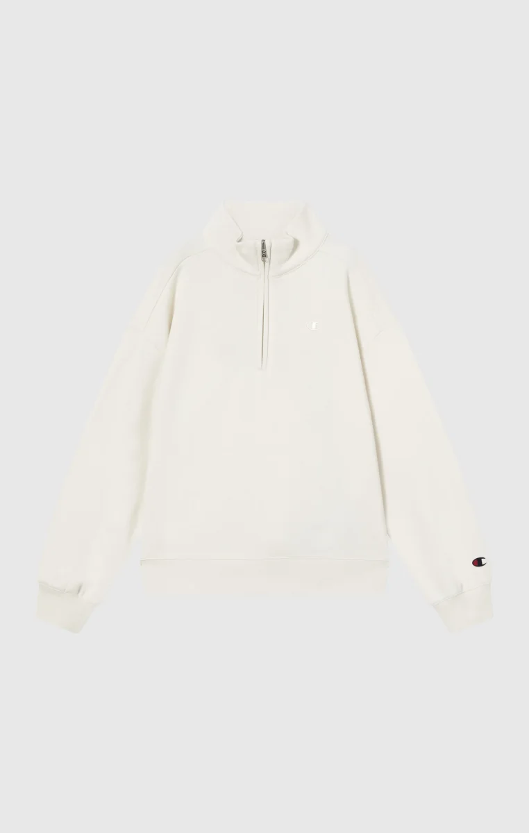 Half-zip fleece sweatshirt with brushed interior, perfect for a casual style inspired by Champion’s sporty heritage. The clean design with high collar, dropped shoulders, and tone-on-tone logo emphasizes the garment’s essential look. A must-have from the Icons line, designed for comfort and personality.@@@Fabric: Compact and soft fleece in ultra-light polyester 240 g/m² |Composition: 73% Cotton, 27% Polyester |Brushed interior for superior thermal comfort |Half zip closure |Tone-on-tone logo |Fit: Standard Fit – versatile and comfortable with standard widths and lengths. Close to the body with simple lines that don’t cling. Regular shoulder cut.