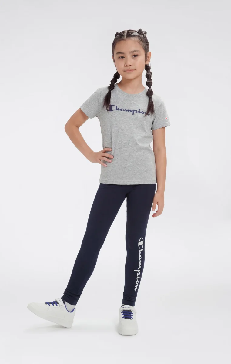 Girls’ leggings designed for everyday activities, from school to free time. Made from Stretch Athletic Jersey, they offer a fitted silhouette that follows the body’s natural movements. The stretch cotton fabric ensures comfort and freedom of movement, making them ideal for daily wear.@@@Fitted fit – close to the body |Fabric: Stretch Athletic Jersey |Composition: 95% Cotton, 5% Elastane |Weight: 180 g/m² |Essential design |No pockets |champion logo printed on the leg