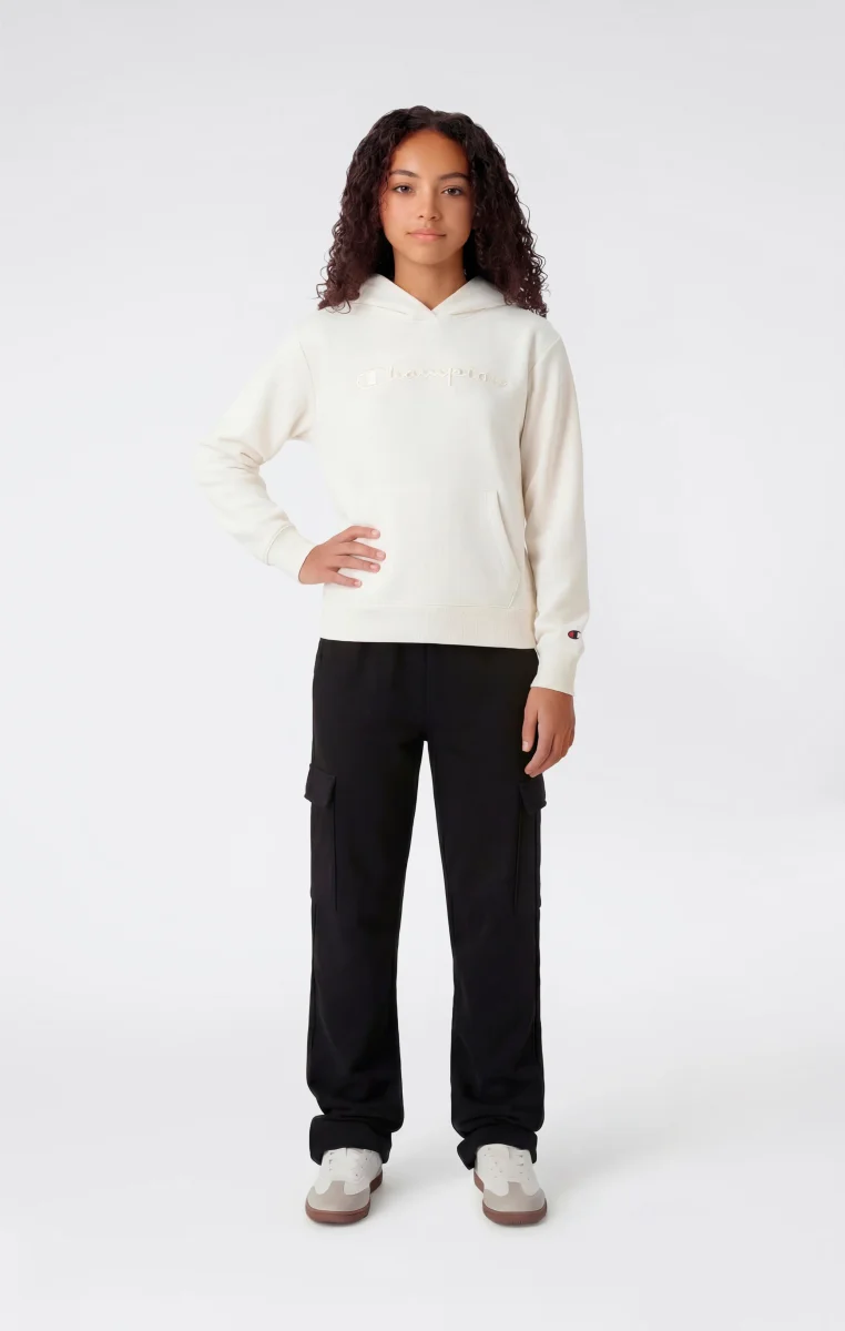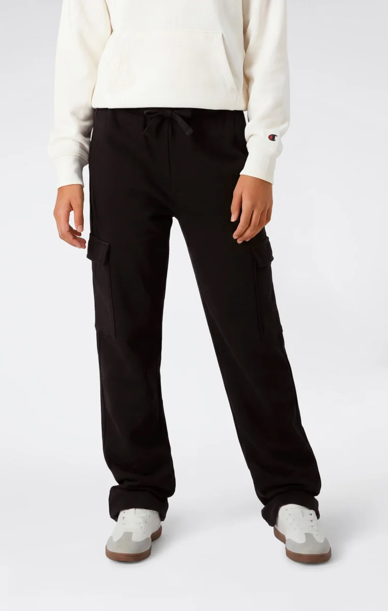 These girls’ straight-leg cargo pants are made from lightweight terry fabric, soft to the touch and compact in structure. Designed for everyday wear, they offer comfort and practicality thanks to a regular fit that follows movement naturally. The cargo design with applied side pockets defines a clean utility aesthetic, consistent with Champion’s sportswear DNA.@@@Fit: Standard Fit – comfortable, regular line |Fabric: Ultra Light Soft Compact Spring Poly Terry, lightweight and compact terry fabric |Composition: 73% Cotton, 27% Polyester |Weight: 240 g/m² |Design: straight leg with open hem |Details: applied side pockets |Unbrushed interior
