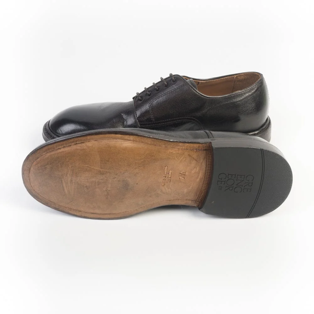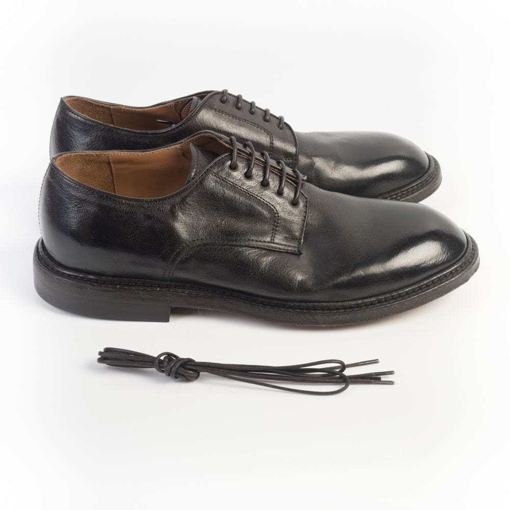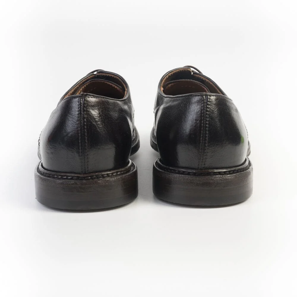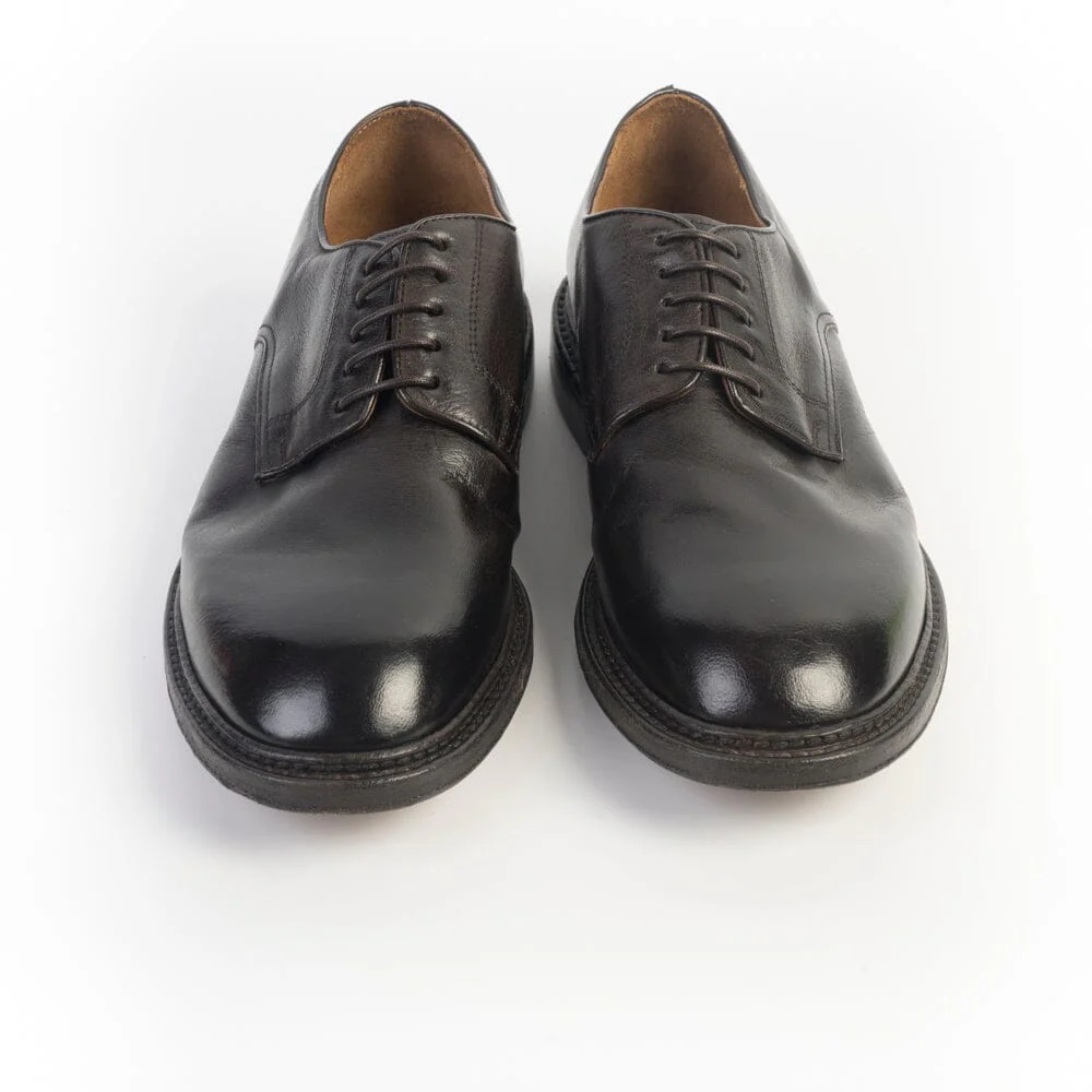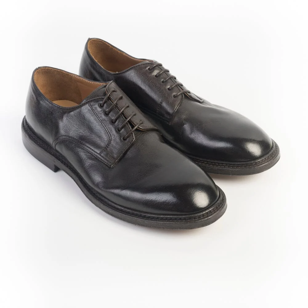Derby Green George realizzata in morbida pelle di bufalo leggermente spazzolato in punta di colore testa di moro. Punta tondeggiante, 5 fori con lacci in cotone cerato in nuance, interno sfoderato in punta, sottopiede in pelle, suola in cuoio ad effetto vintage.