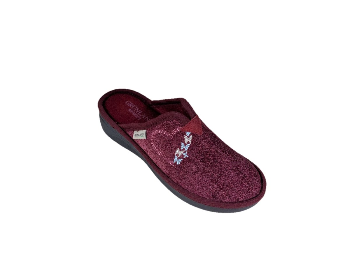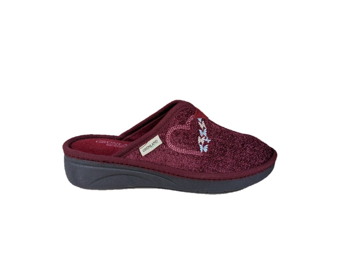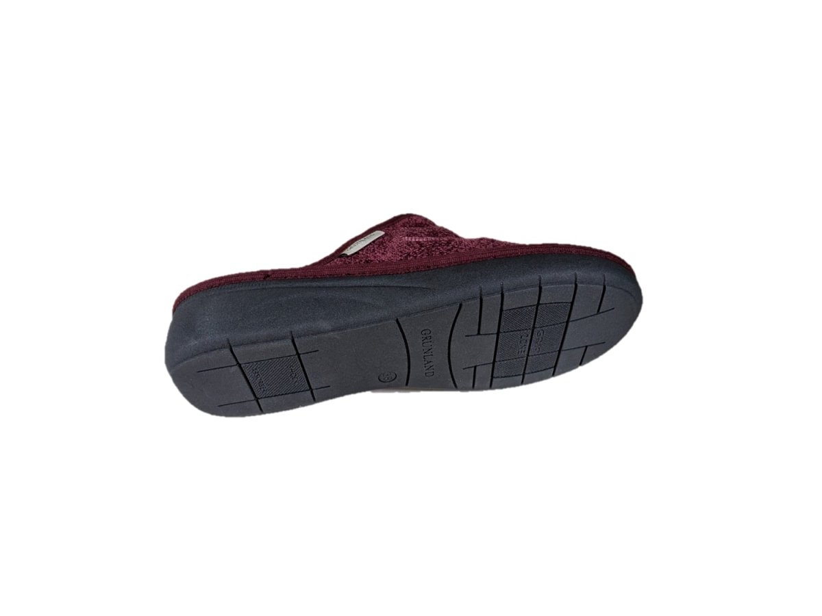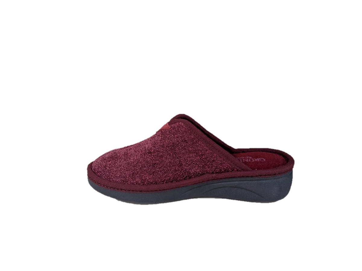 Ciabatte con tomaia in tessuto colore bordò, zeppa di 3,5cm, suola in gomma, fodera in tessuto