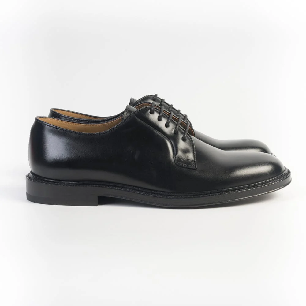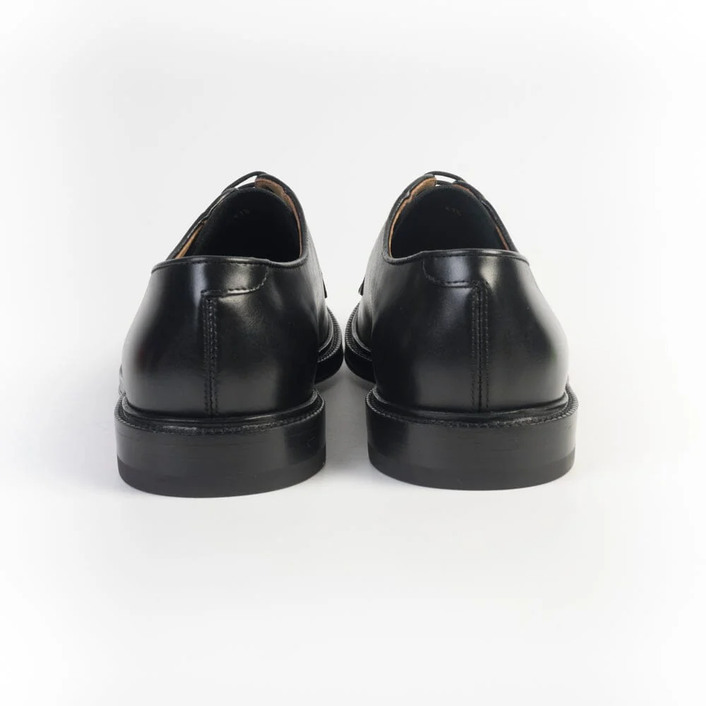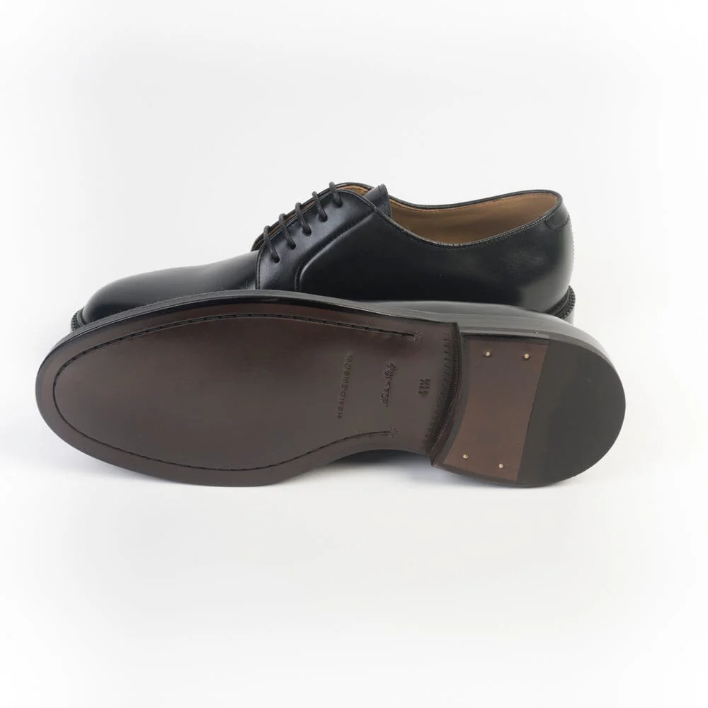 Scarpa derby foderata di Henderson, realizzata in pelle di vitello liscio di colore nero. Lacci in cotone cerato in nuance, cinque fori. Suola in cuoio. Tacco 3 cm.