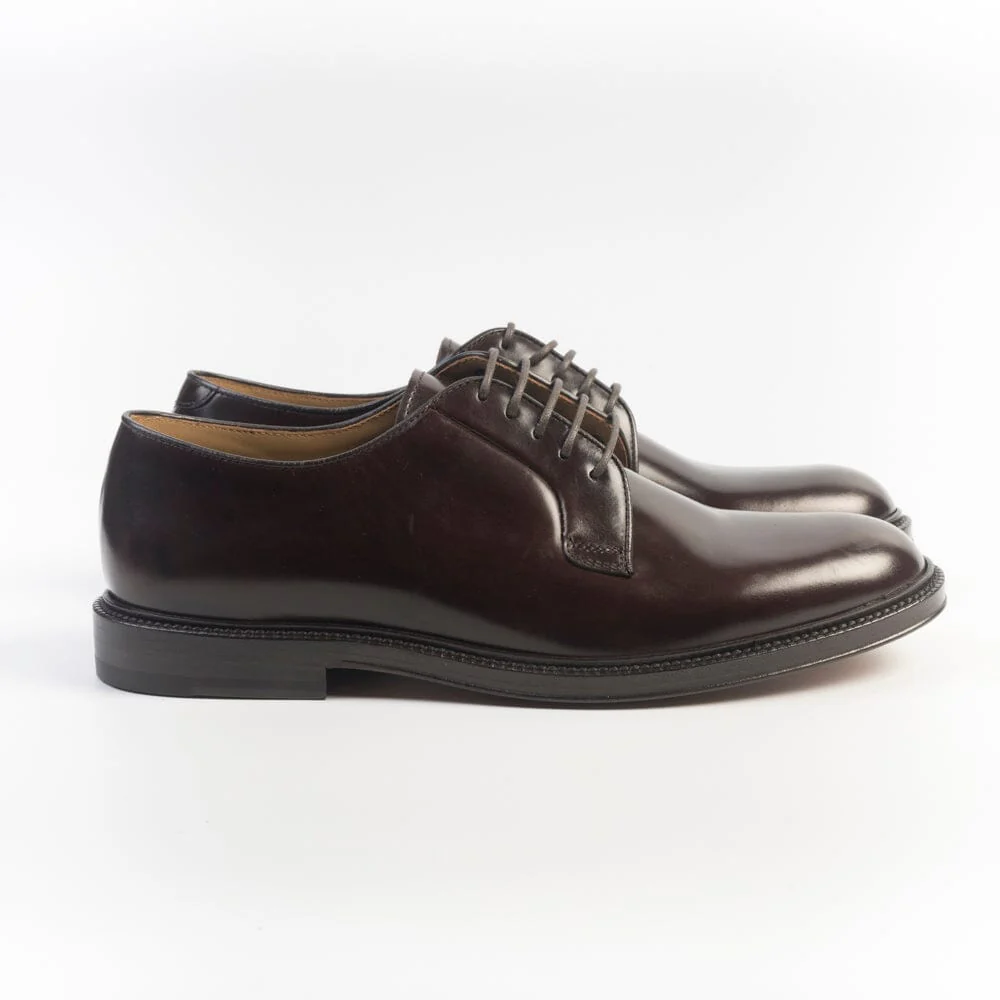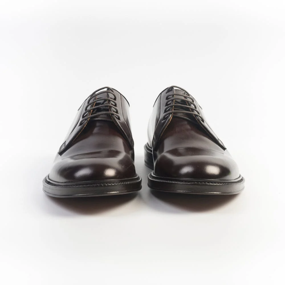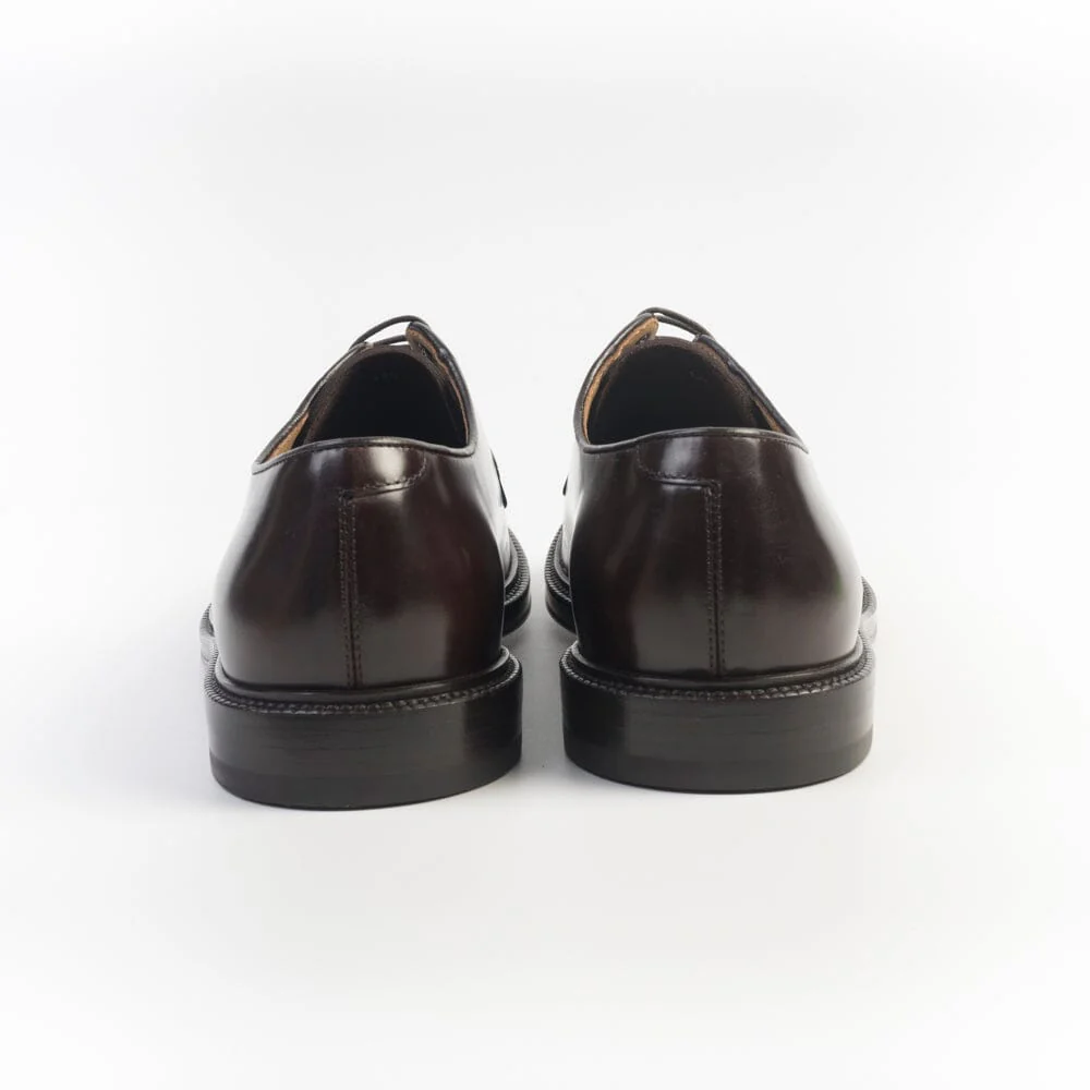 Scarpa derby foderata di Henderson, realizzata in pelle di vitello liscio di colore testa di moro. Lacci in cotone cerato in nuance, cinque fori. Suola in cuoio. Tacco 3 cm.