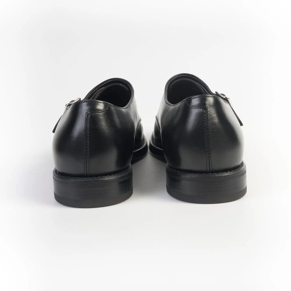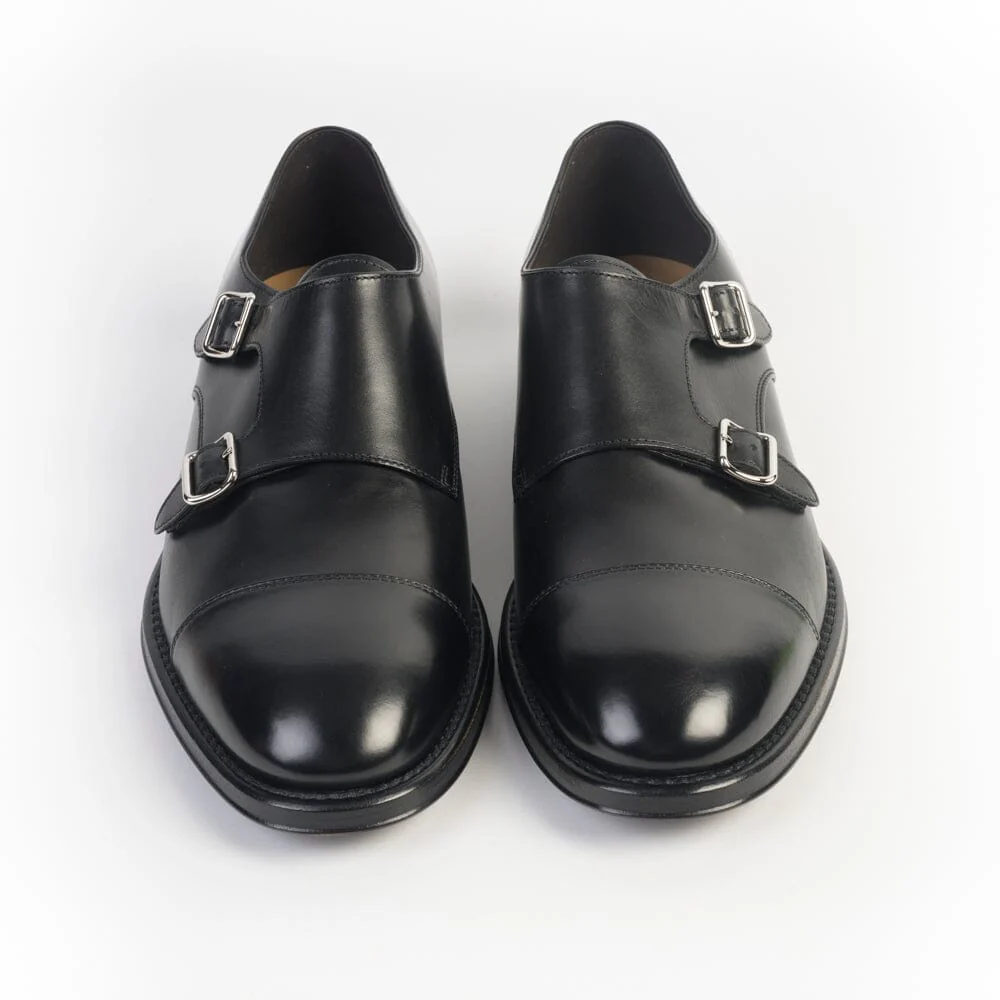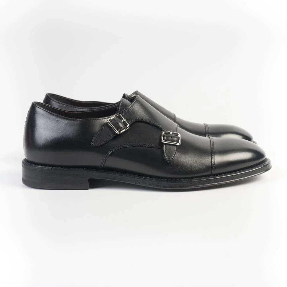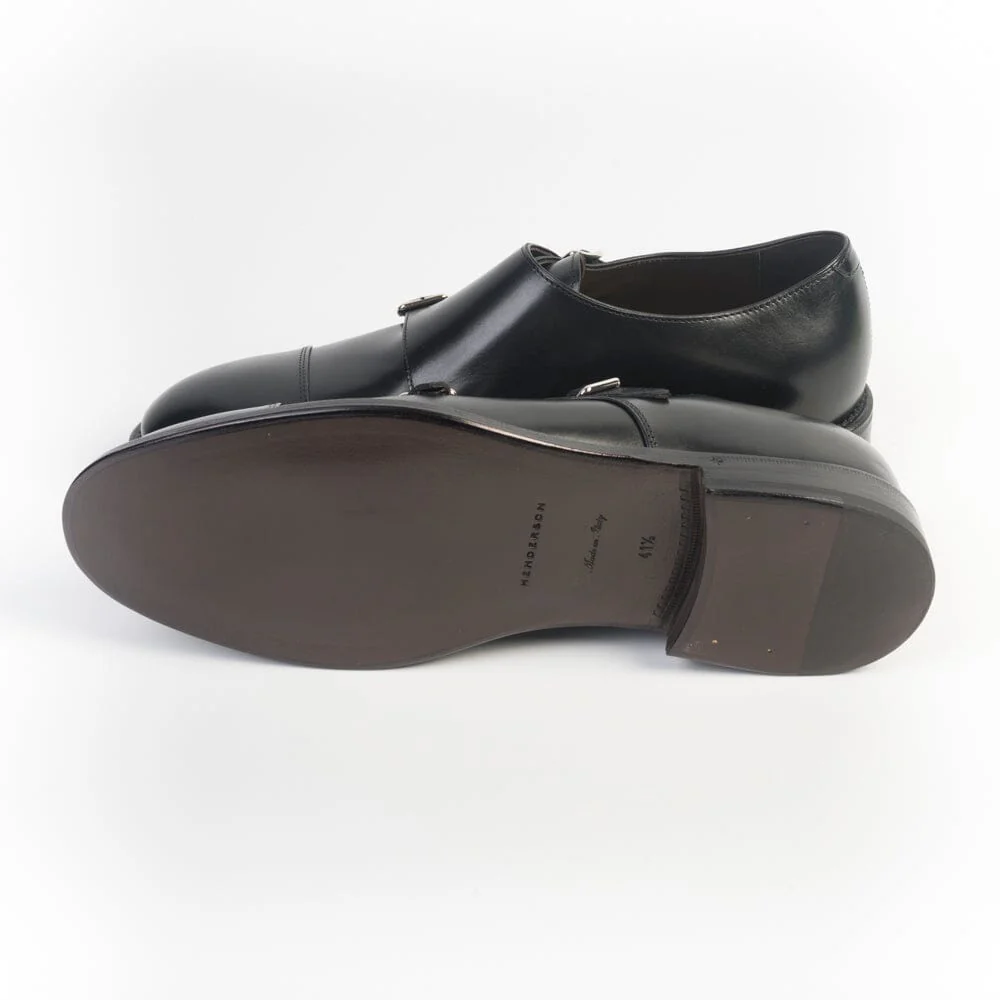 Doppia fibbia con puntale, di Henderson, realizzata in pelle di vitello liscio di colore nero. Suola in cuoio e gomma. Tacco 3 cm circa.