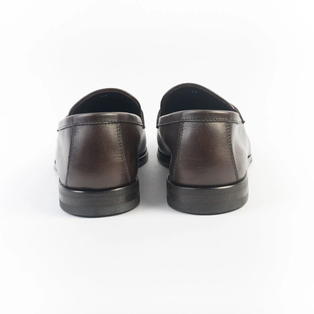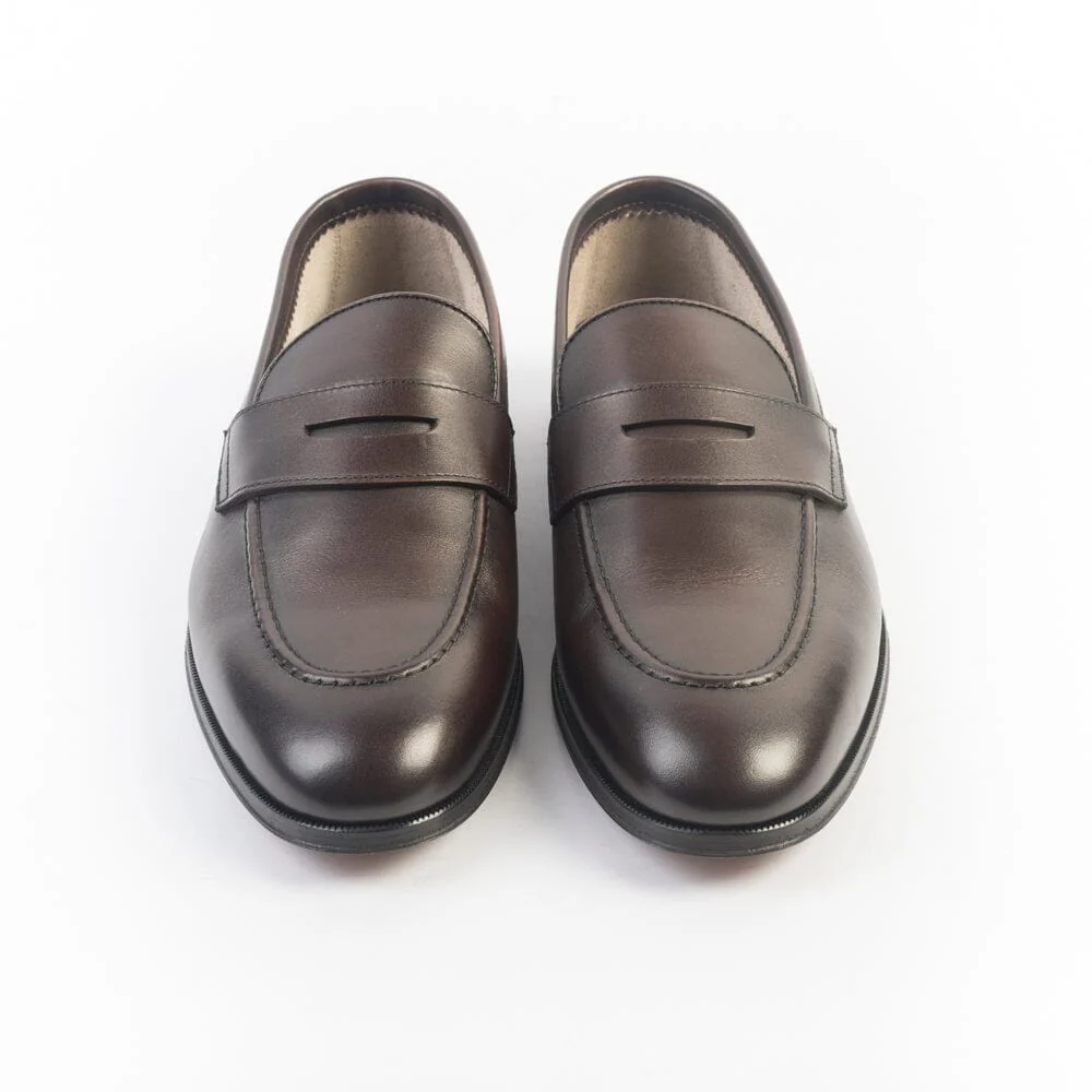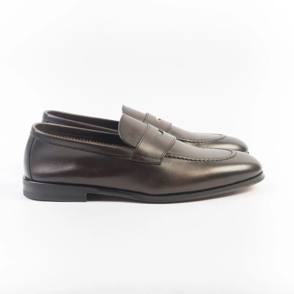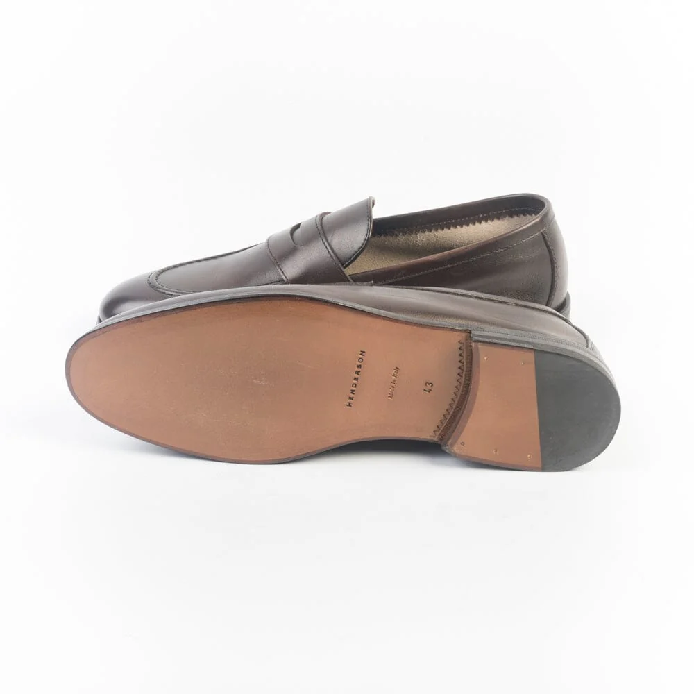 Classico mocassino con mascherina di Henderson dalla punta affusolata, realizzato in pelle di vitello di colore marrone con effetti anticati, interno foderato in punta. Suola in cuoio.