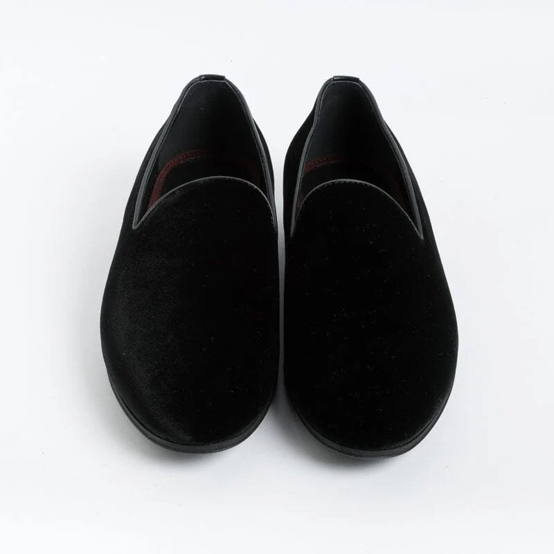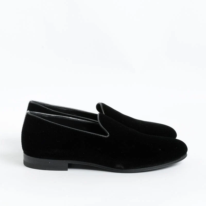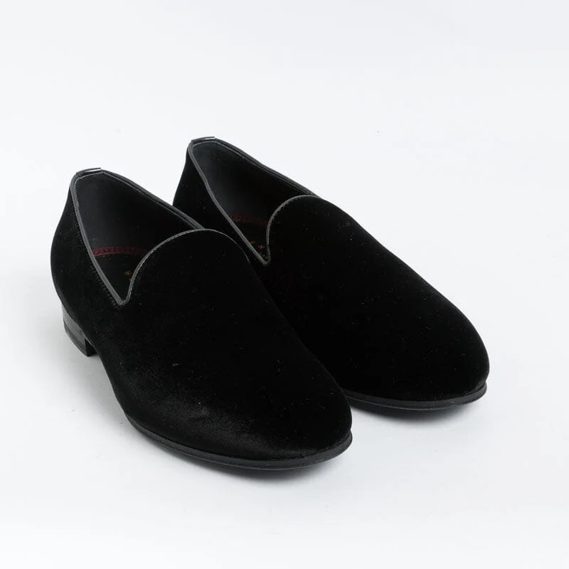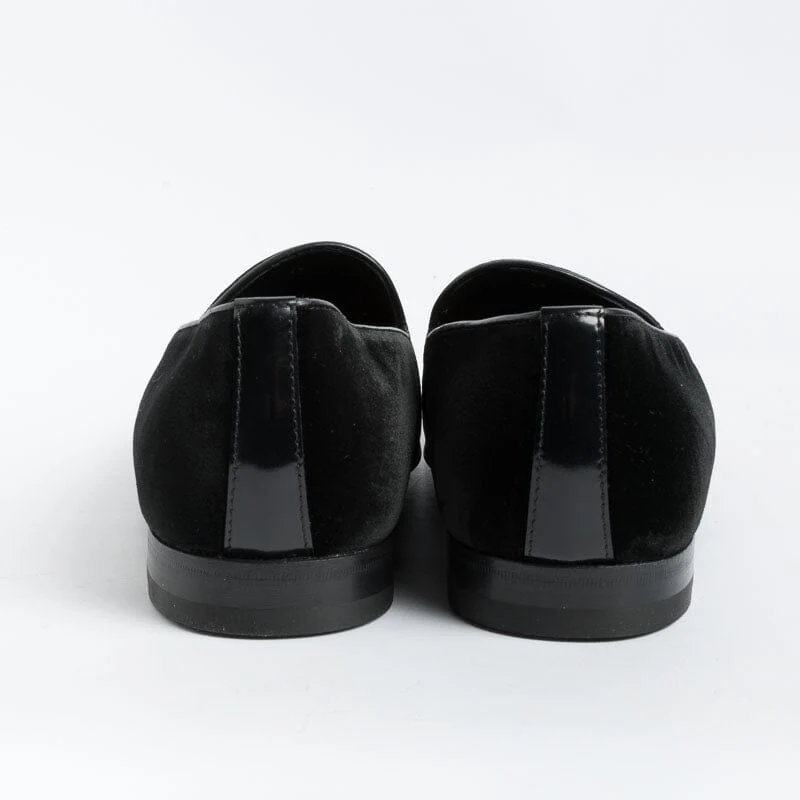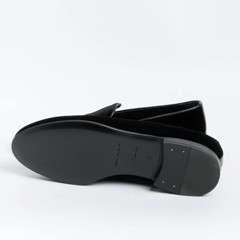 Mocassino modello Casinò di Henderson realizzato in esclusiva per CappellettopShop in morbido velluto di colore nero con piping in vera pelle, in nuance. Deattaglio tallone in vernice nera. Interno foderato in pelle. Suola in cuoio.