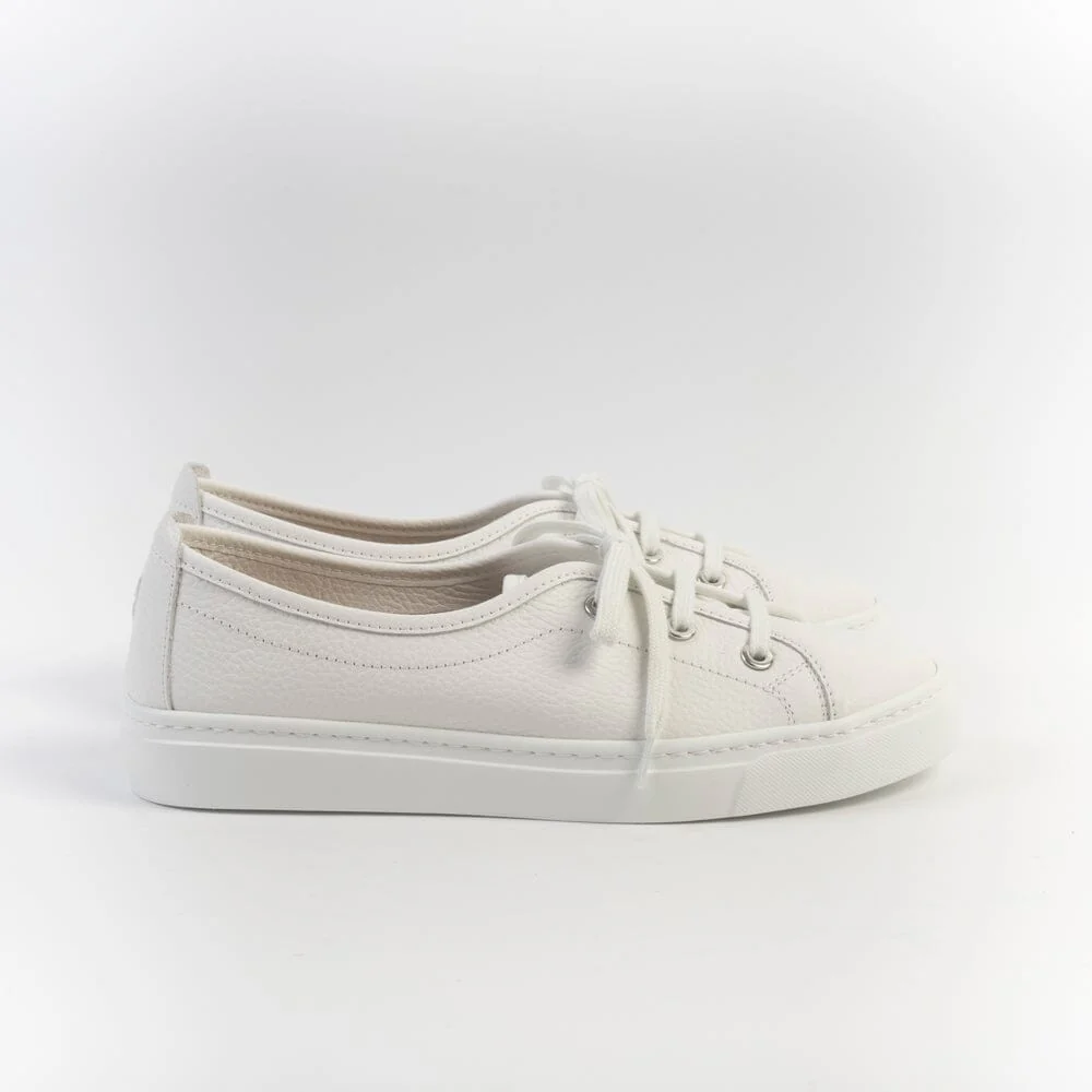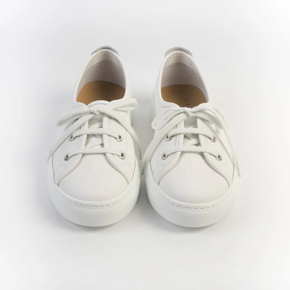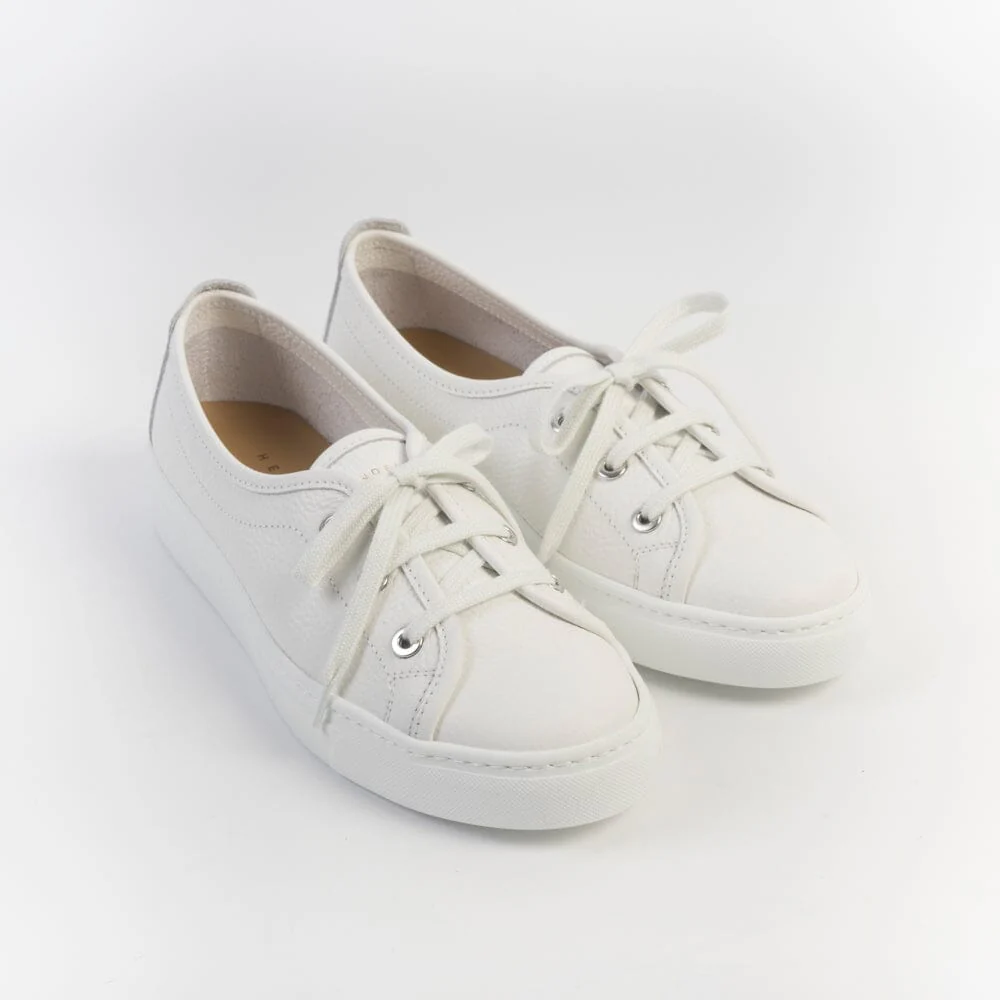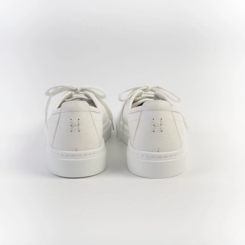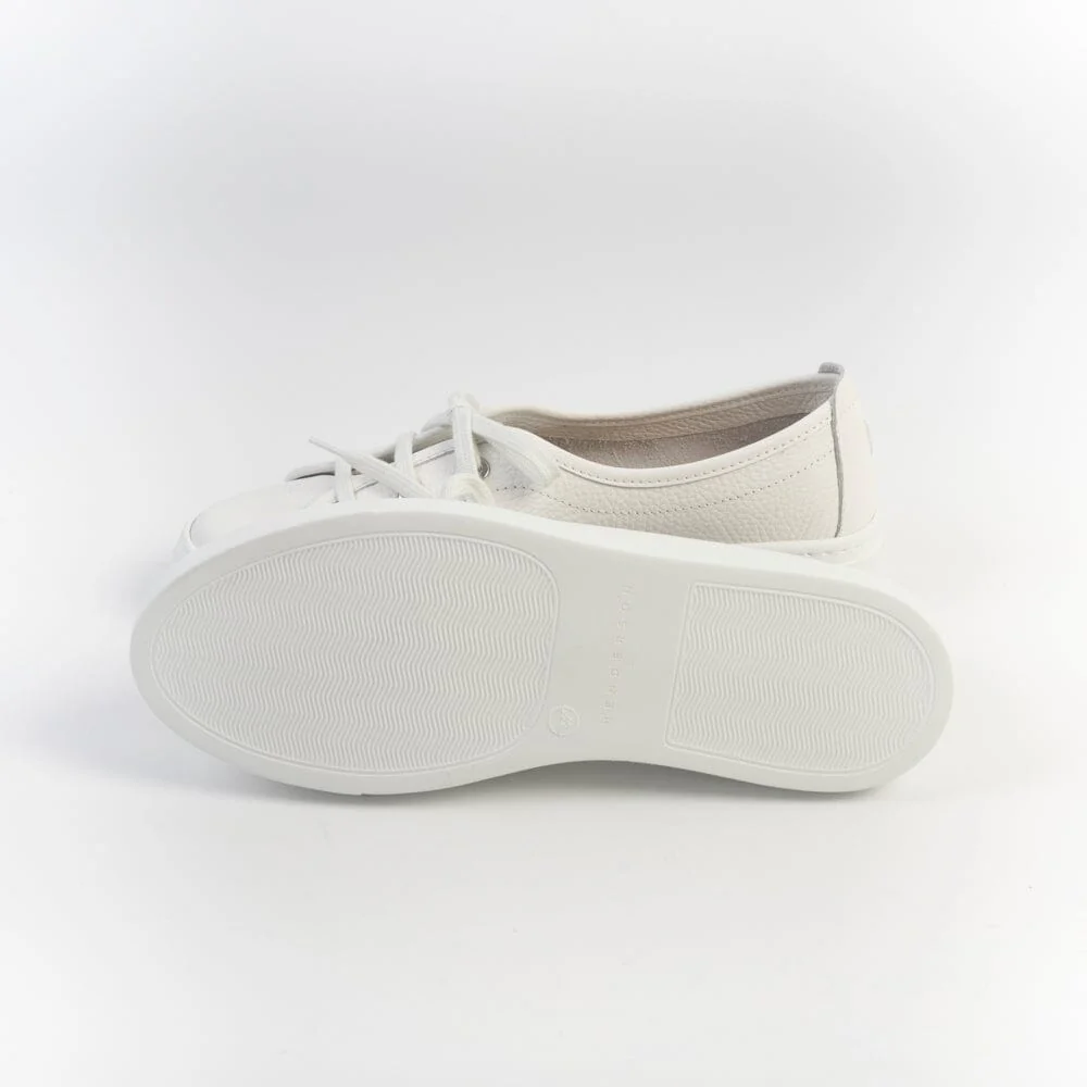Sneakers leggerissime di Henderson realizzate in morbida pelle martellata di colore bianco, con preziosi dettagli di lavorazione artigianale. Interno sfoderato. Dettaglio logo cucito con filo in nuance su tallone. Lacci in cotone in nuance. Plantare interno in pelle removibile. Fondo a cassetta di 2 cm circa.