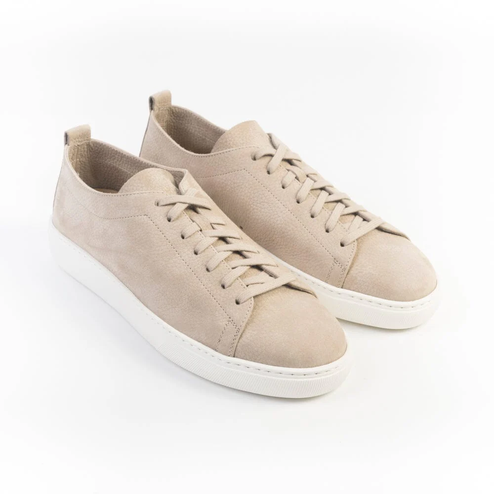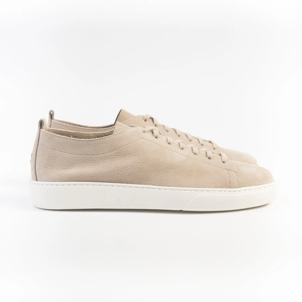 Sneakers di Henderson realizzate in pregiata pelle nabuk di colore beige con effetto martellato. Interno sfoderato. Dettaglio logo cucito con filo in nuance su tallone. Lacci in cotone di colore marrone. Plantare interno in pelle removibile. Fondo a cassetta di 2 cm circa di colore bianco. Suola in gomma con logo stampato in contrasto.