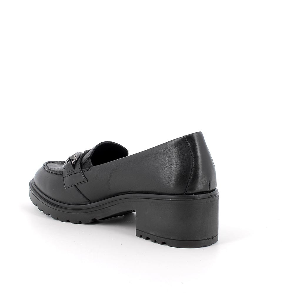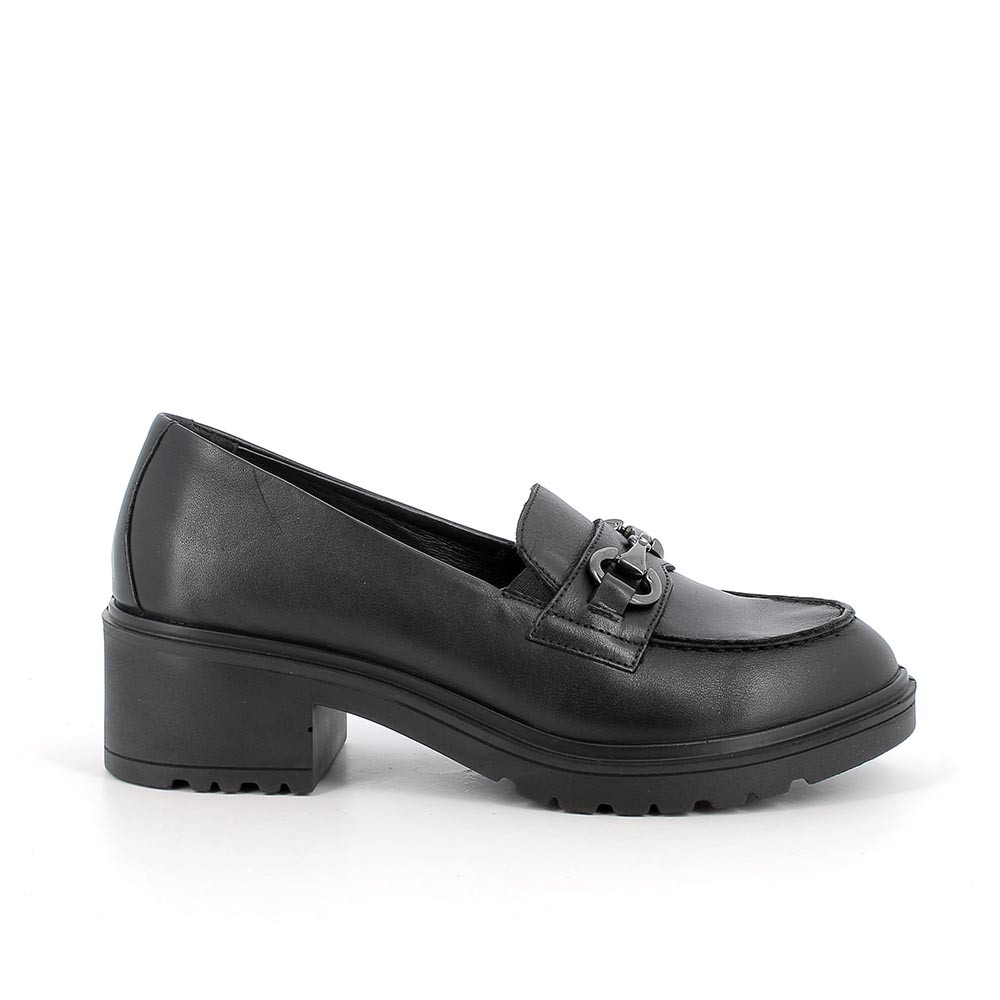 Mocassino in pelle, con tacco. Elastici per facilitare la calzata. Vaschetta e morsetto ornamentale. Adatto ad ogni occasione, con gonna o pantaloni. Sottopiede estraibile in pelle.